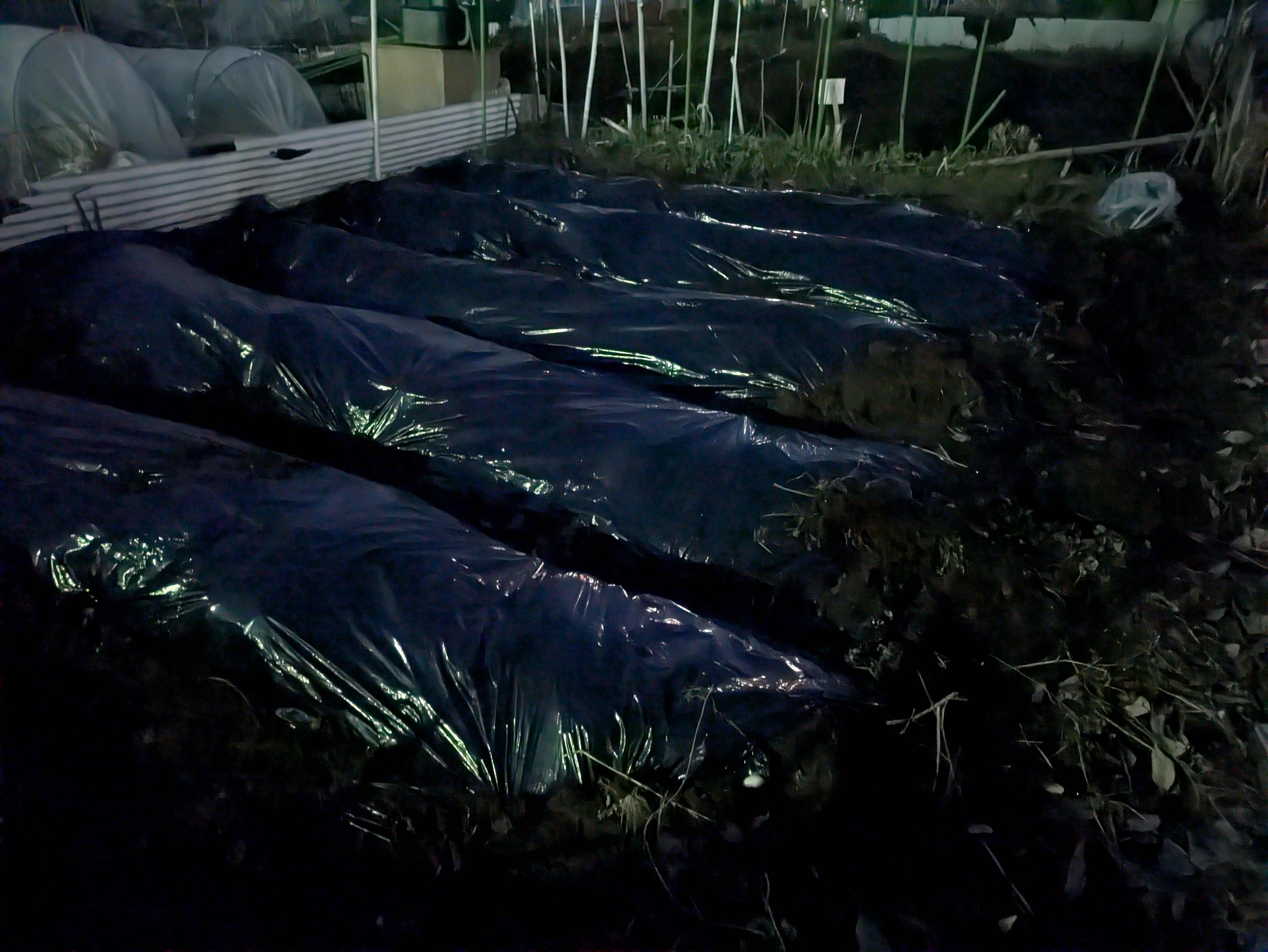 雑草だらけの畑の荒れ地の開墾をしました。鍬を入れて牛糞堆肥を120リットル入れました。土壌消毒を兼ねて黒マルチを貼ったら夜になりました😂