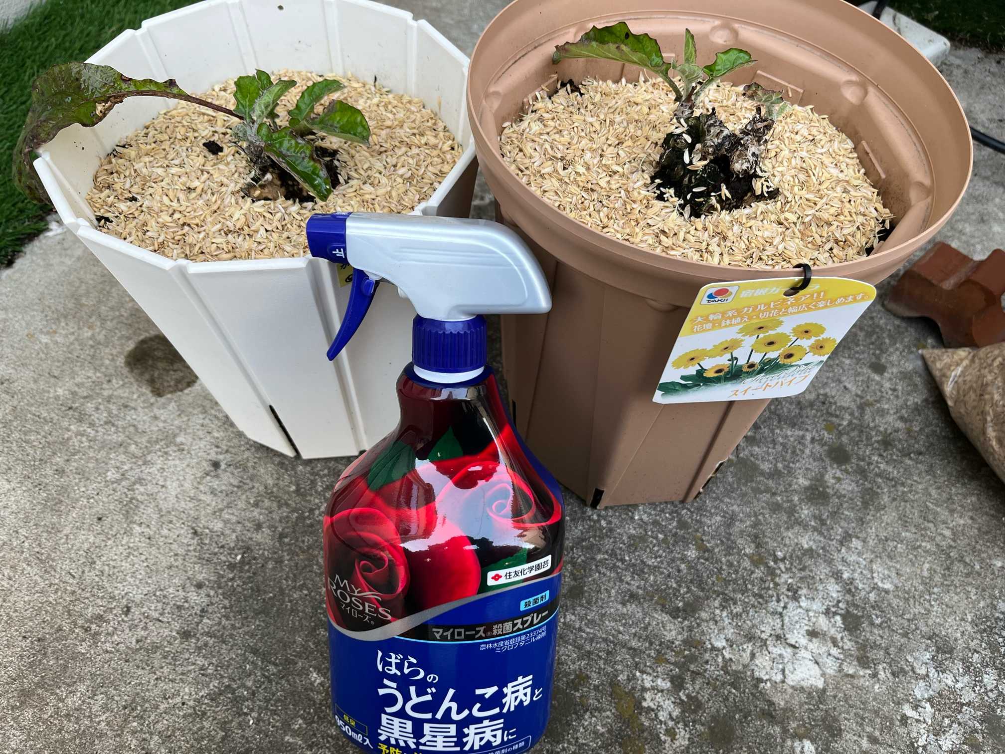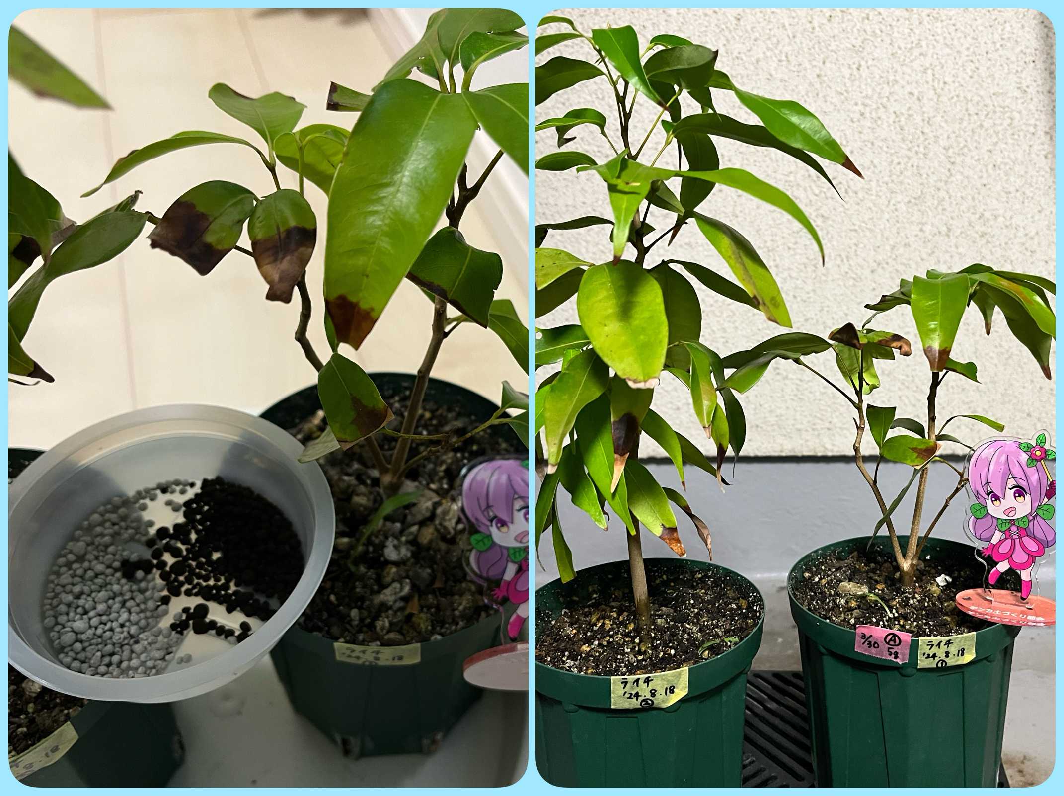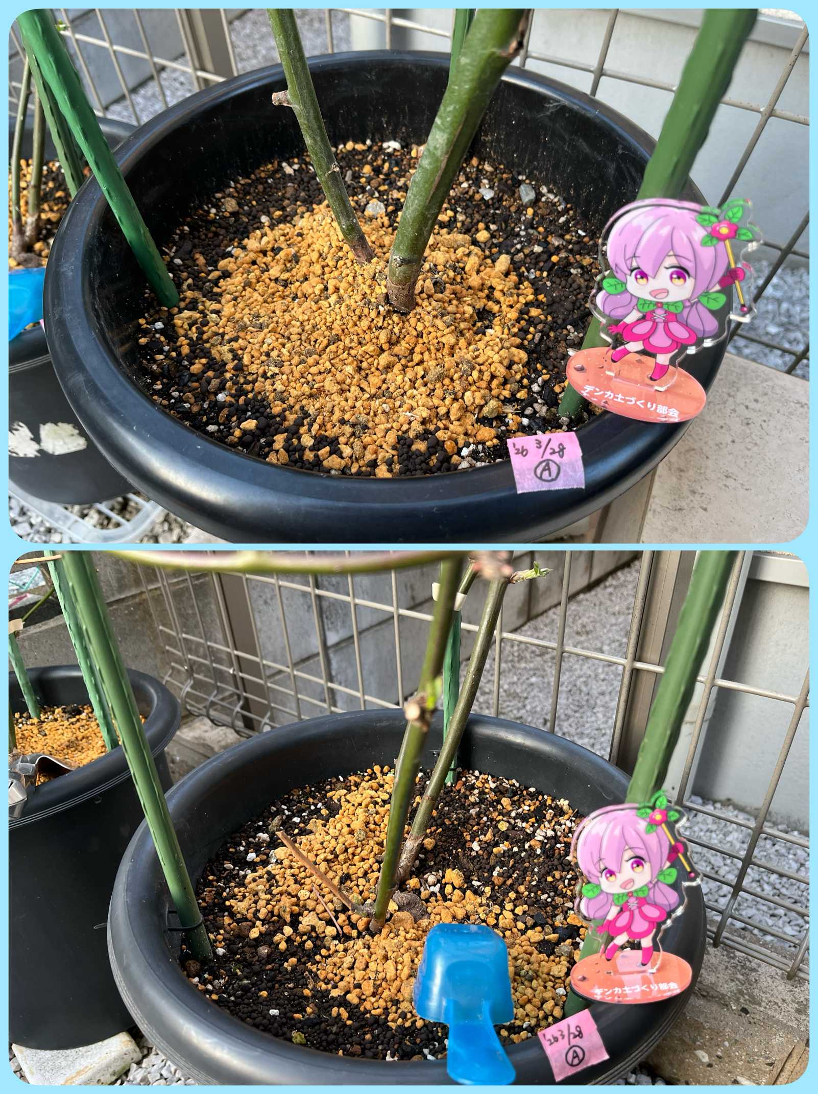 ①②両鉢に化成肥料5g追肥、併せて①の鉢に🟪アヅミン5gを表土に混和