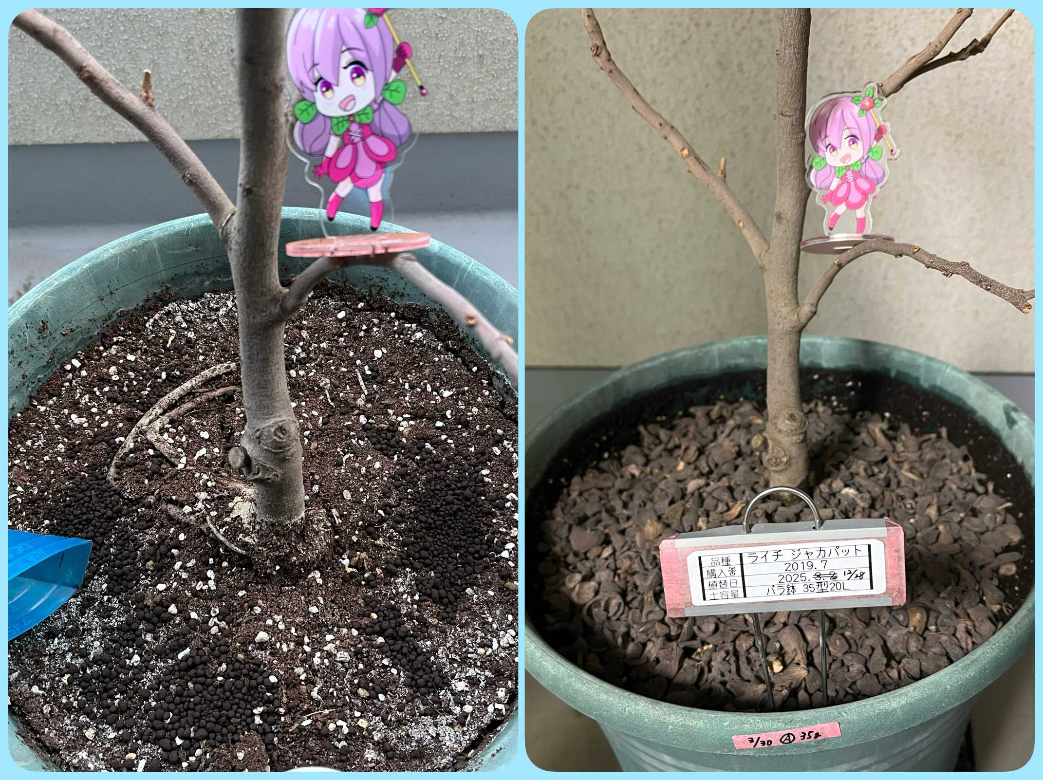 緩効性化成肥料10g、🟪アヅミン15gを新しい培養土に混和、根鉢を囲むように入れました