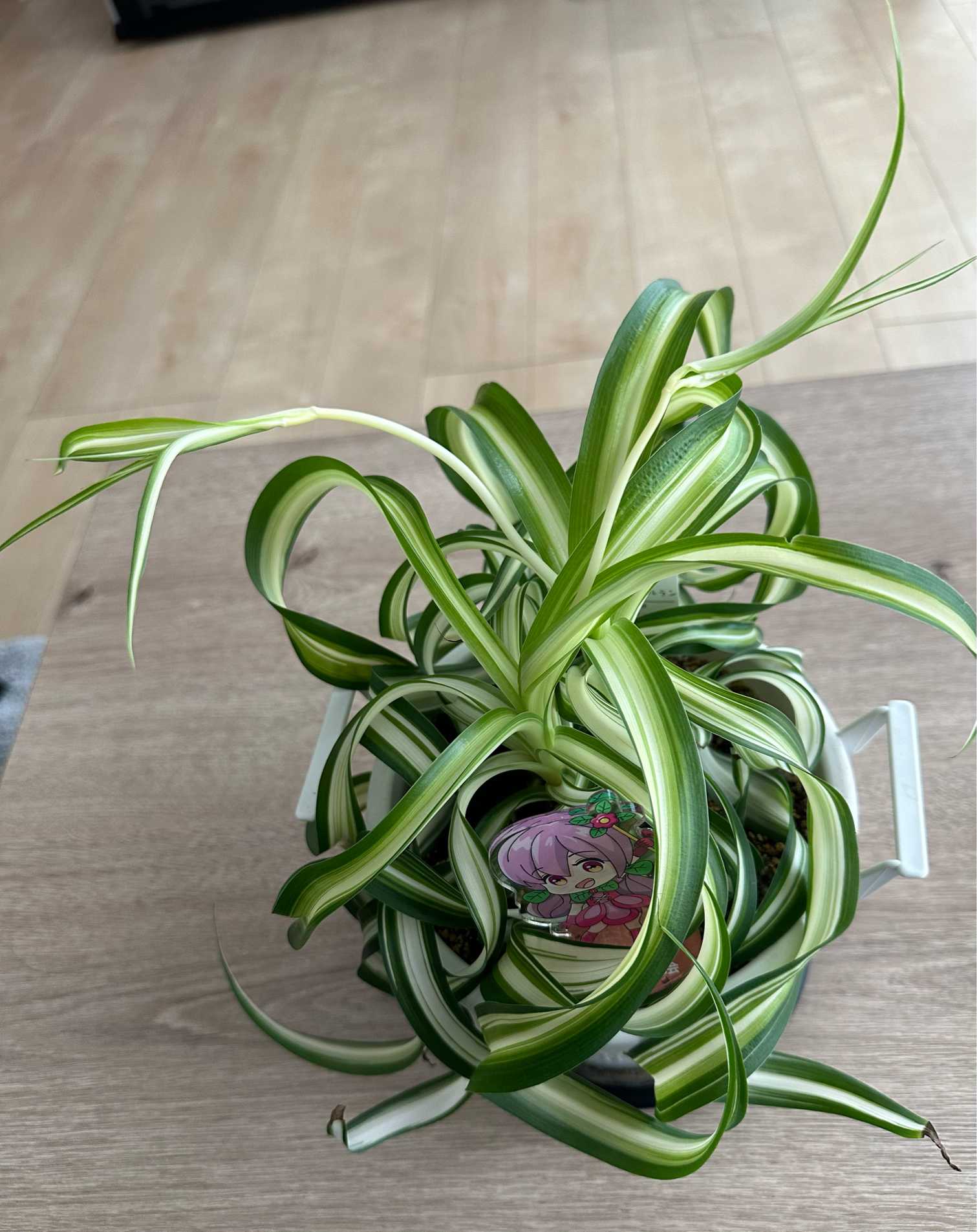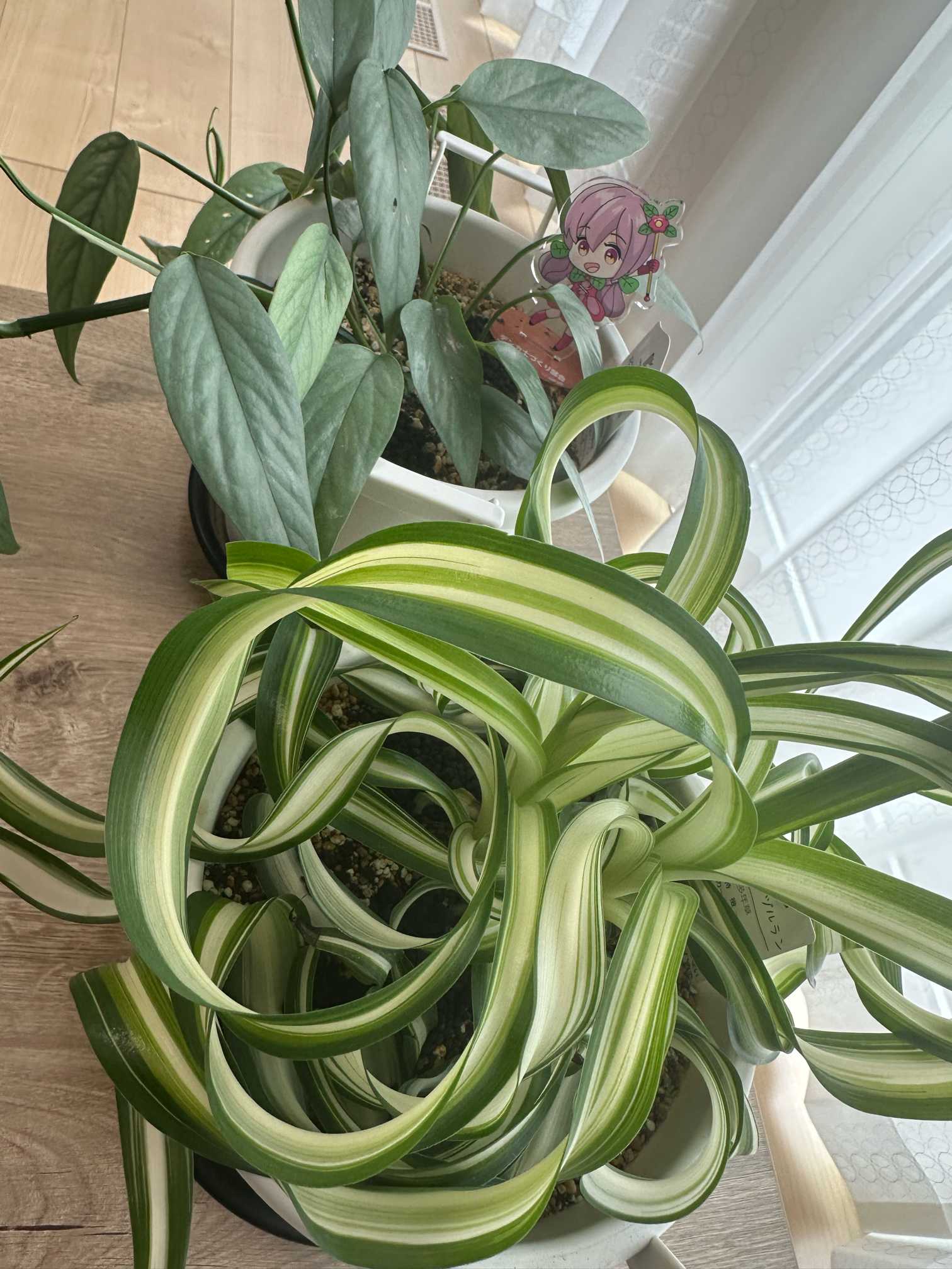 エピプレムナム セブブルー(奥)への追肥とオリヅルラン ボニー(手前)への追肥、各々一株につきアヅミンの量をスプーン一杯をパラパラと振りました。勿論、水管理も行って。