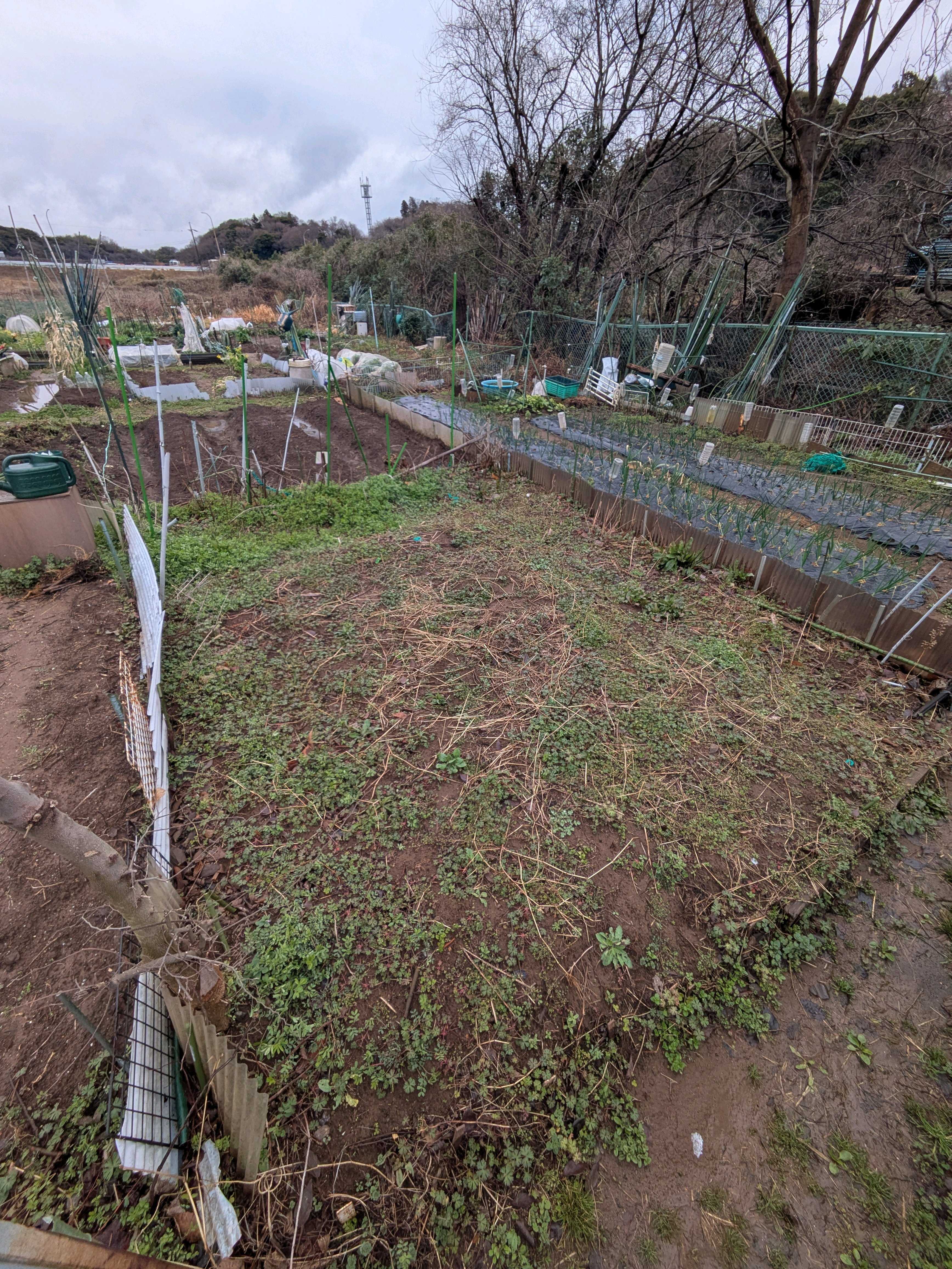 2月27日 菌ちゃん畝①西側半分を更新しました。剪定枝と土を積み、雑草で覆いました。2023年に畝上げし、トマト、ナスなどを育て、2024はそら豆を育てました。2025年に更新し、マルチをはずしてそら豆、ブロッコリーが順調に育ちました、