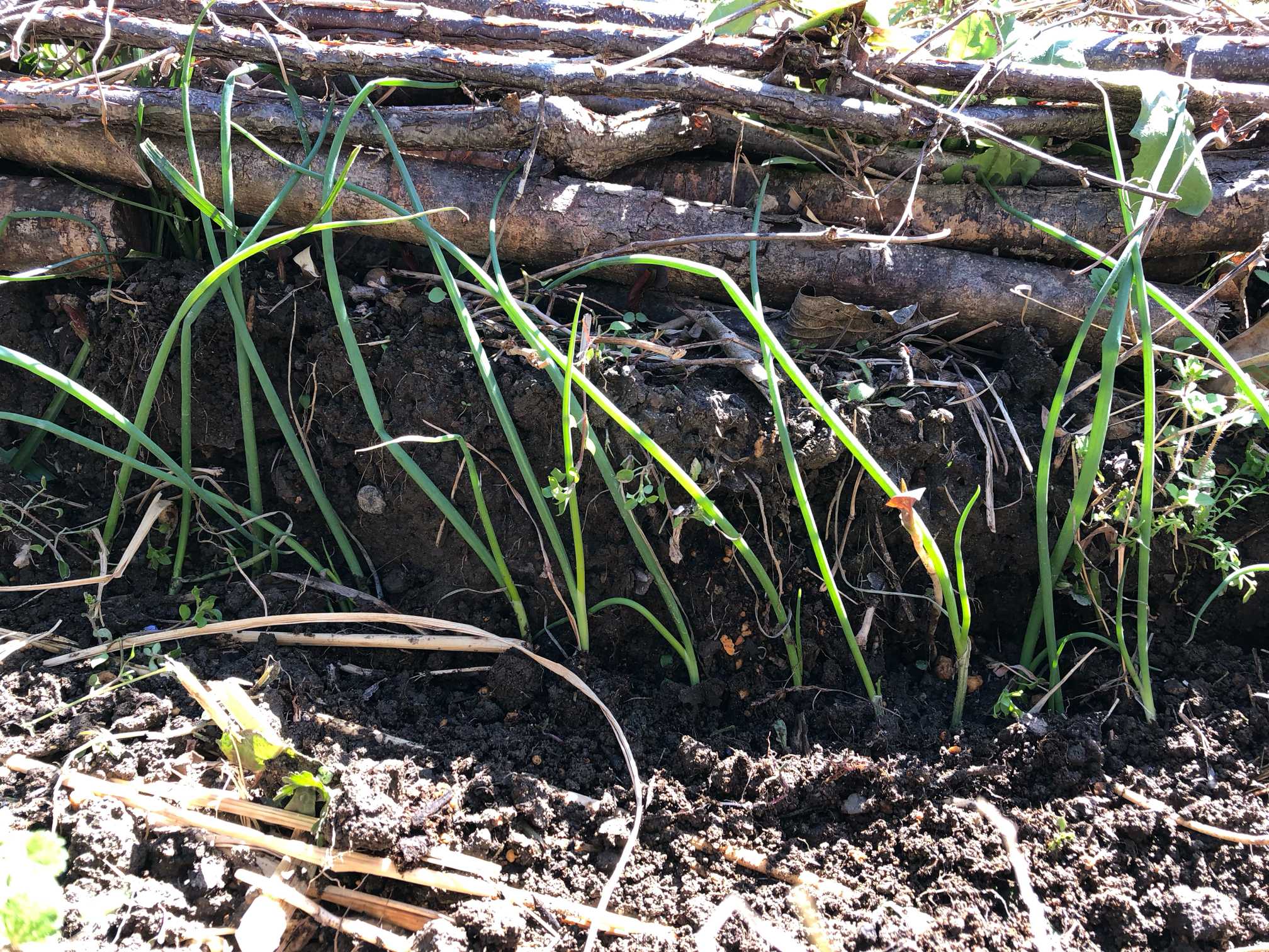 3月6日 北側の花壇に深谷ねぎの苗を植えました。剪定した小枝を積み上げたエリアで、小枝に微生物が宿り、周囲の土がフカフカになっています。30センチほど掘り、深谷ねぎの苗を並べました。わらをかぶせ、土を薄くかぶせています。