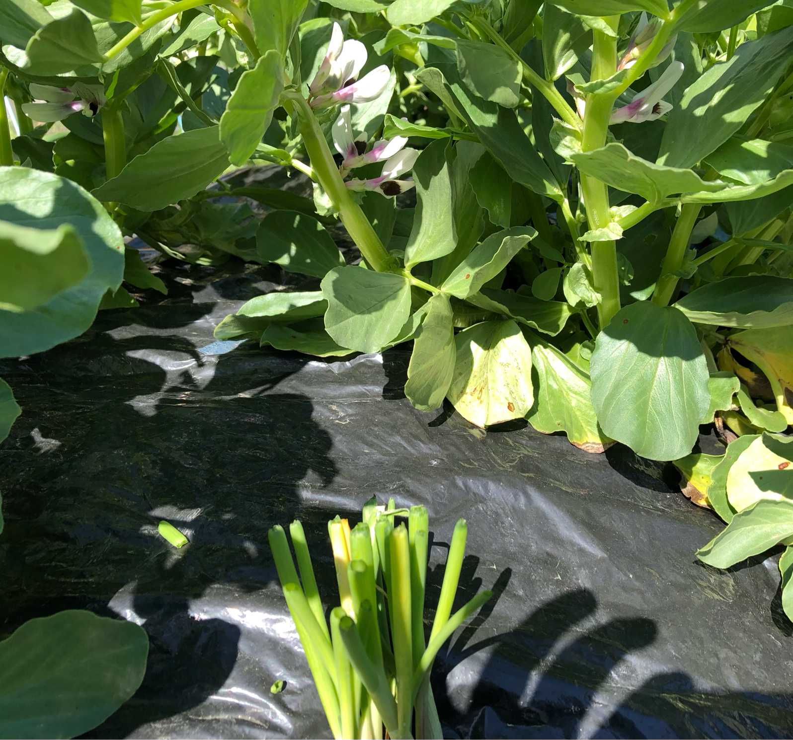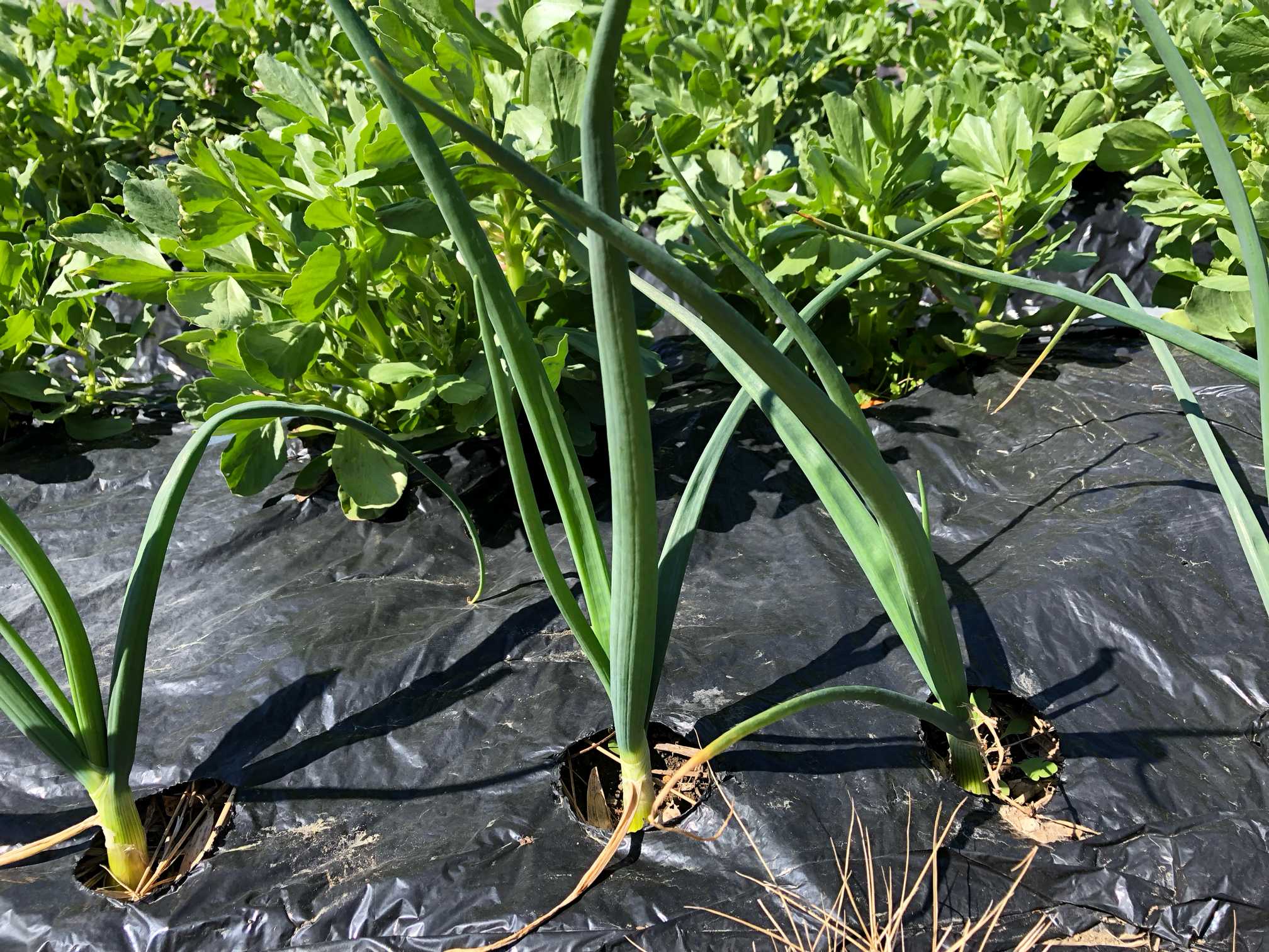菌ちゃん畝②には、そら豆と玉ねぎを混植して順調に育っています。虫被害が軽減されるはずです。