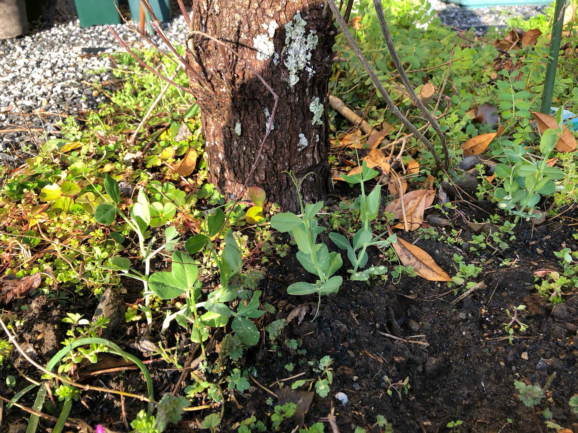 枯れ木の周りにつるなしスナップエンドウを植えました。多少つるが伸びても枯れ木が支柱になるかと思って。