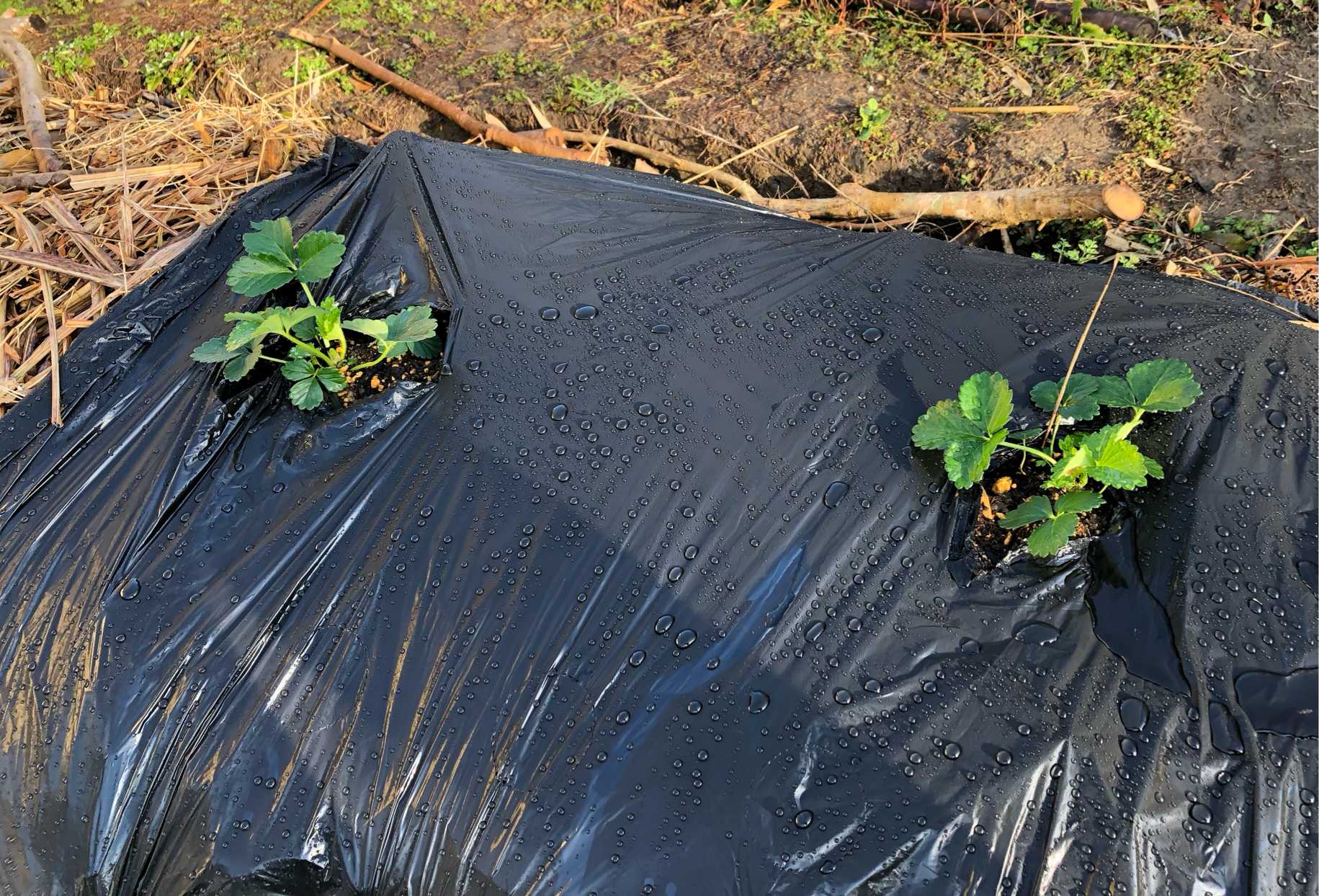 3月6日 菌ちゃん畝①の一部にビニールマルチをひいてイチゴ🍓苗を植えました。綺麗なイチゴがその場で食べられるように😍
