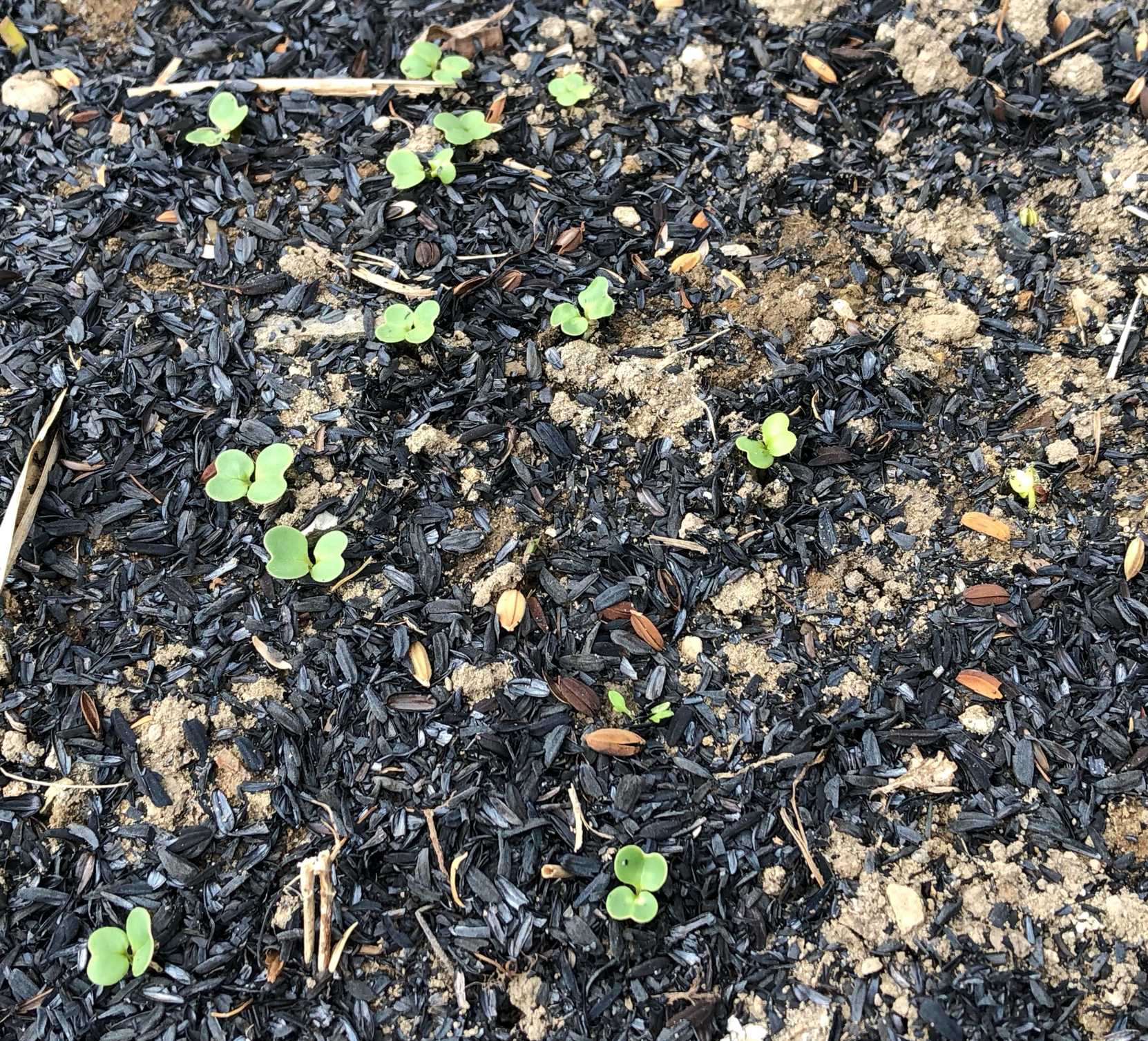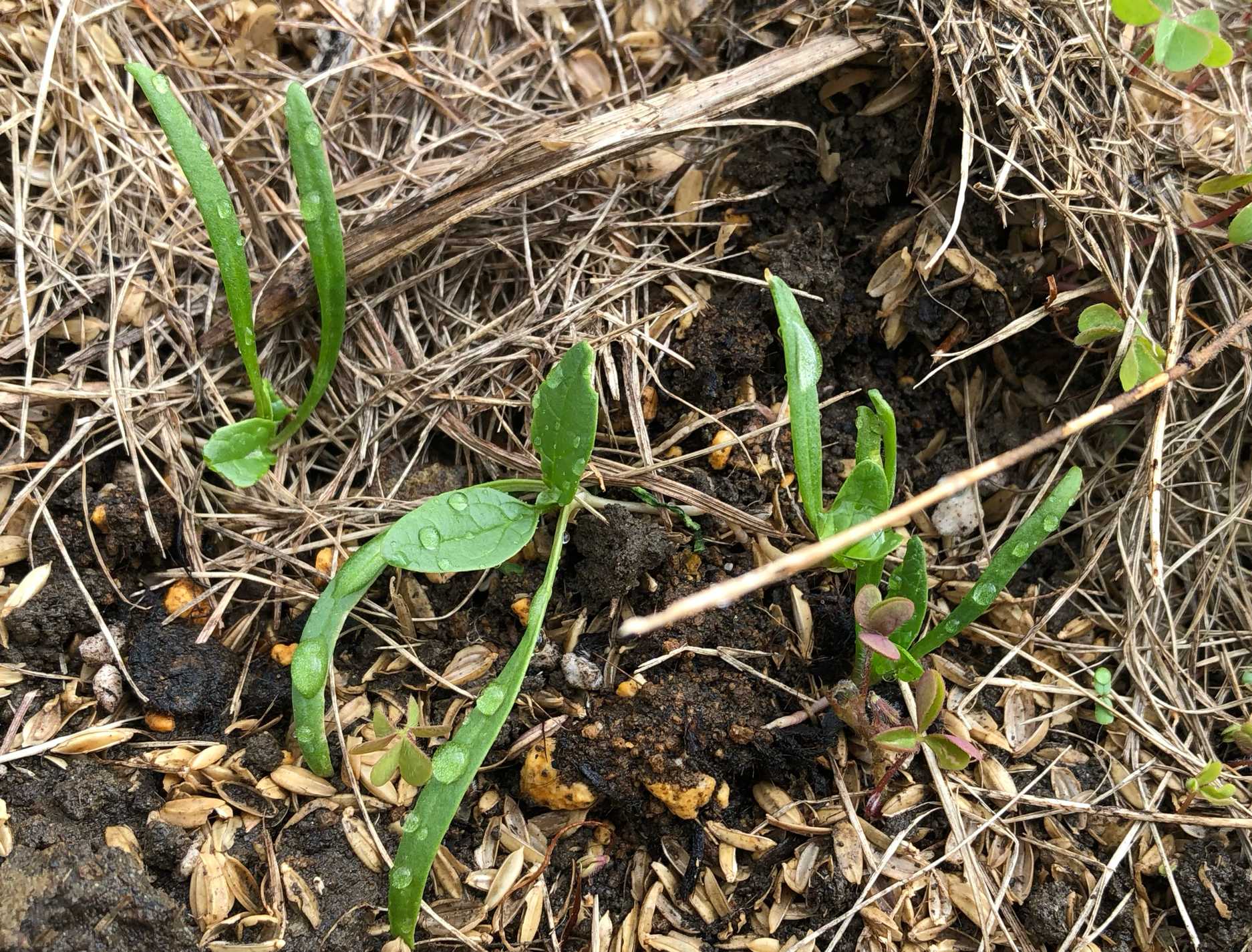 3月18日、菌ちゃん畝①の東側に撒いたコカブが発芽しました。