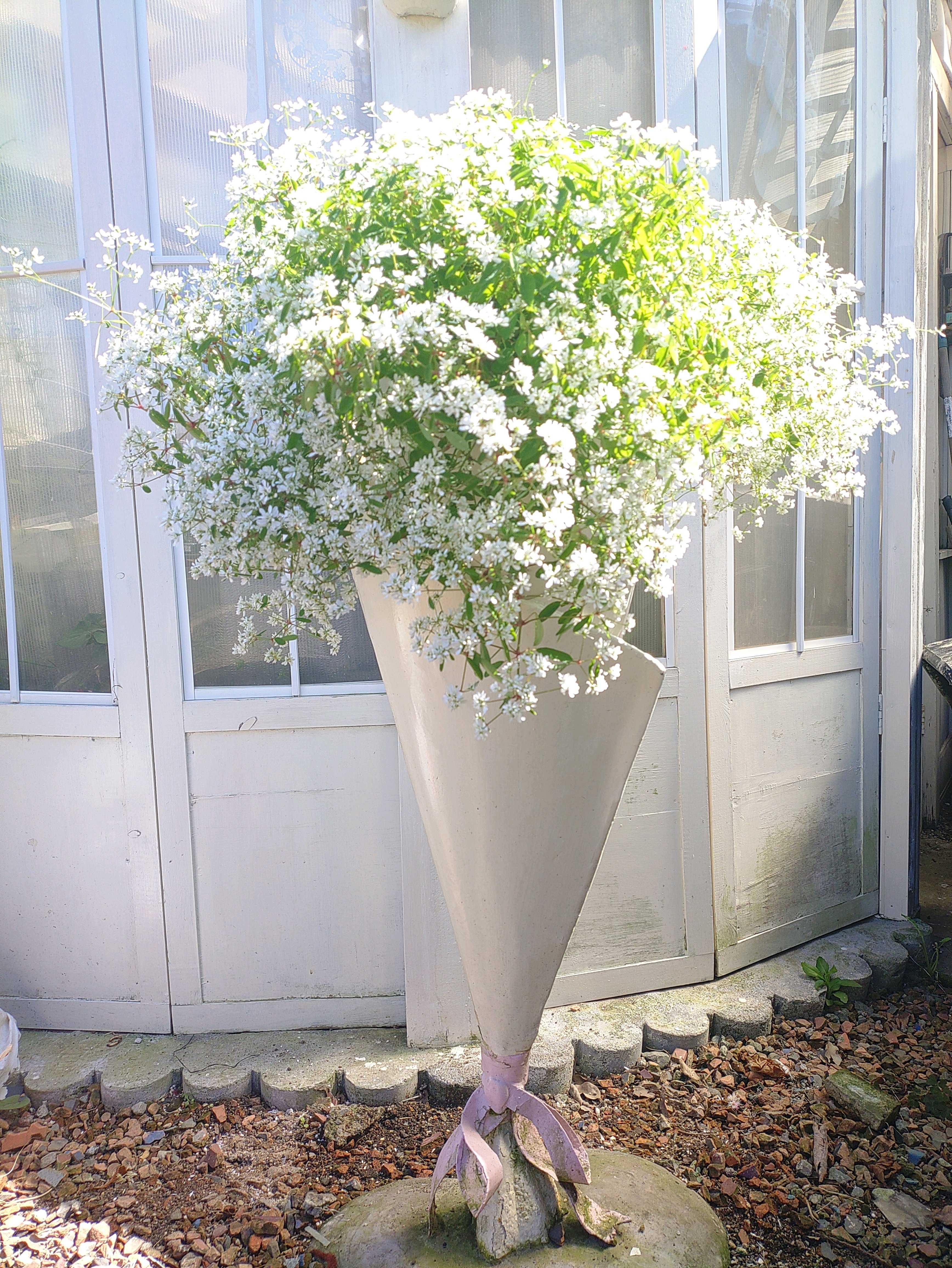 これは 外の庭に作ったブーケのフラワースタンドです。