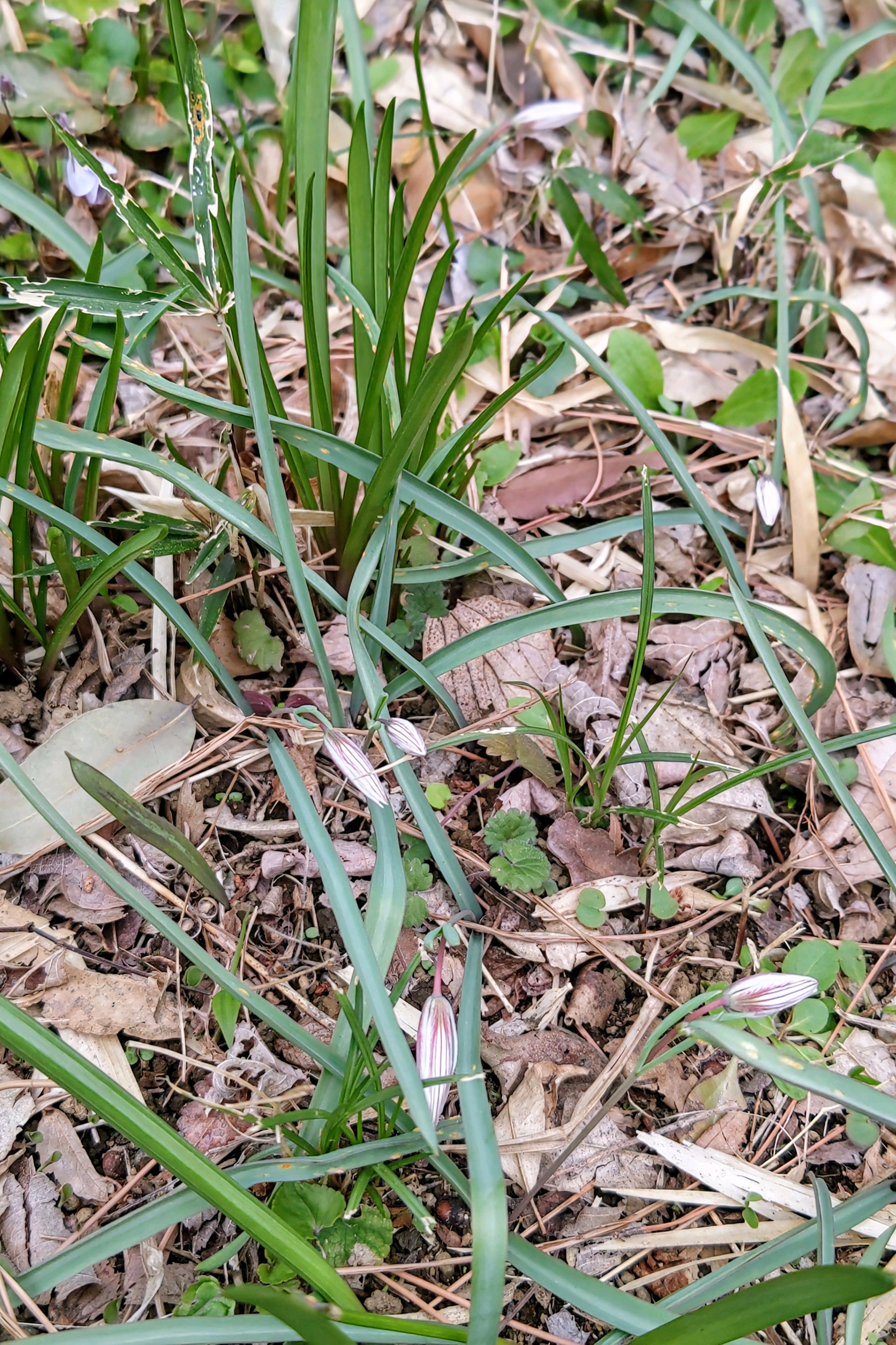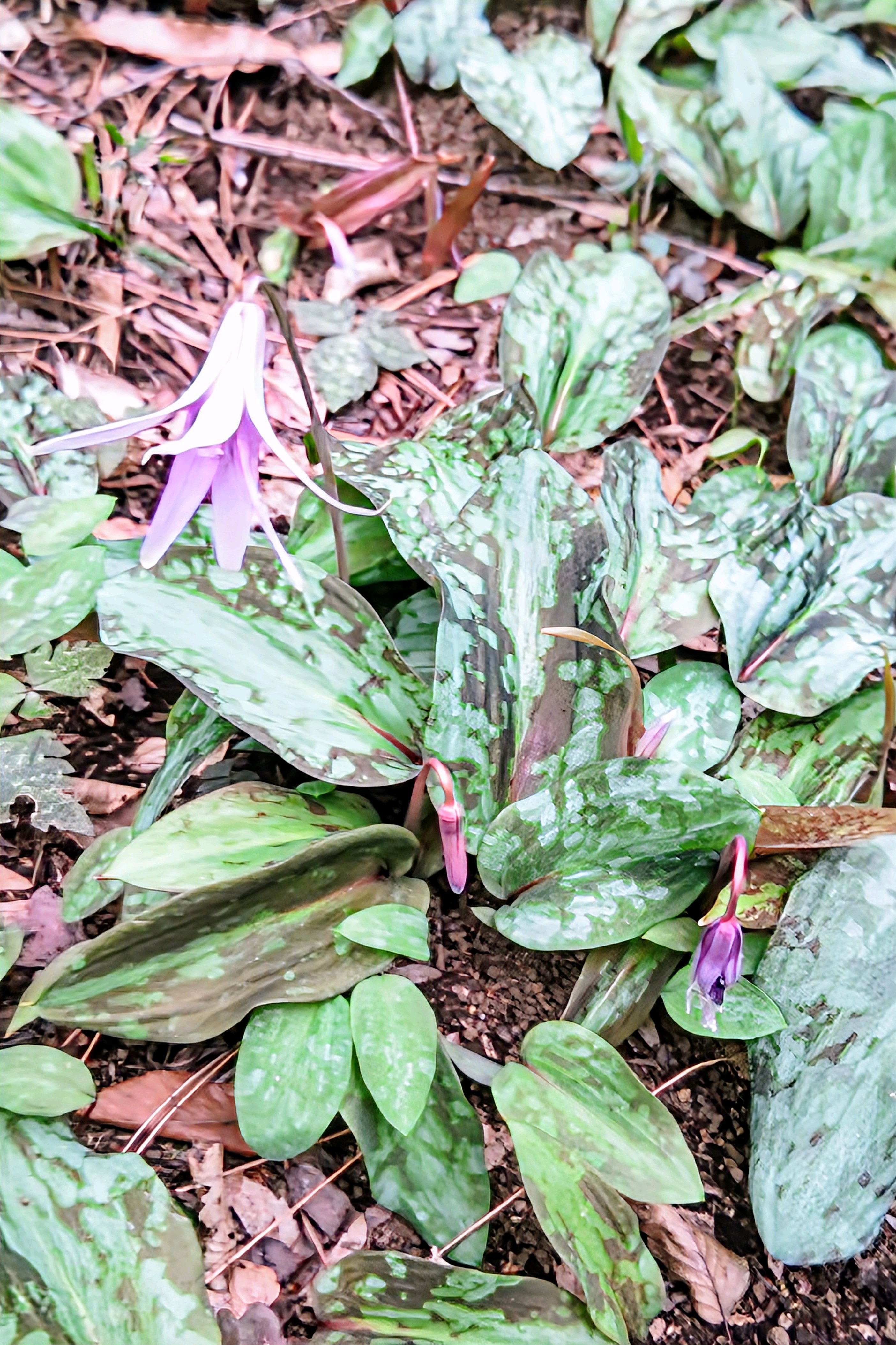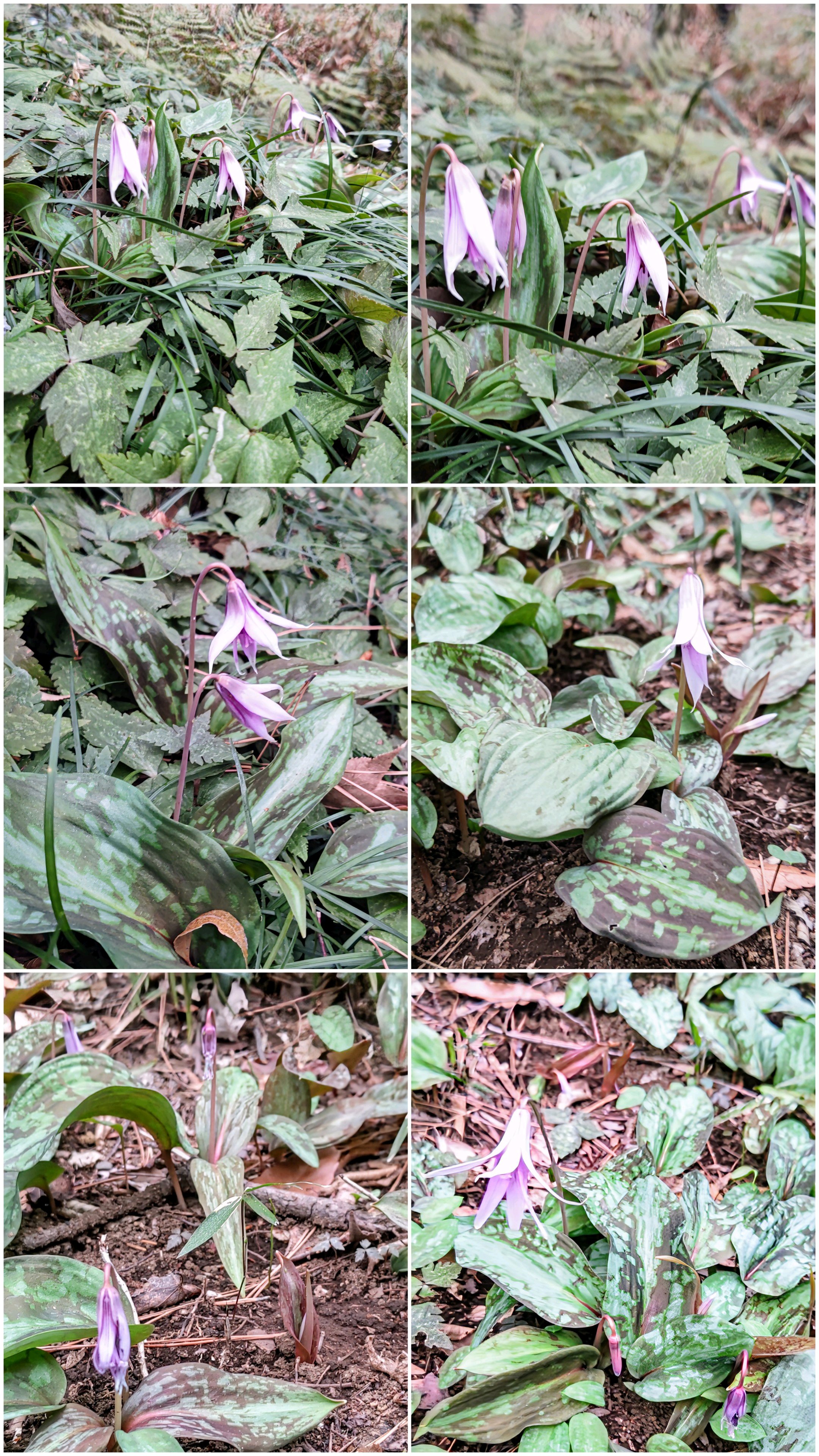 2/21の訪問時、バイモユリの芽の群生を見る。そろそろ開花かと訪問。夢のようなバイモの群生。曇り空の為、カタクリ、アマナは花びらを閉じていた。