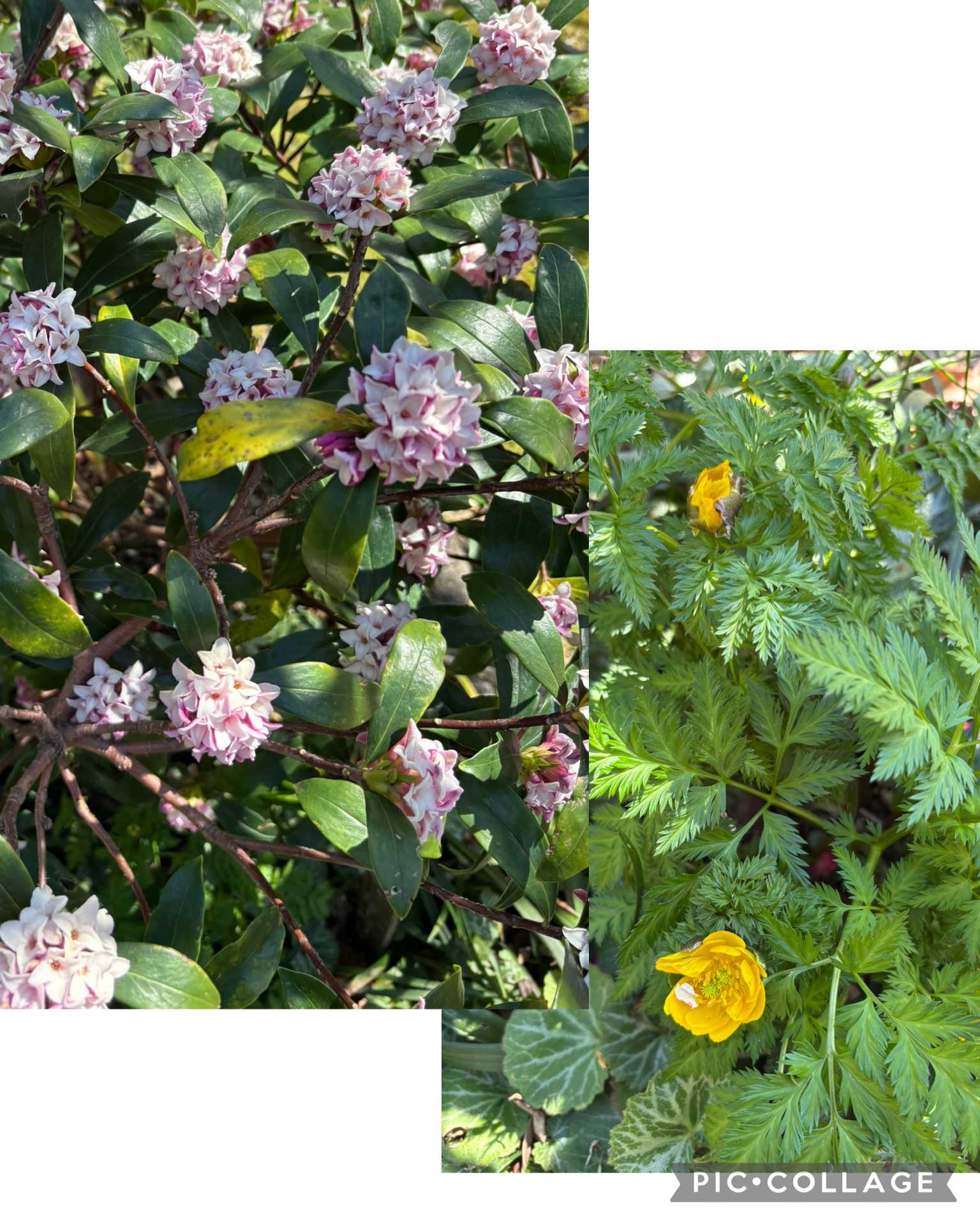 沈丁花の根本に草丈30cmの「福寿草」