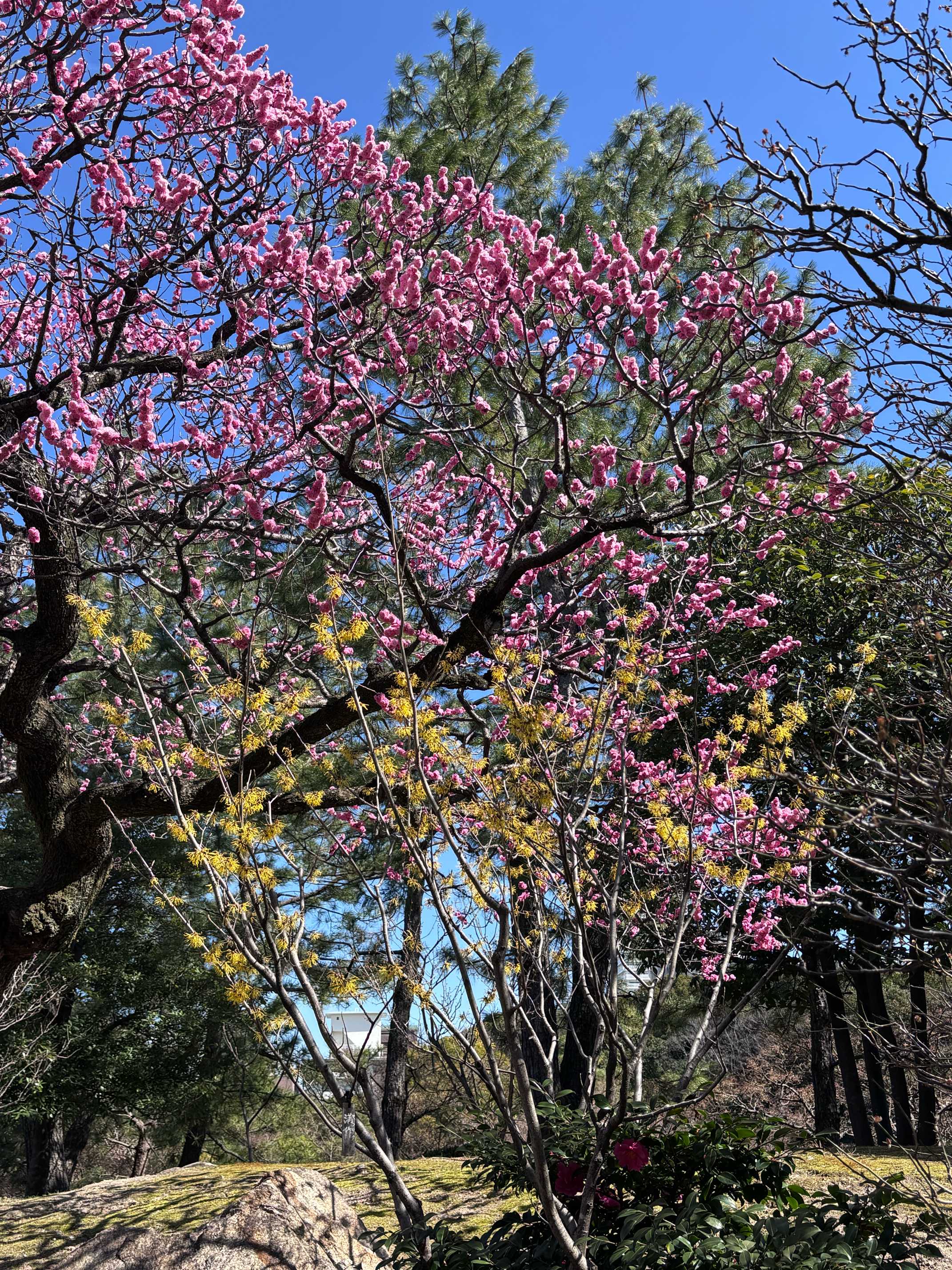 真っ赤な木瓜や枝ぶりのいい上品な梅が