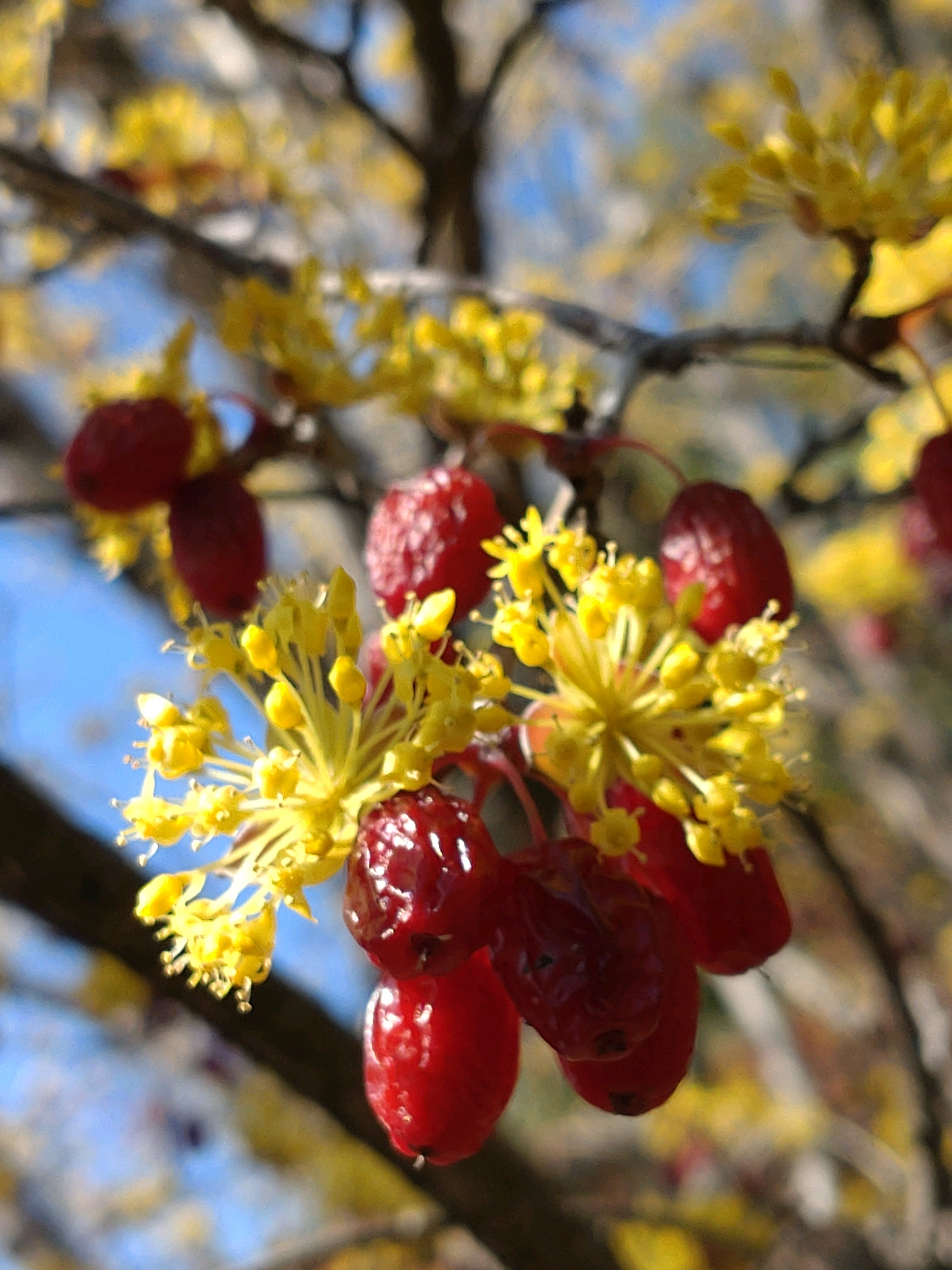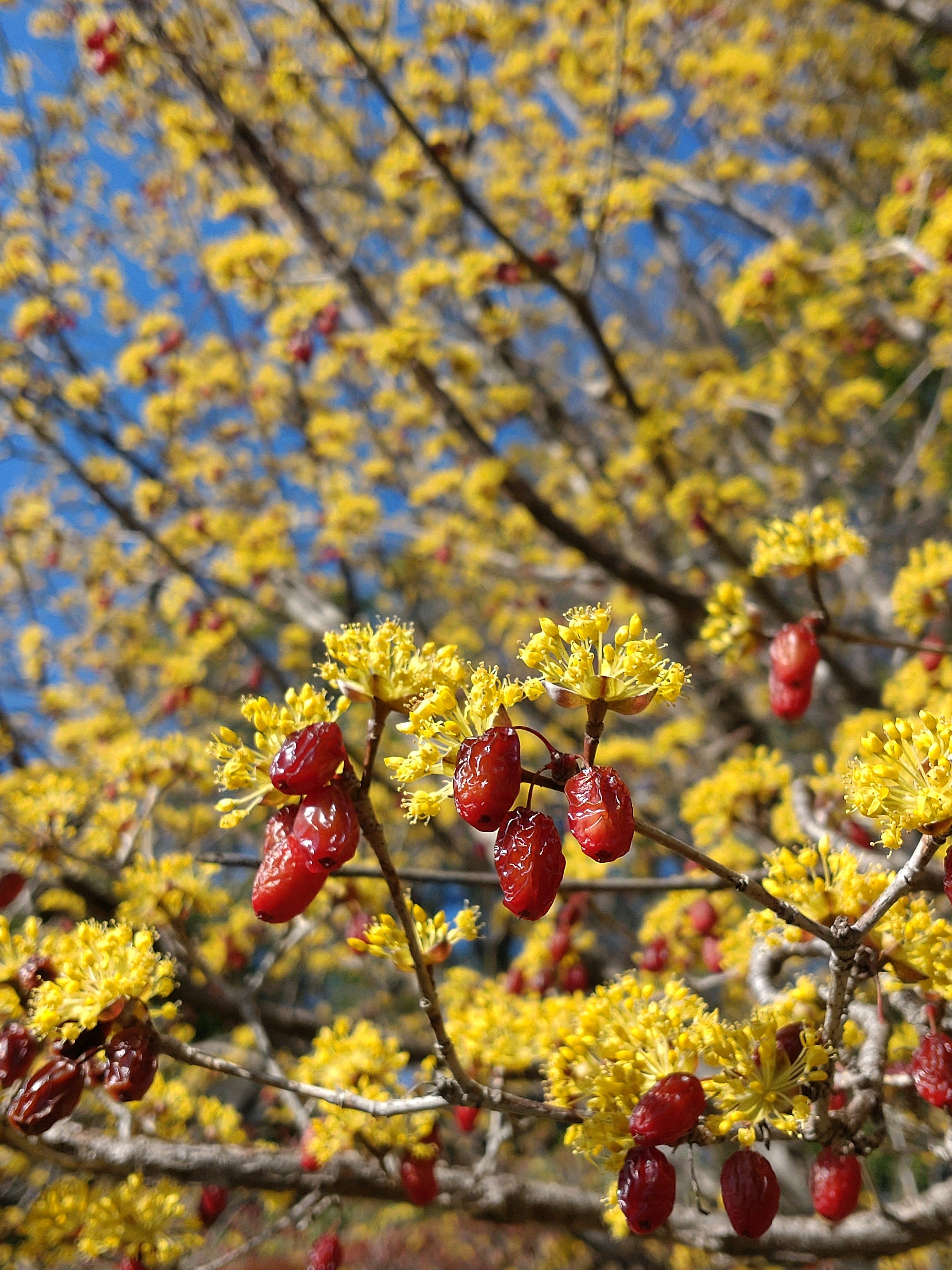 サンシュユの赤い実と黄色い花の組み合わせは、何度見ても本当に素敵✨