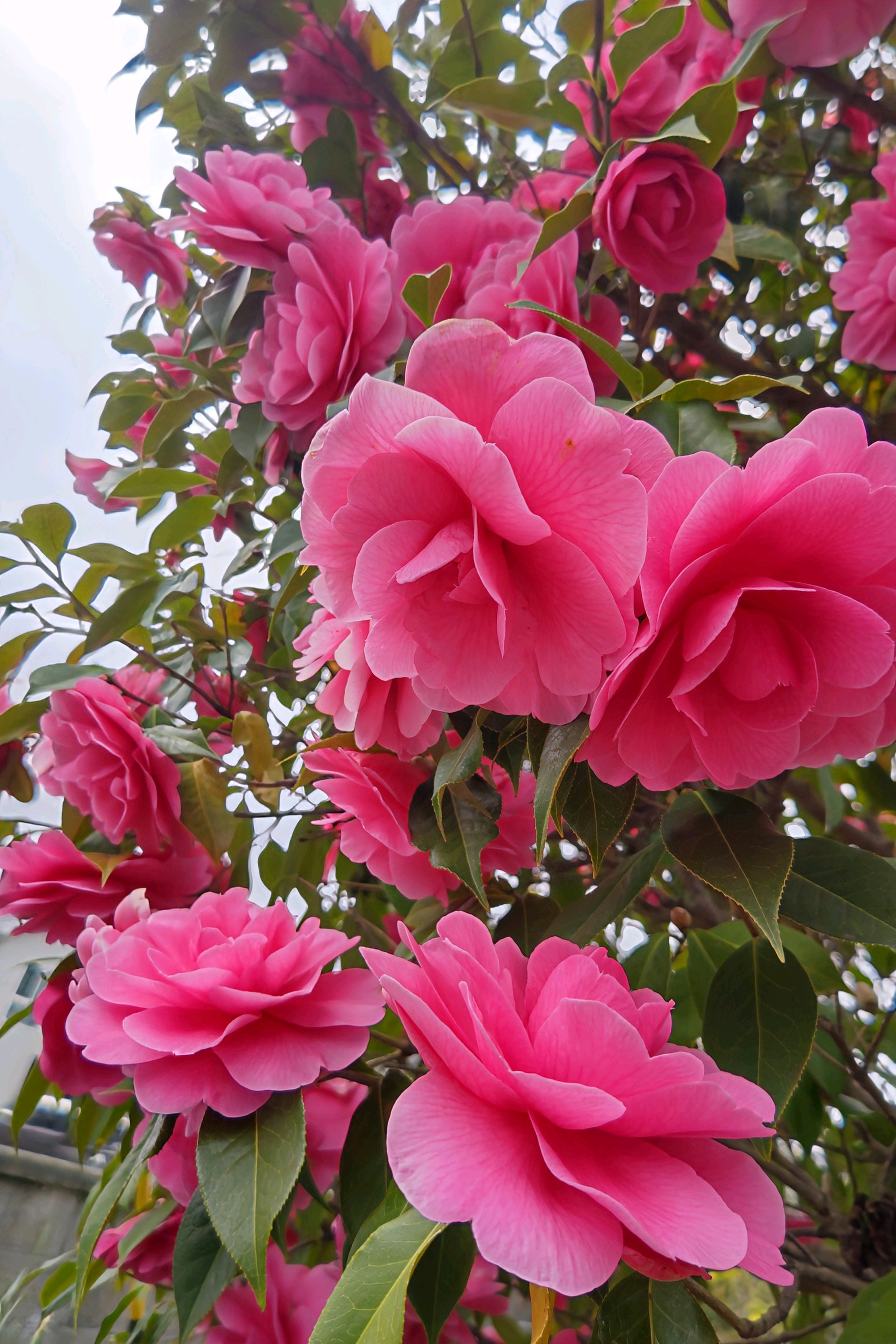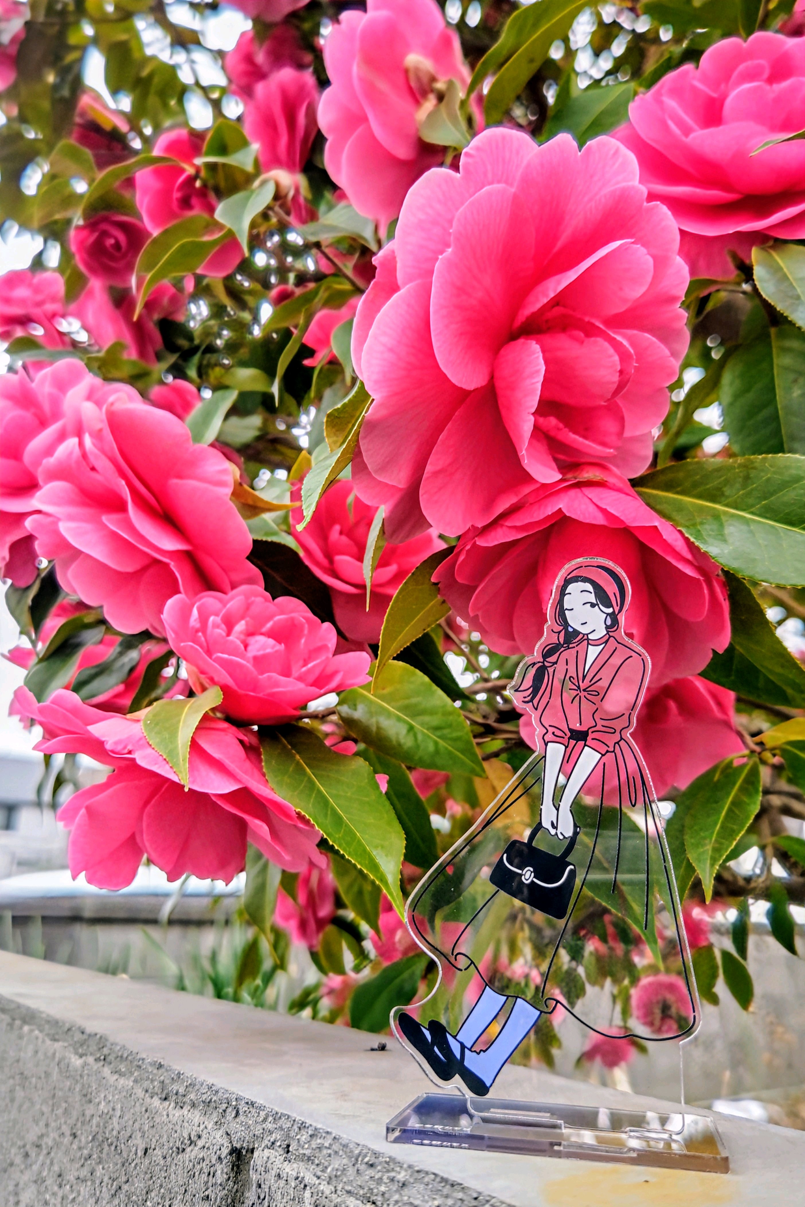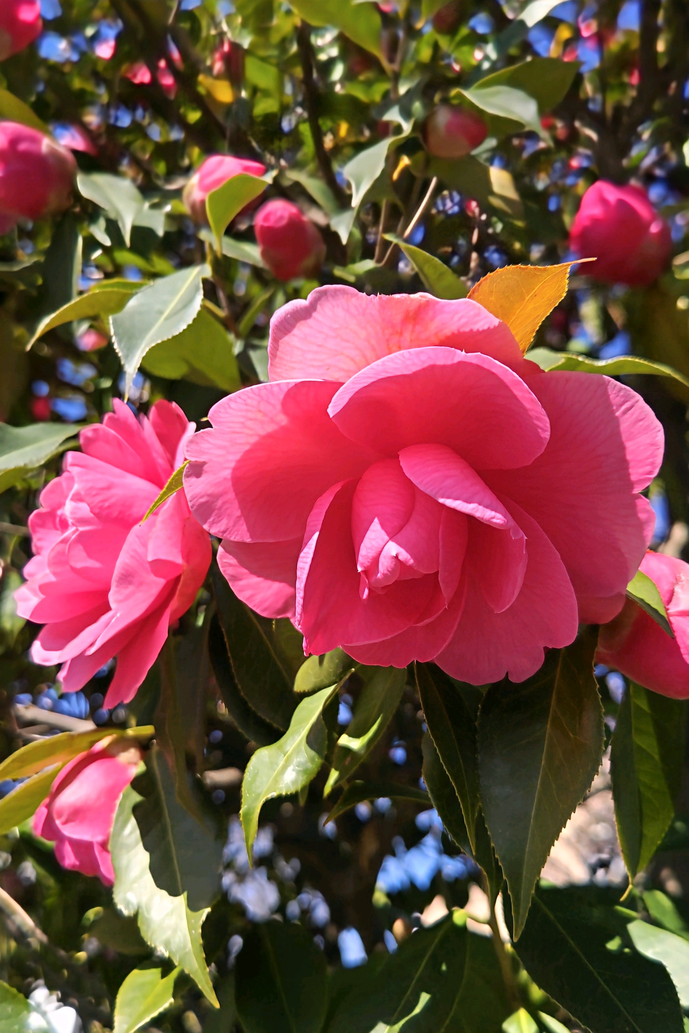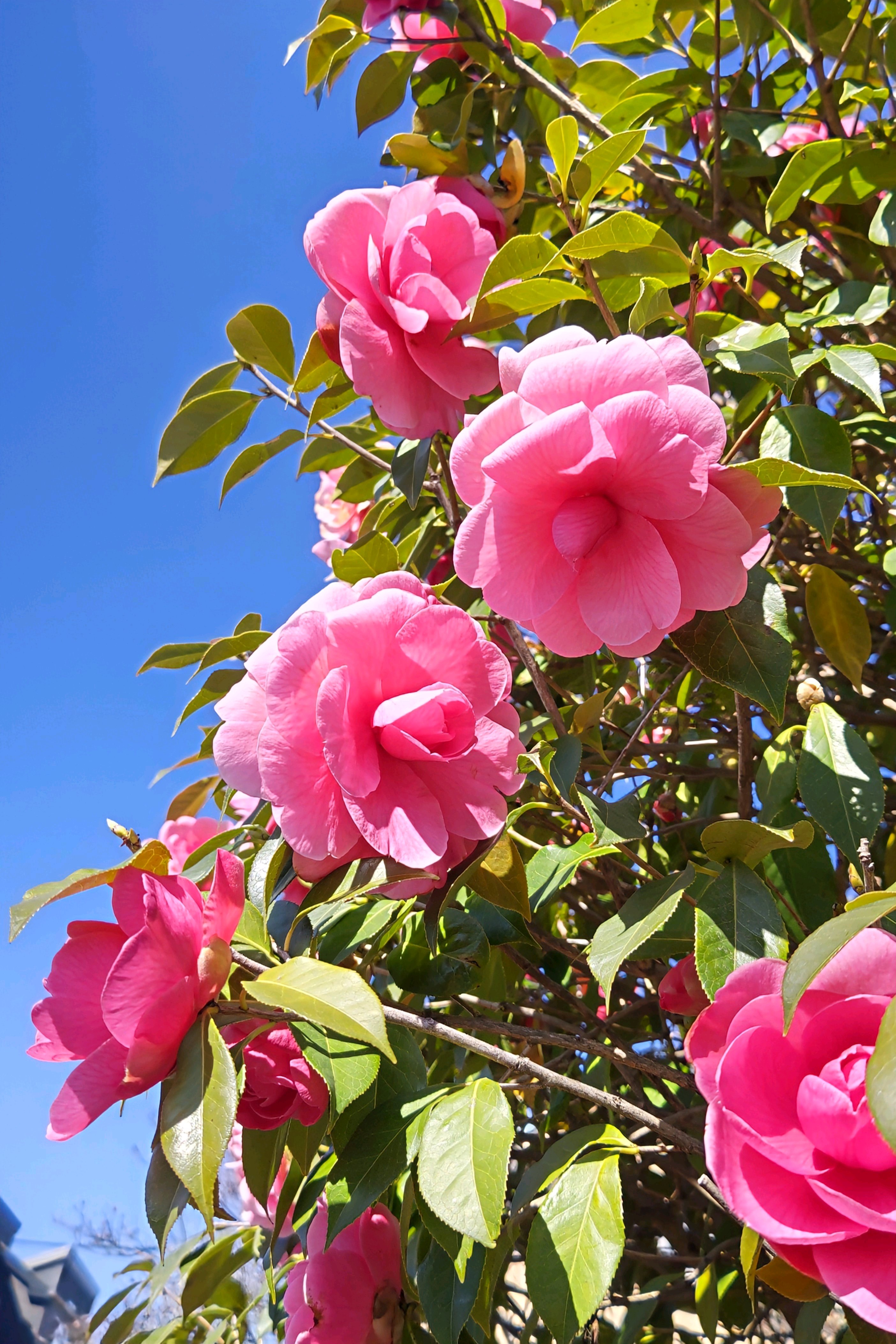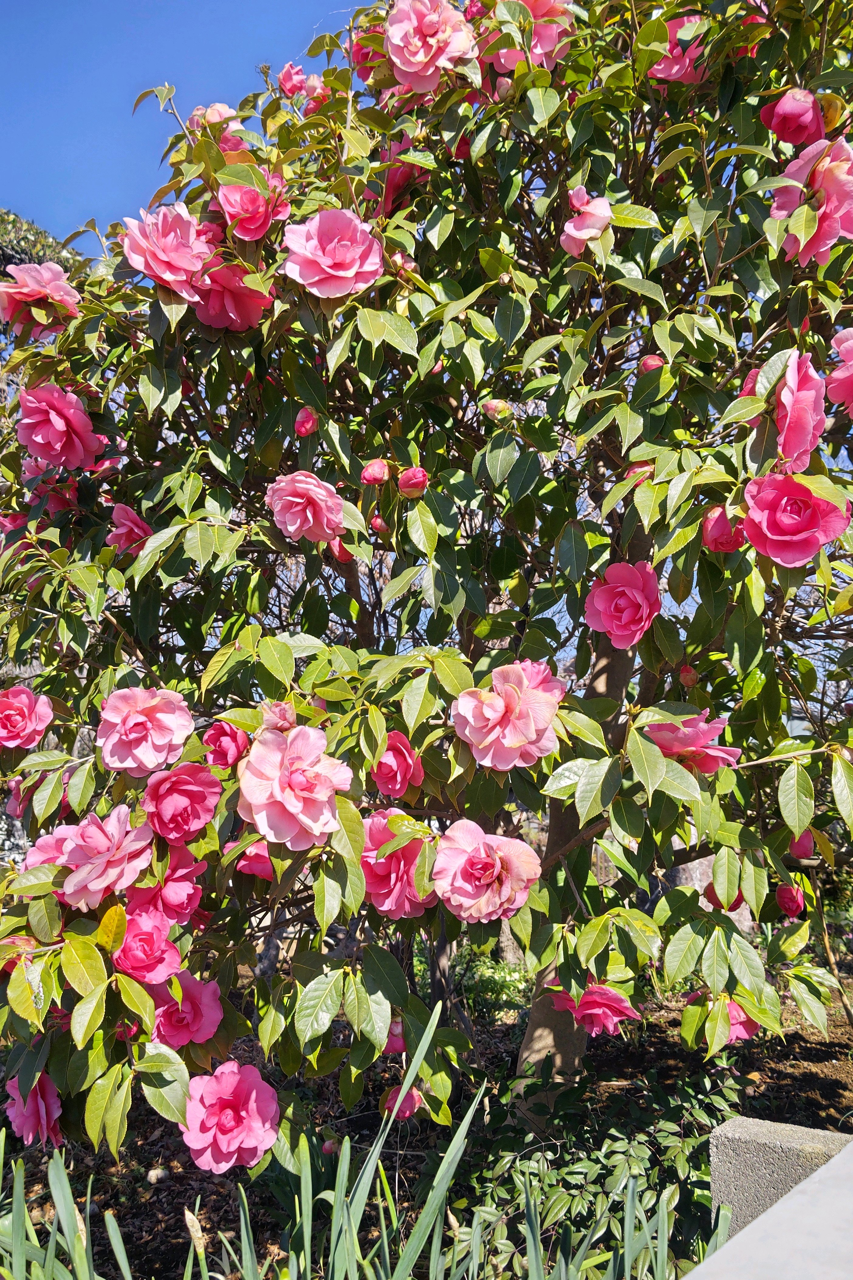 椿バレンタインデー、毎年ホワイトデーの頃に満開になる洋種椿。手のひら程はある大きな花。お散歩ちゃんと記念撮影。