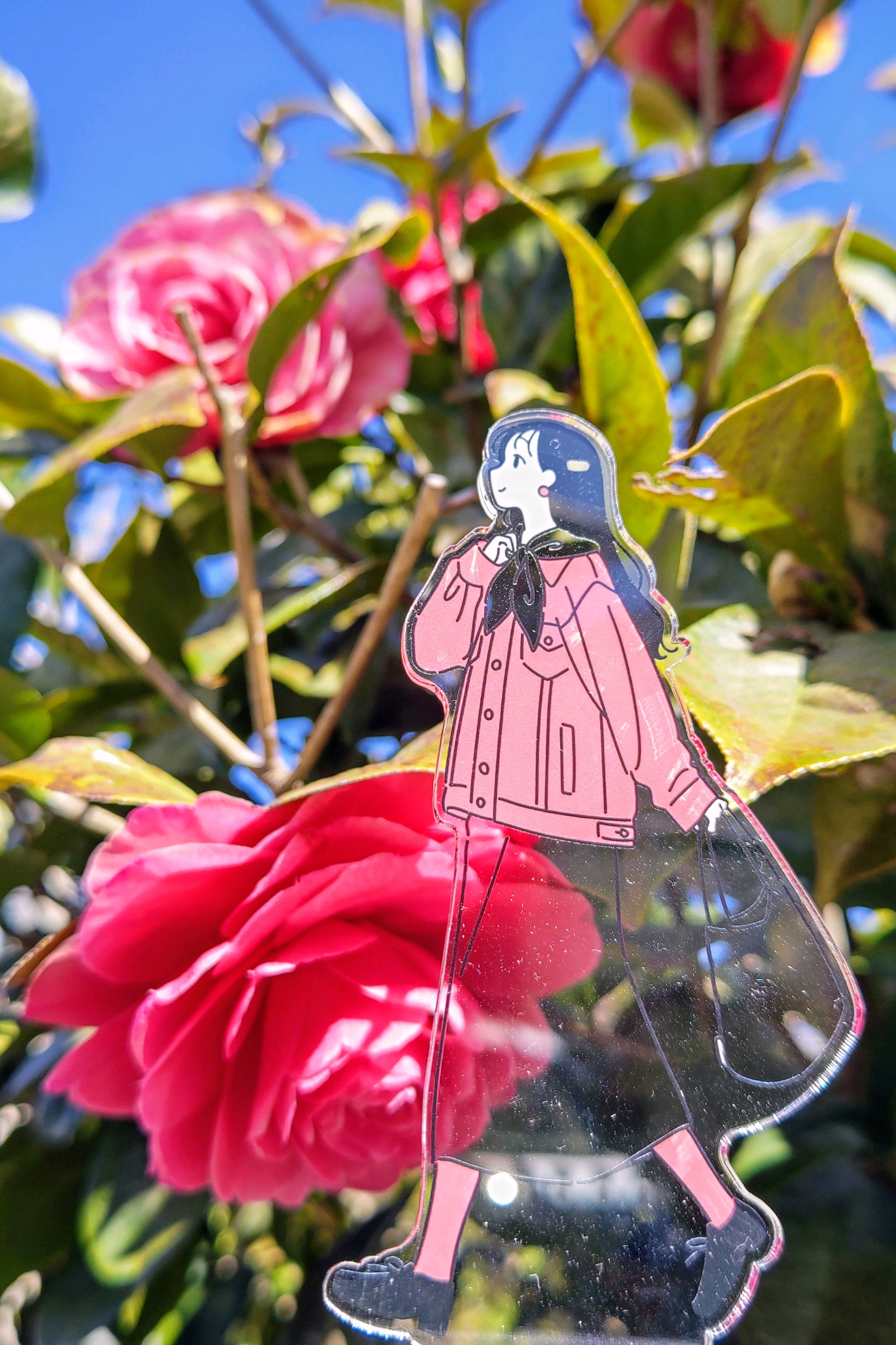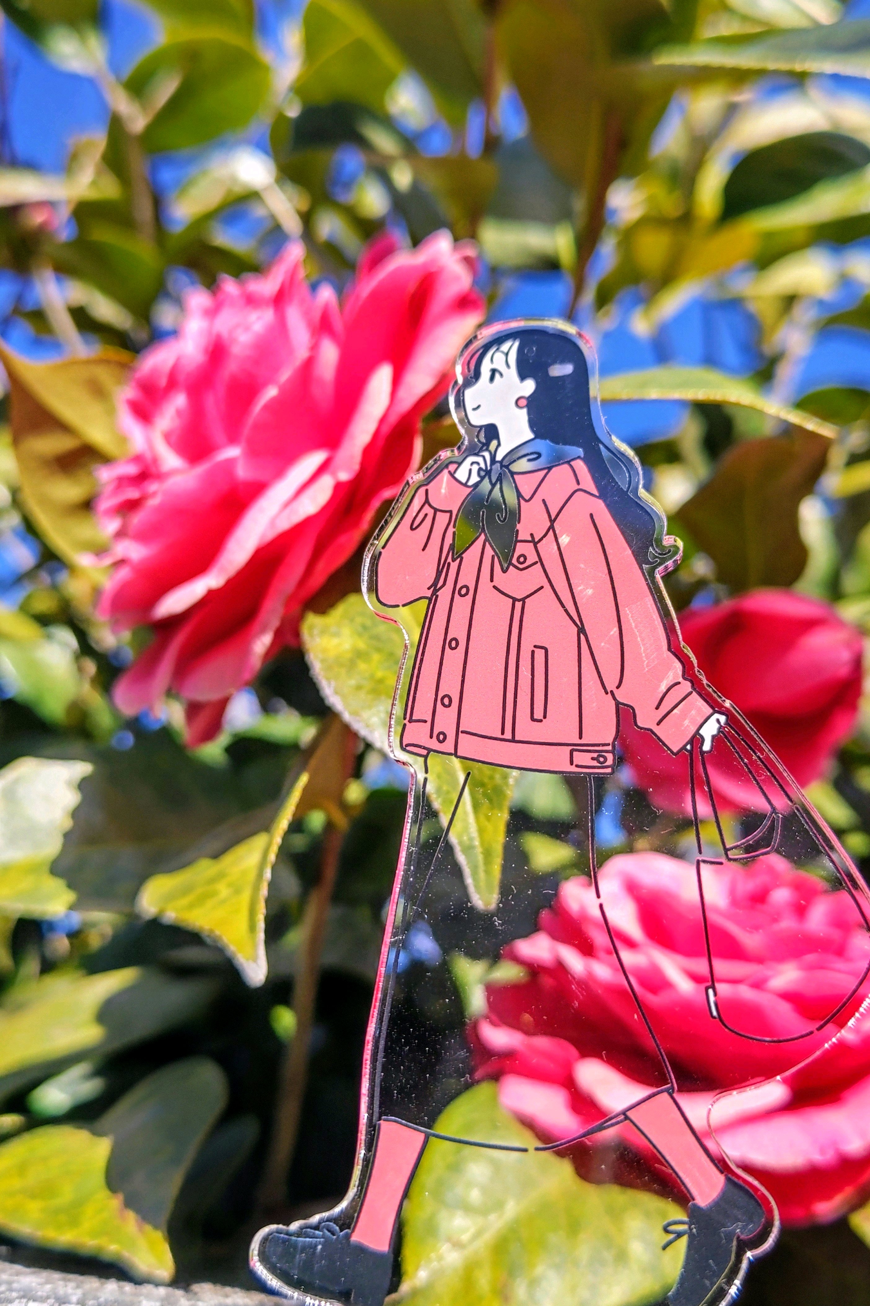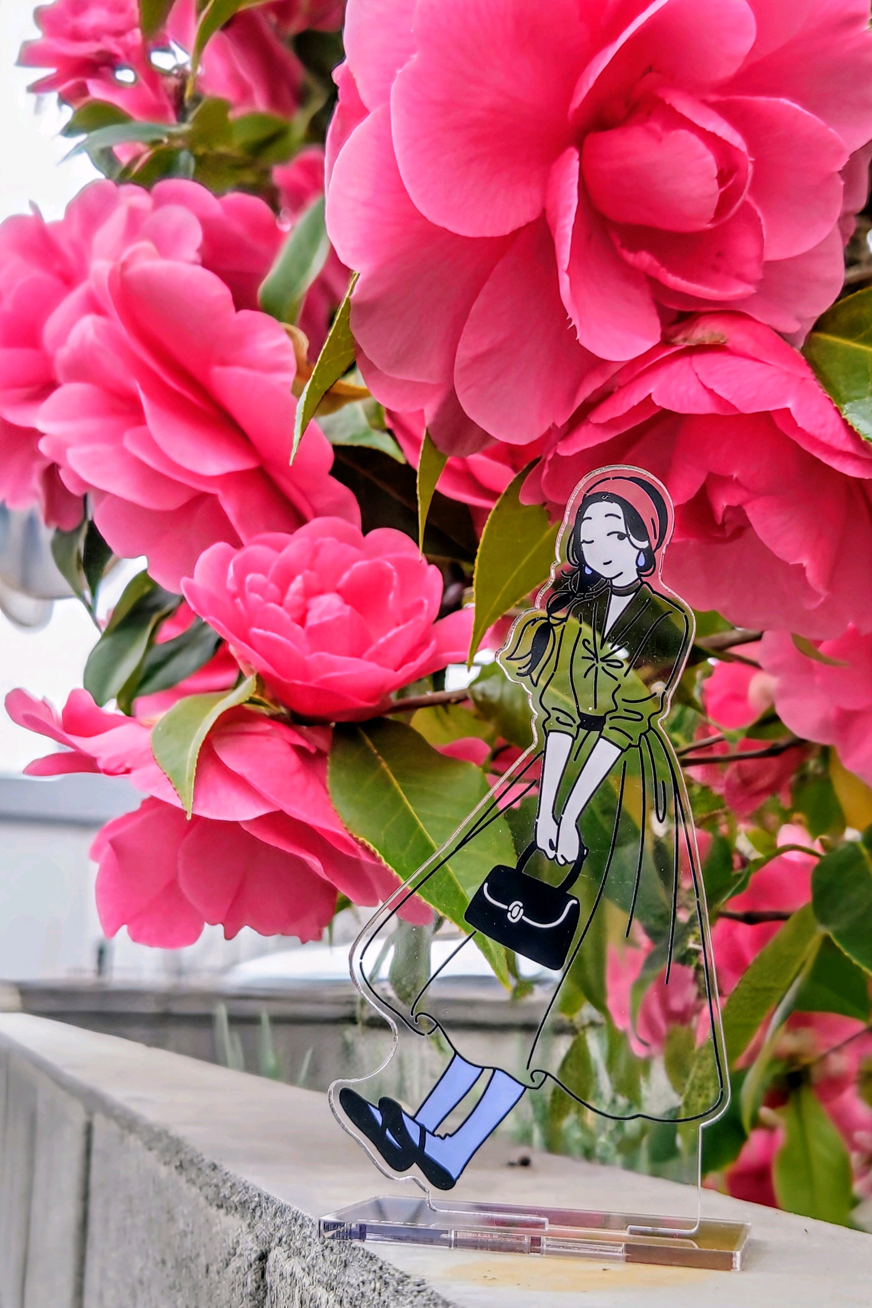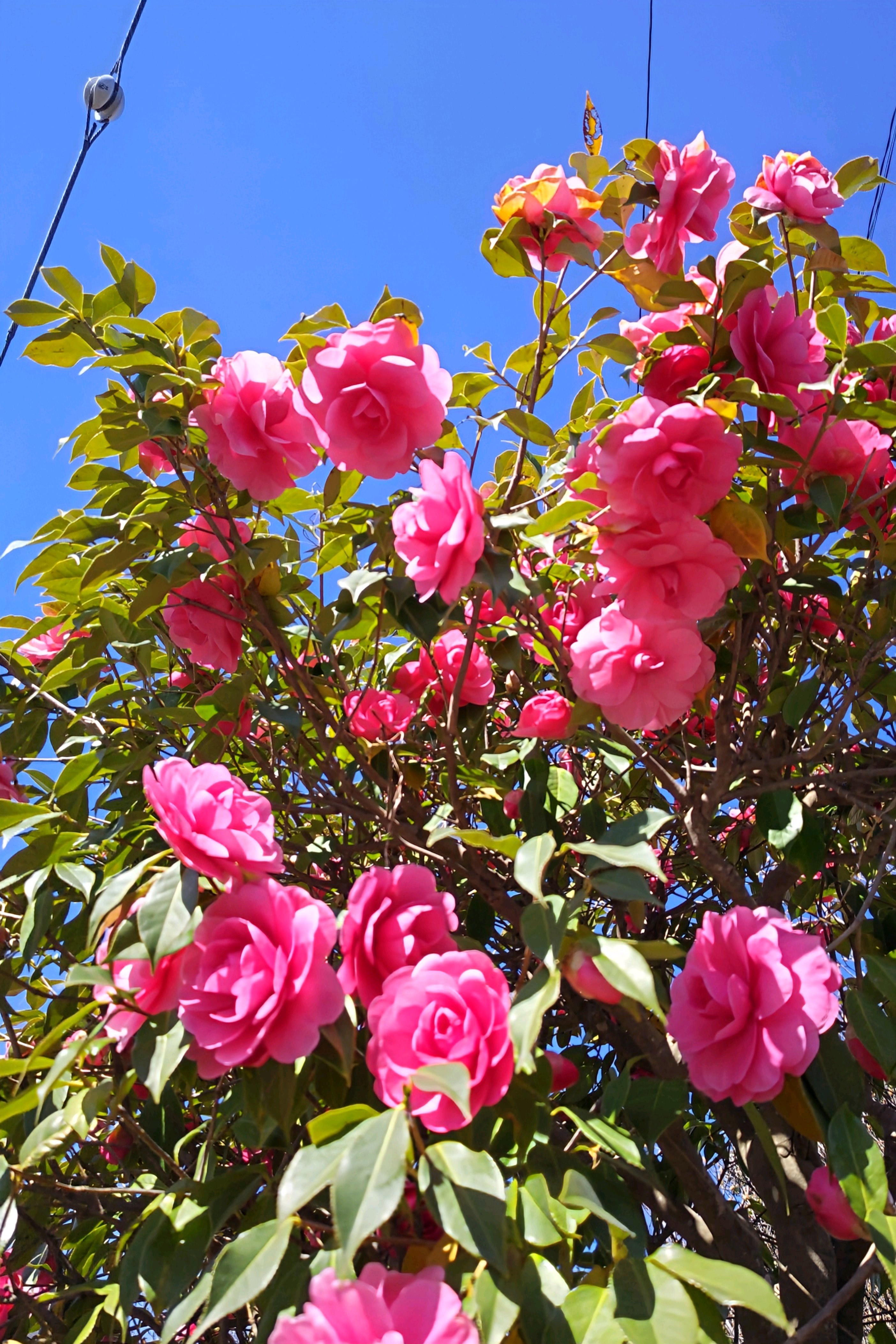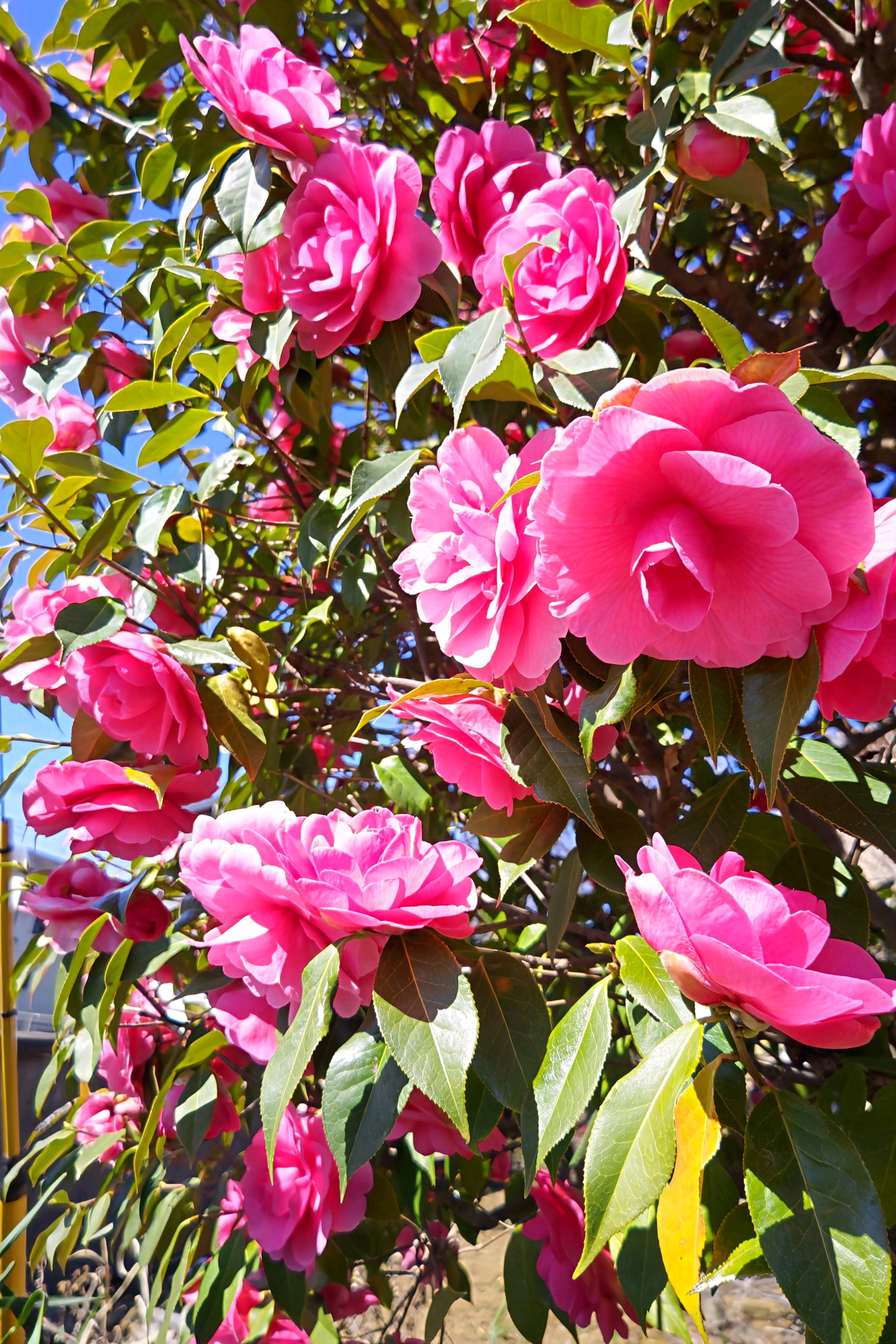 椿バレンタインデー、毎年ホワイトデーの頃に満開になる洋種椿。手のひら程はある大きな花。お散歩ちゃんと記念撮影。