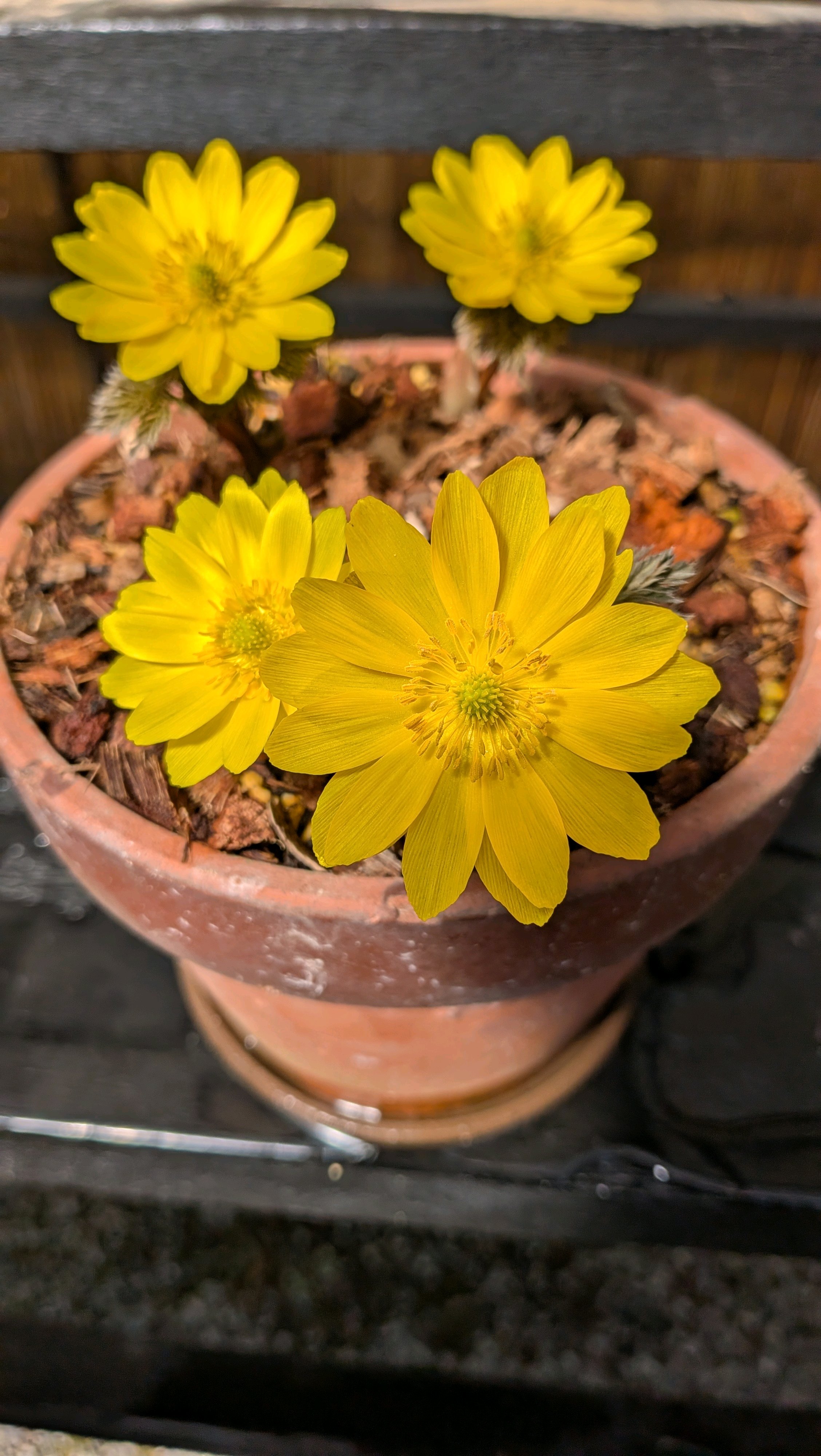 入口脇にてフクジュソウの鉢植えがお出迎え