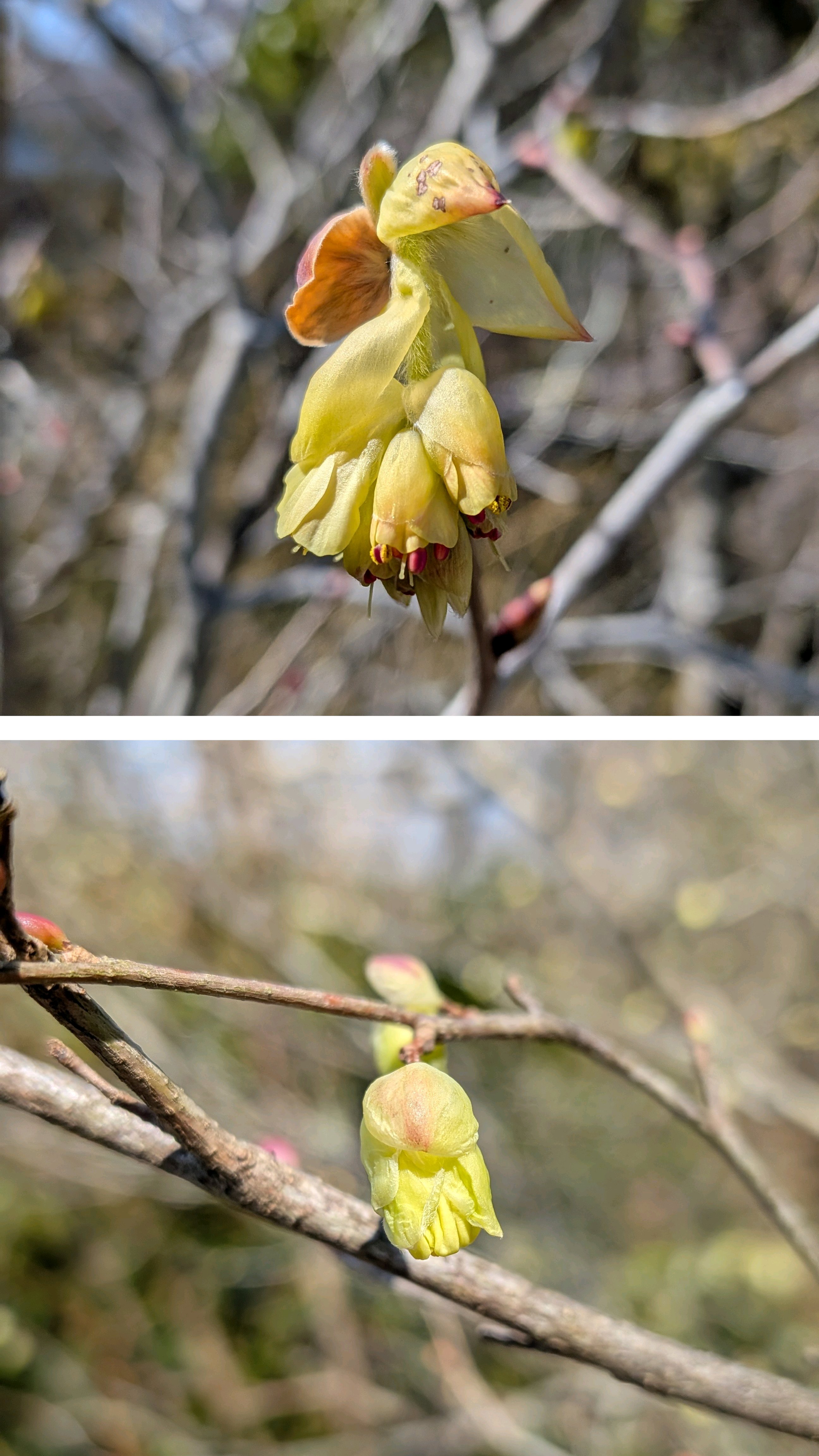 (上)トサミズキと(下)ヒュウガミズキはまだ咲き始め