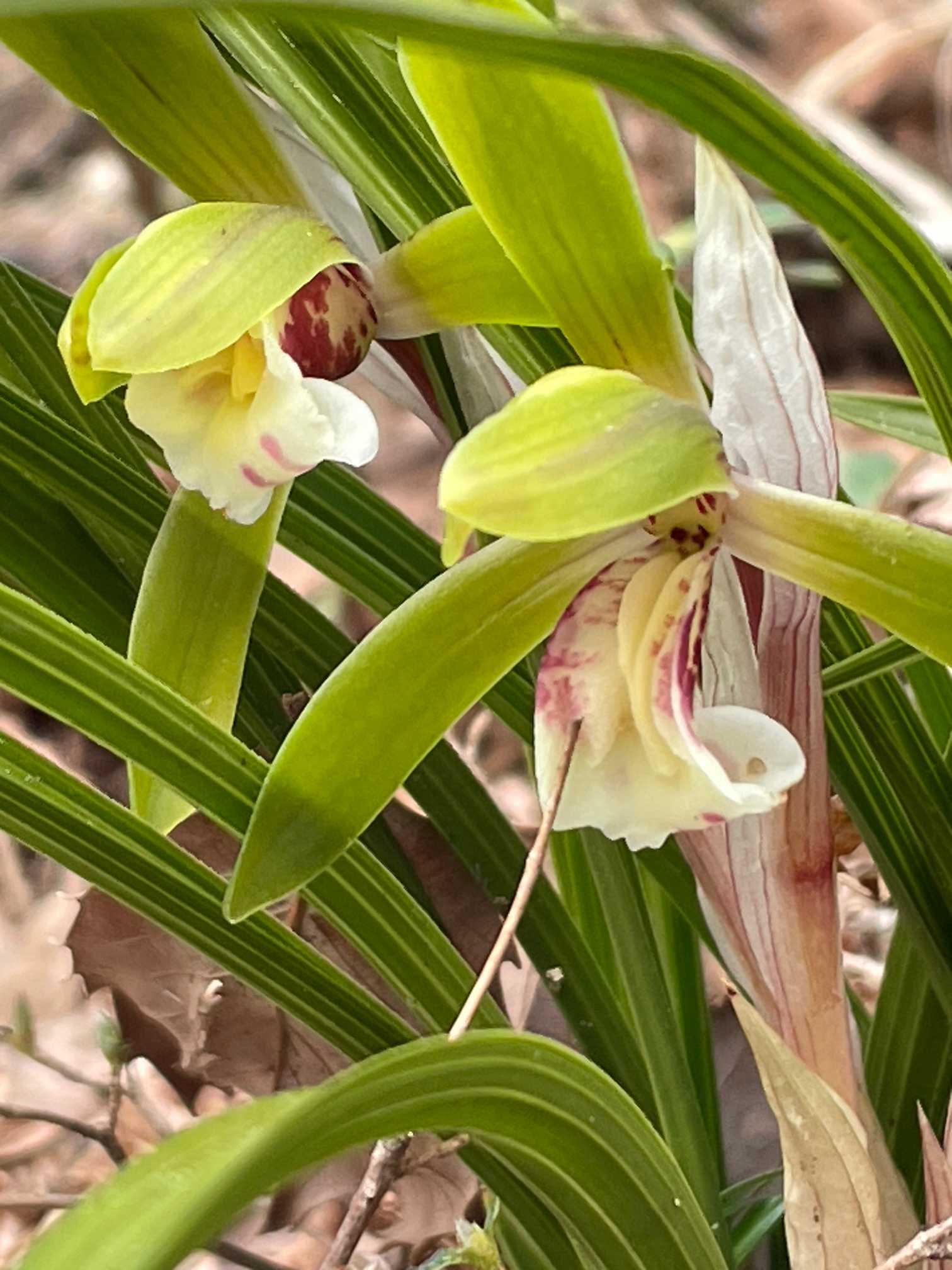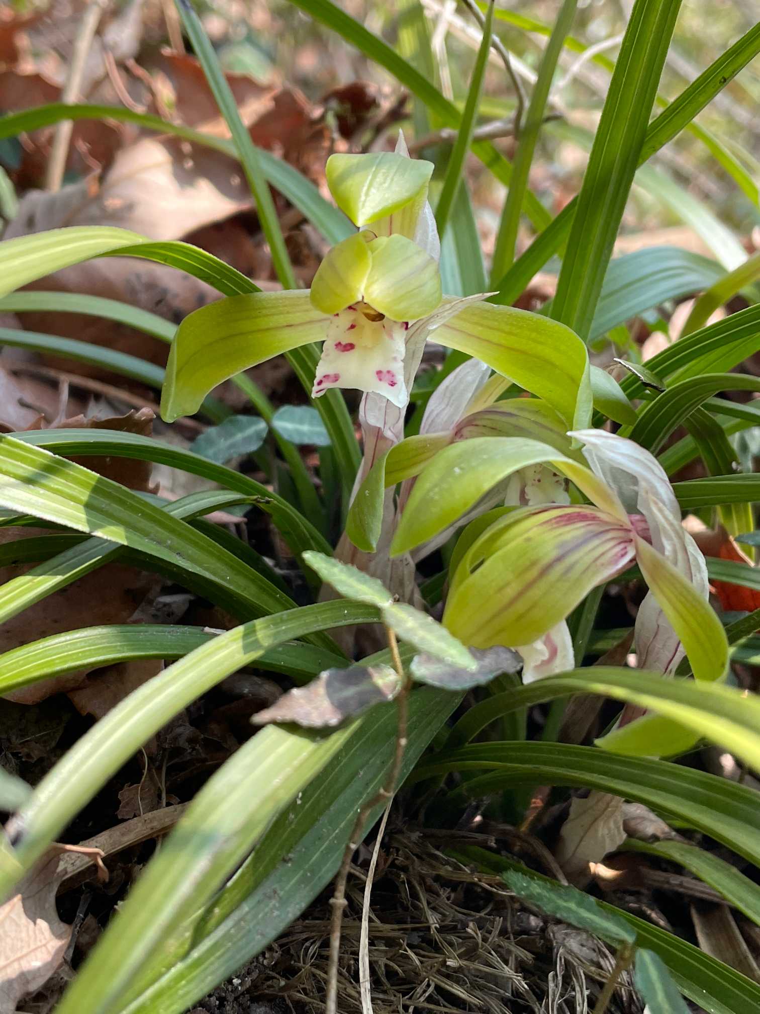 その、シュンラン(春蘭)、咲いたばかりか、まだ花が低い。