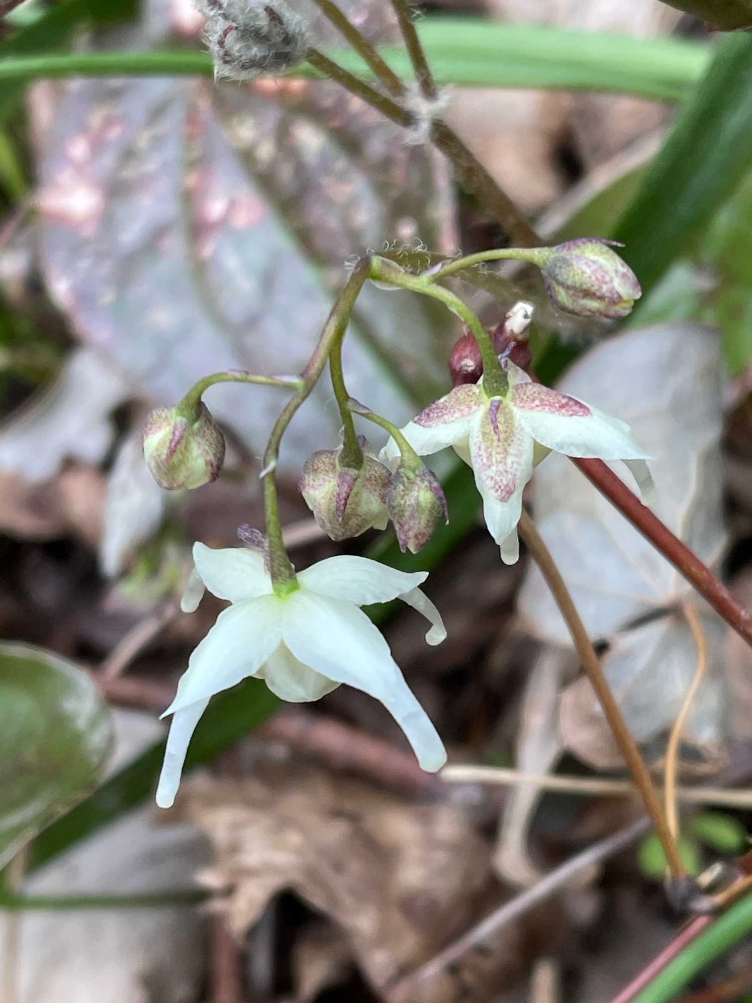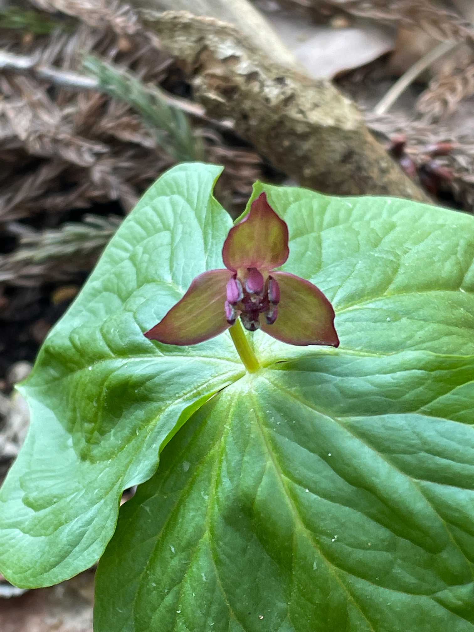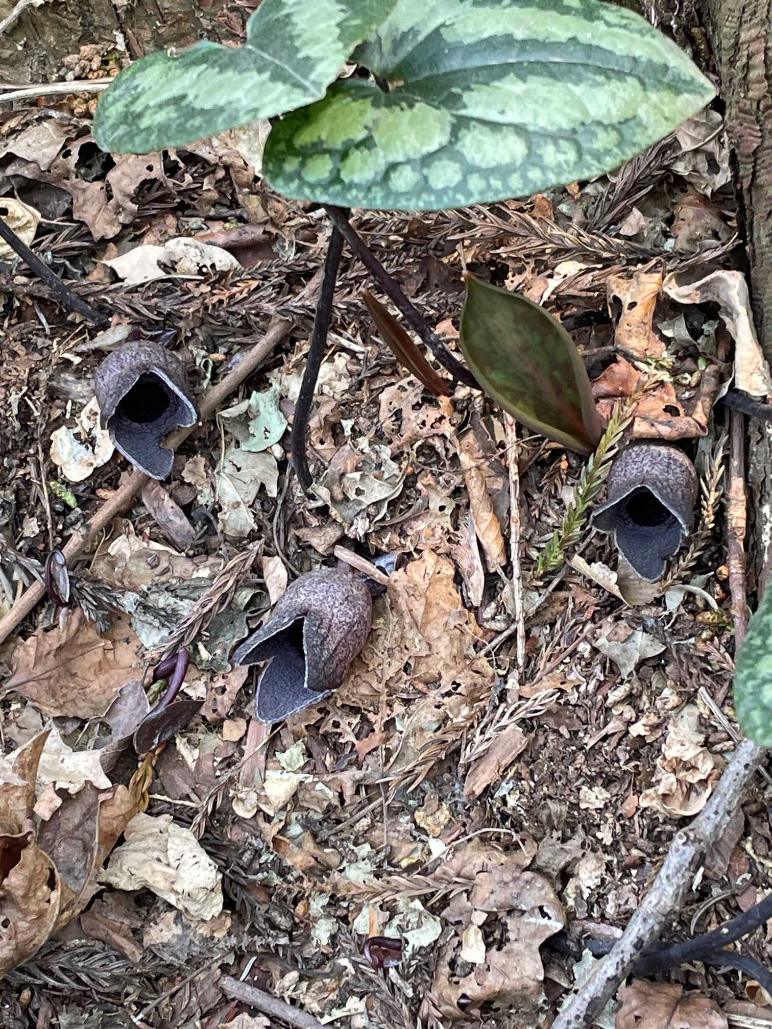コシノカンアオイ(越の寒葵)。花の回りの枯葉を、全部どかしてくれて、ウ〜ン、有難迷惑。