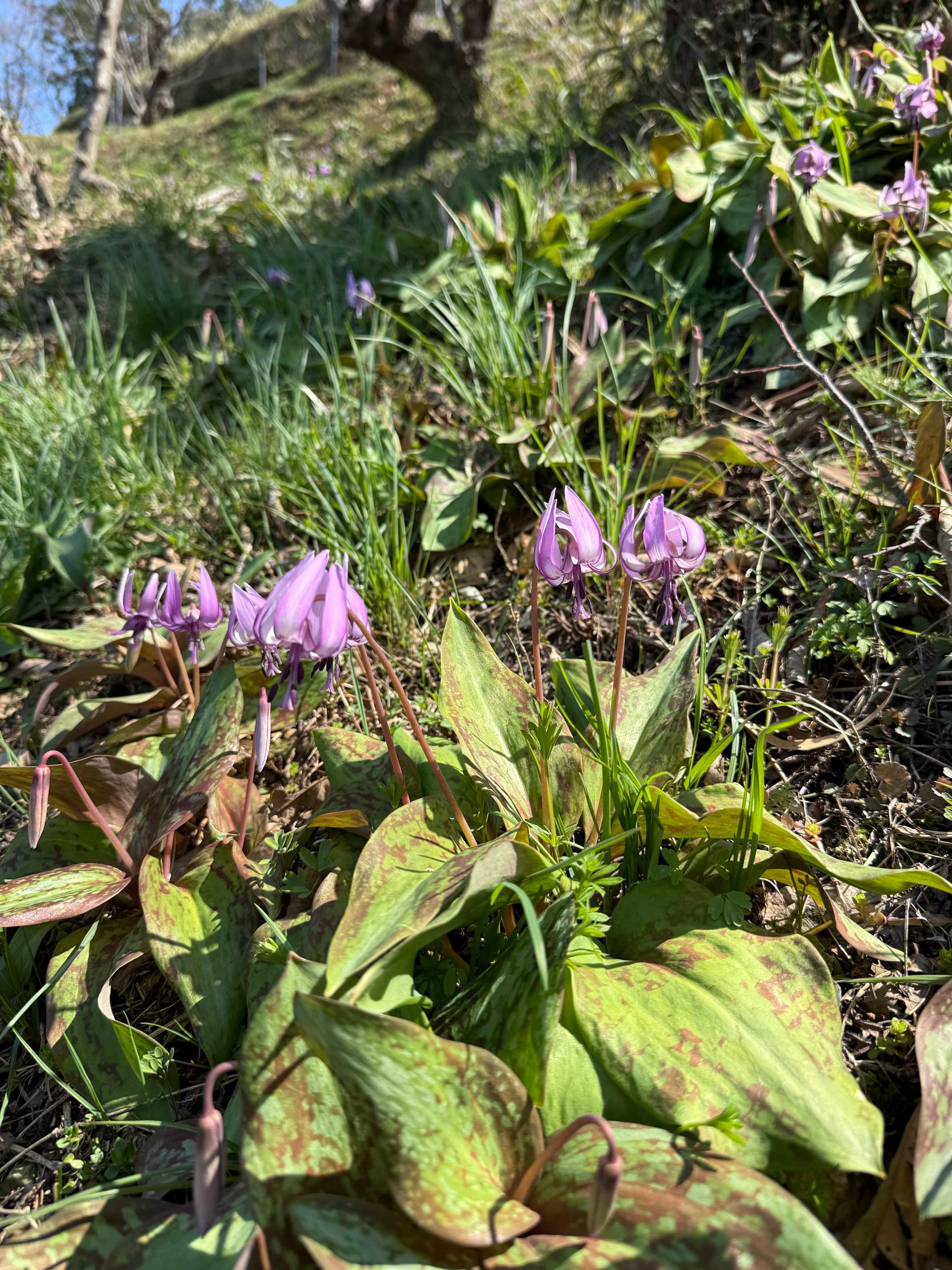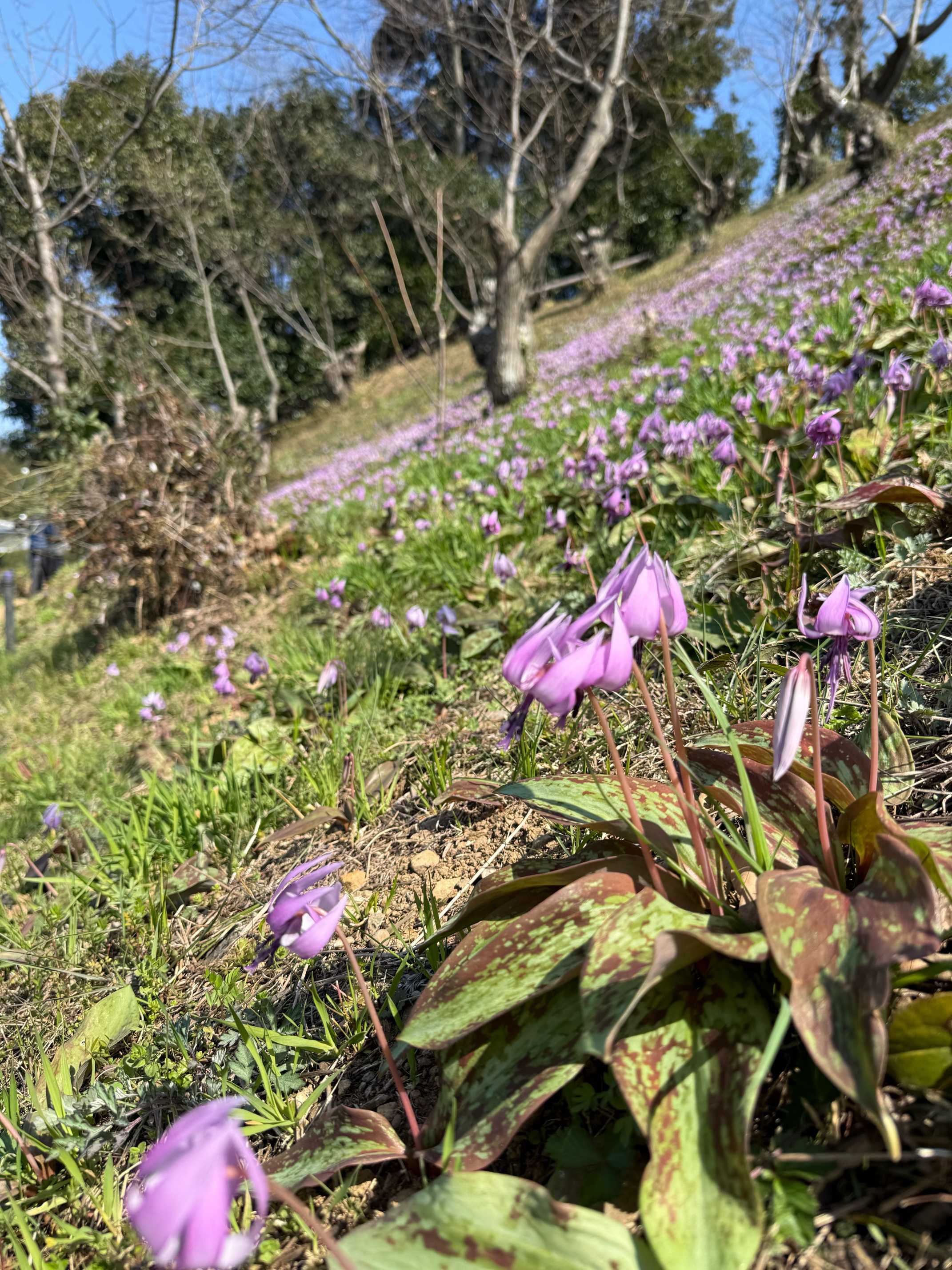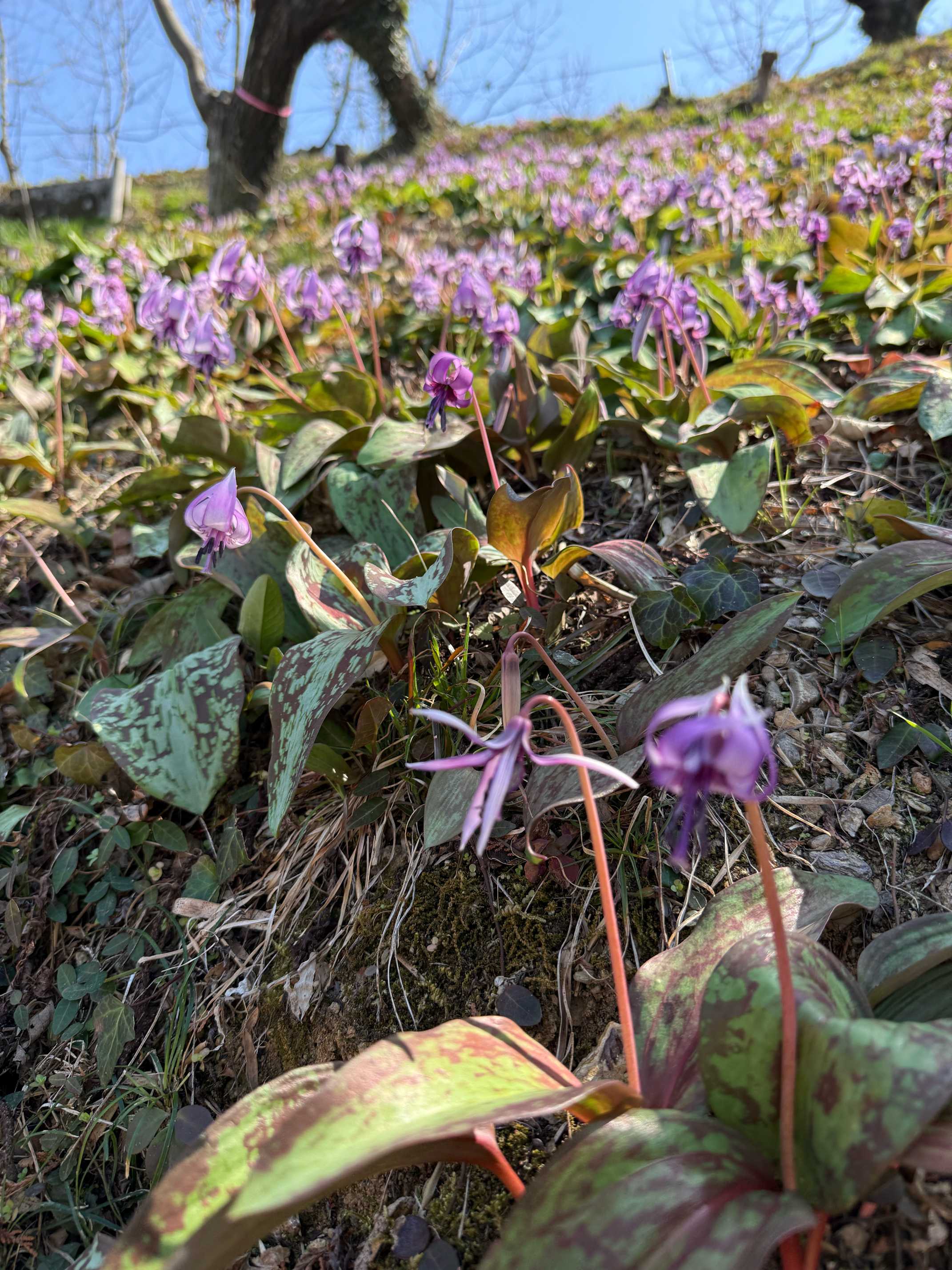この斜面を仰ぐとカタクリでピンクに見える山肌