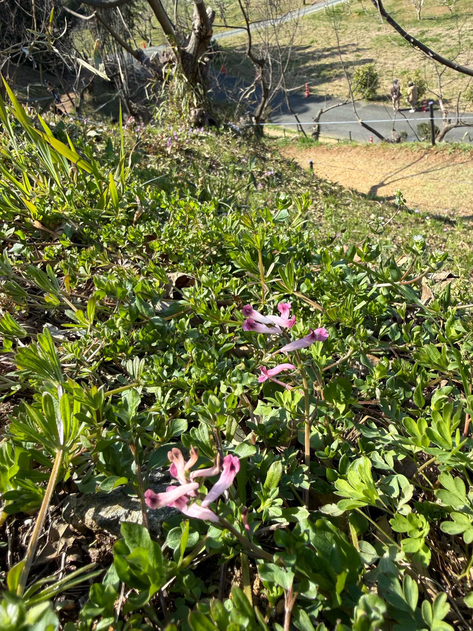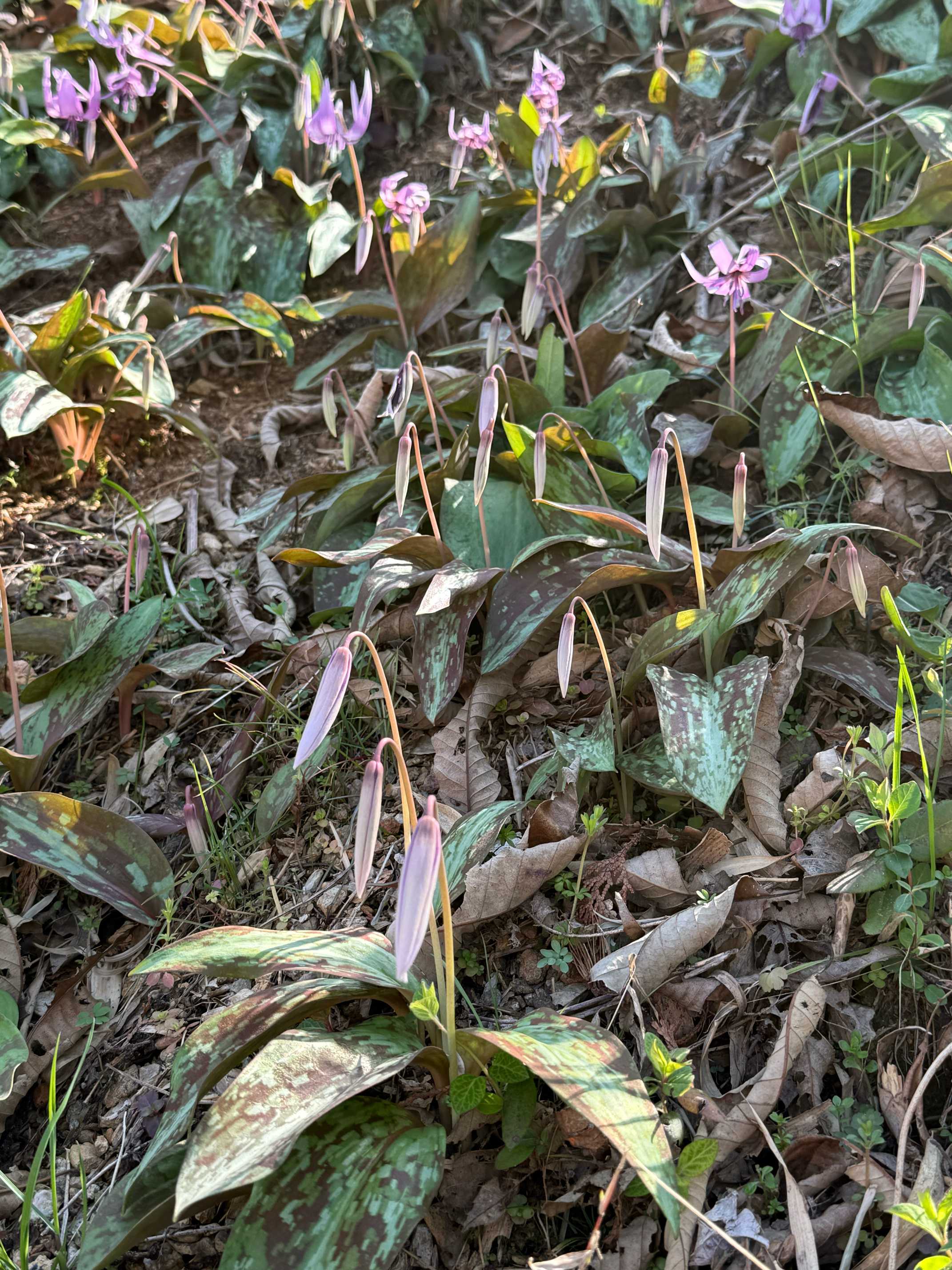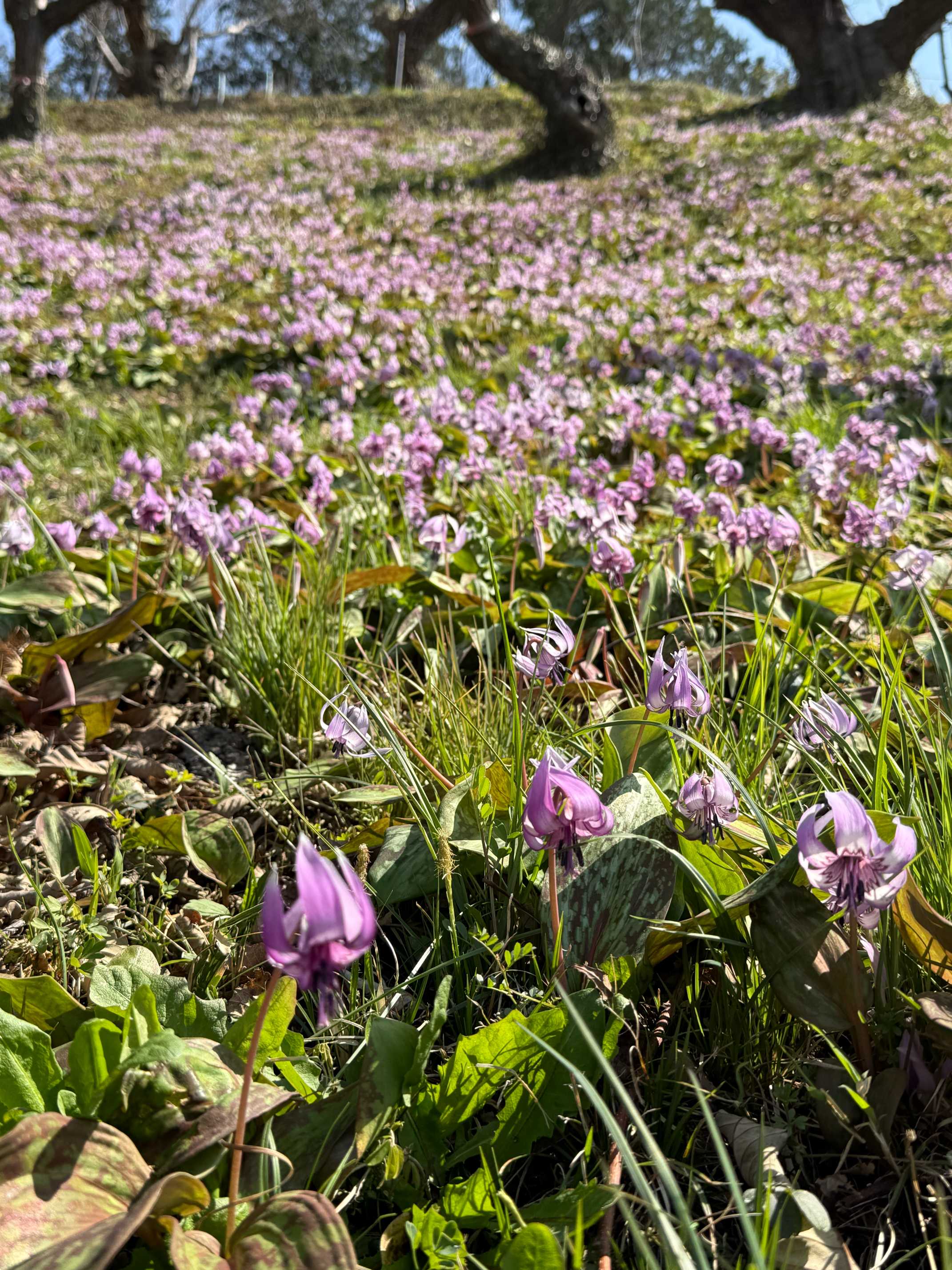 この斜面を仰ぐとカタクリでピンクに見える山肌