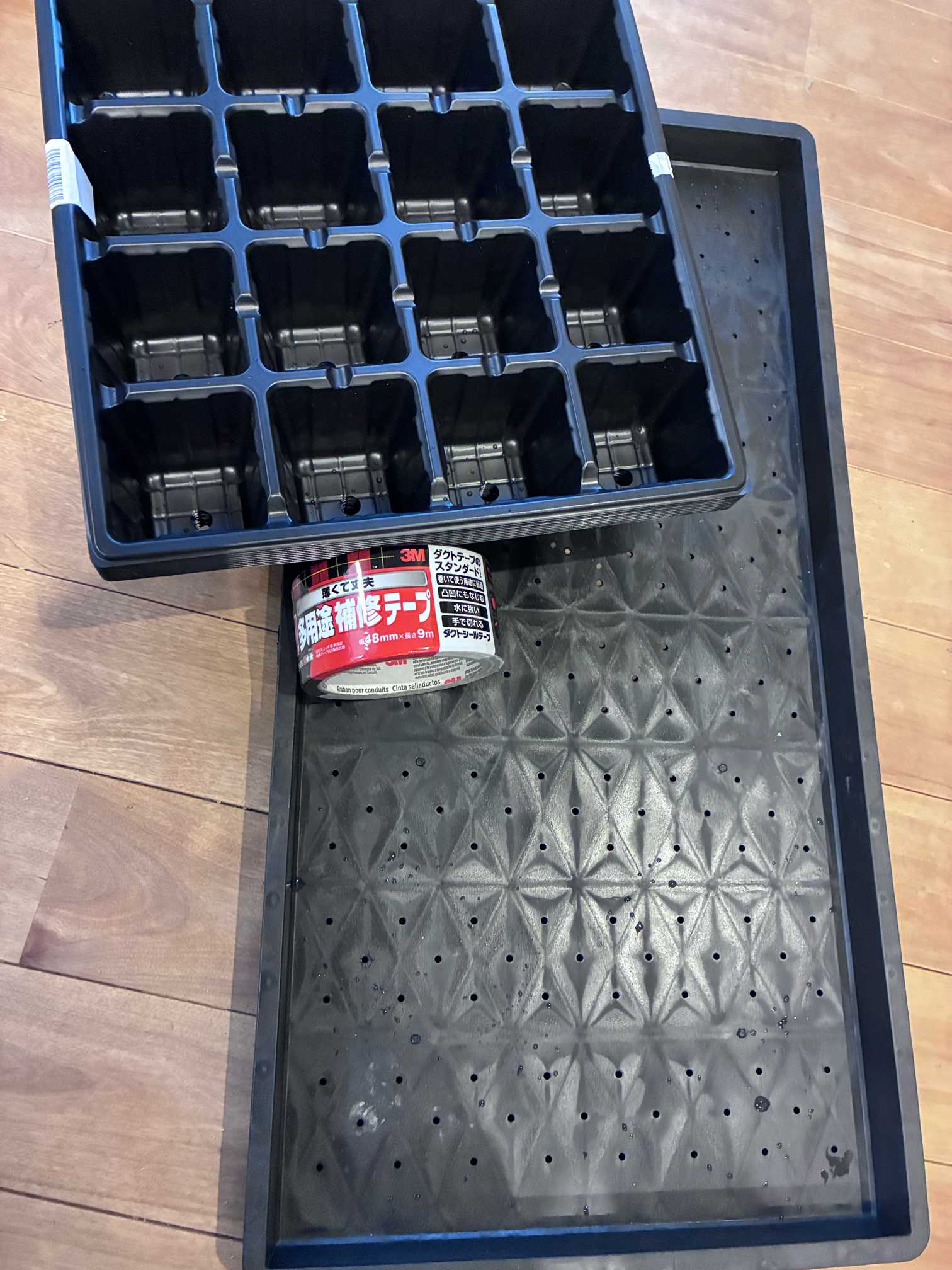 このサイズのセルトレーが使いやすそうだったので、10枚セットを1つ、このトレーが2つぴったり入る育苗箱を5つ、そしてこの育苗箱の穴を埋めるための防水テープを買いました。