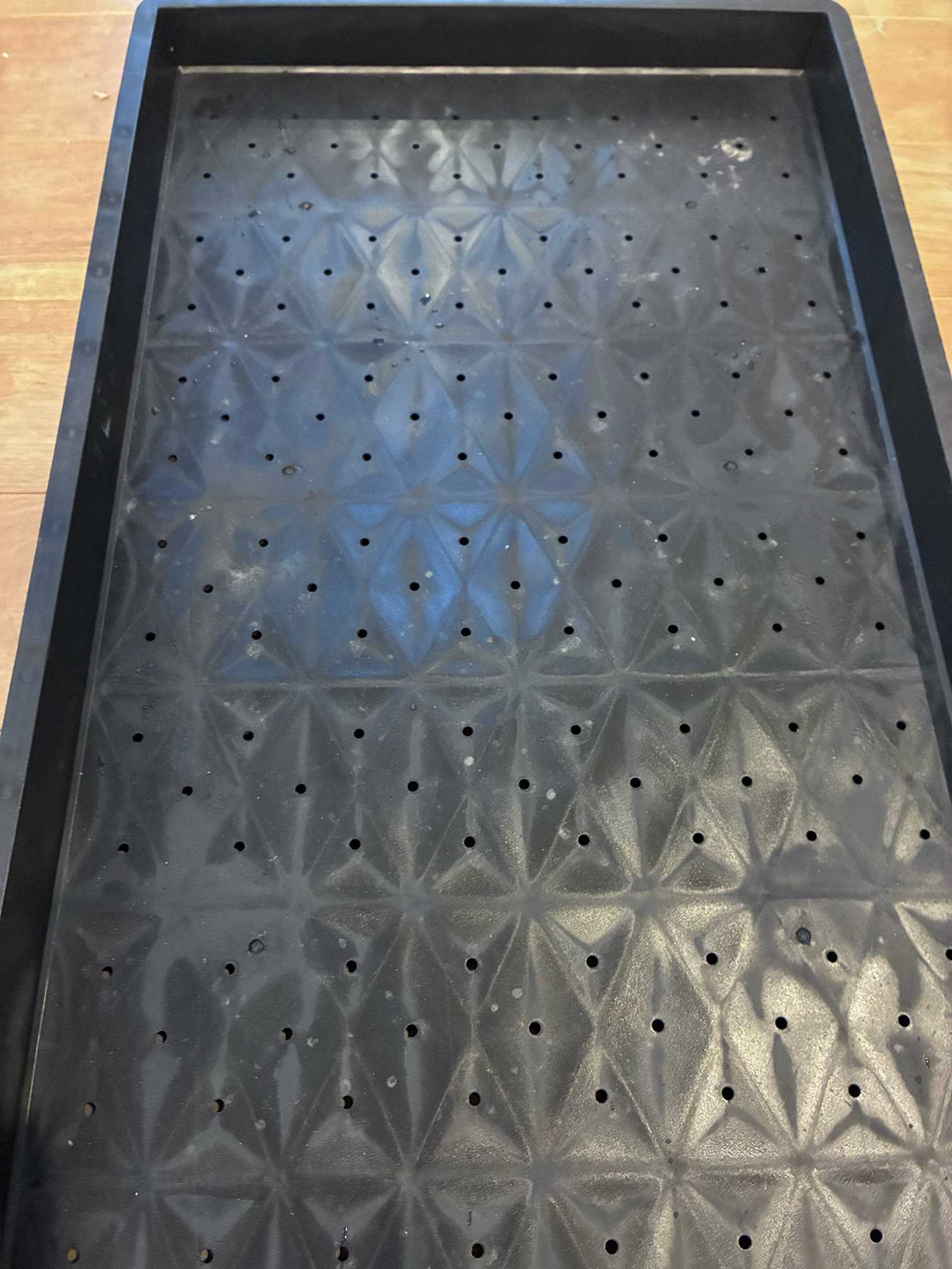 穴空き育苗箱で腰水にする時は、ゴミ袋を切って敷いてからトレーを置くと安上がりですよー👍