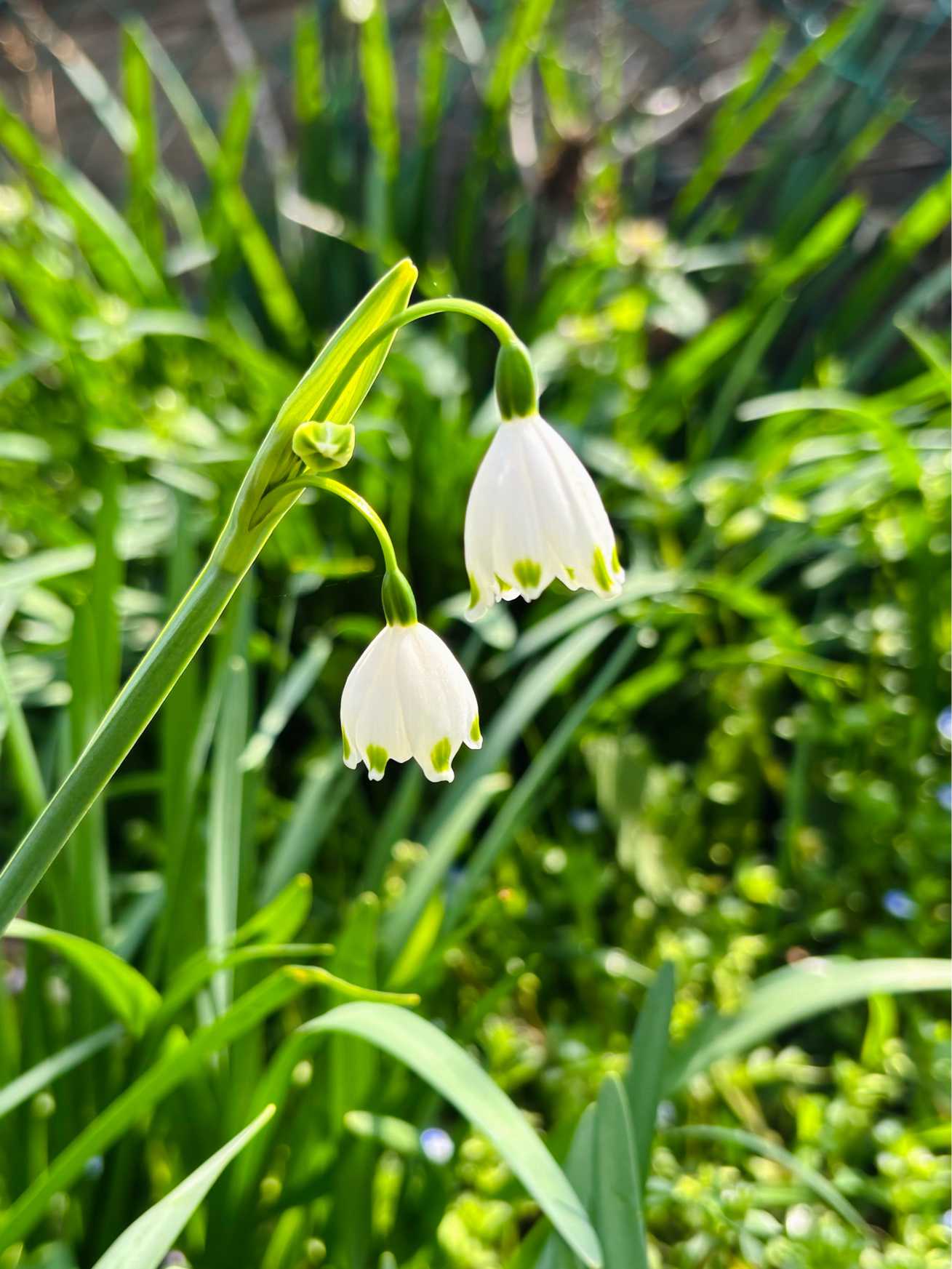 スイセンに似たすらりとした葉に、スズランのようなベル形の花を下向きに咲かせます。白い花弁の先端に緑色の斑点があり愛らしいです🤍