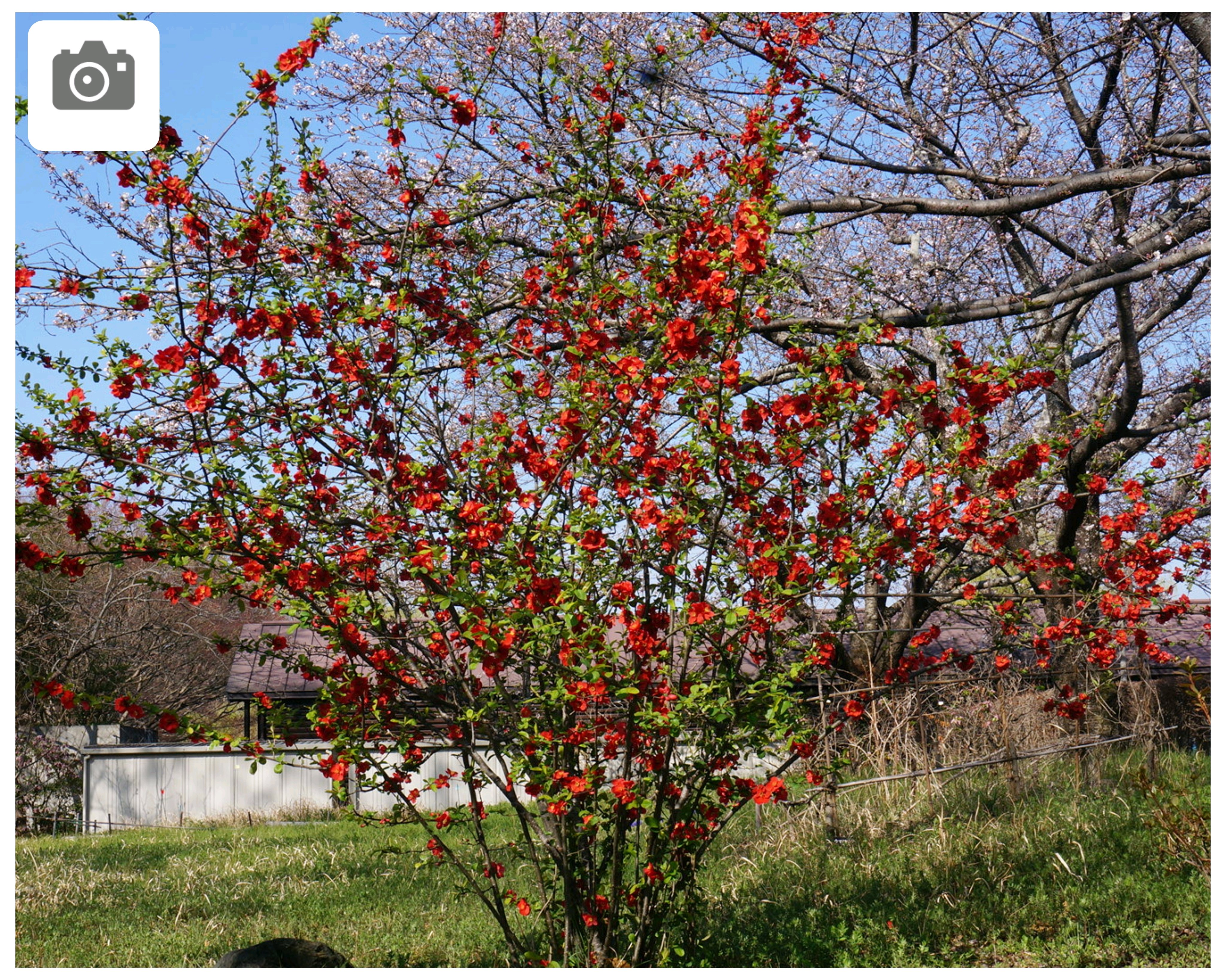 入り口に ボケかな、満開