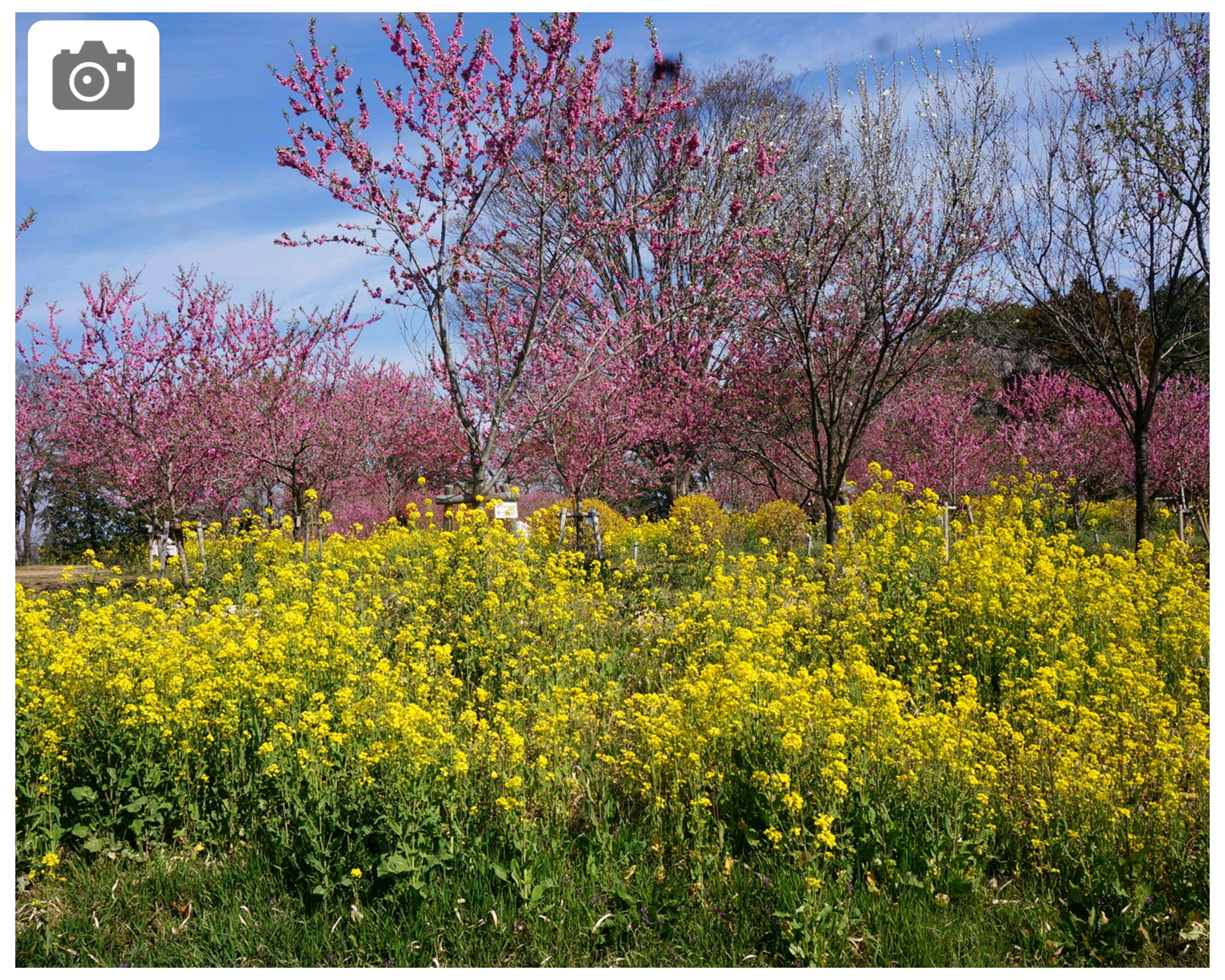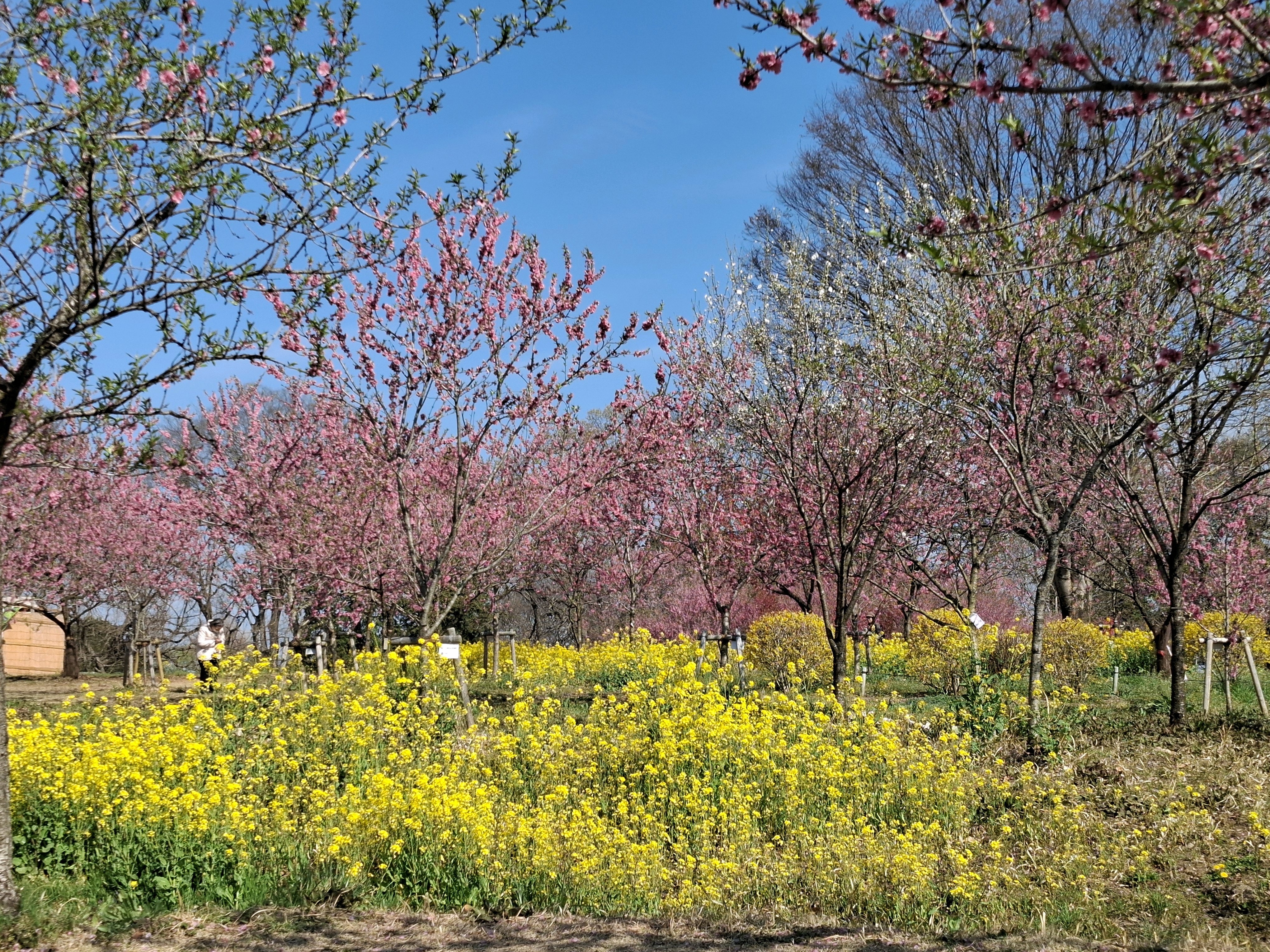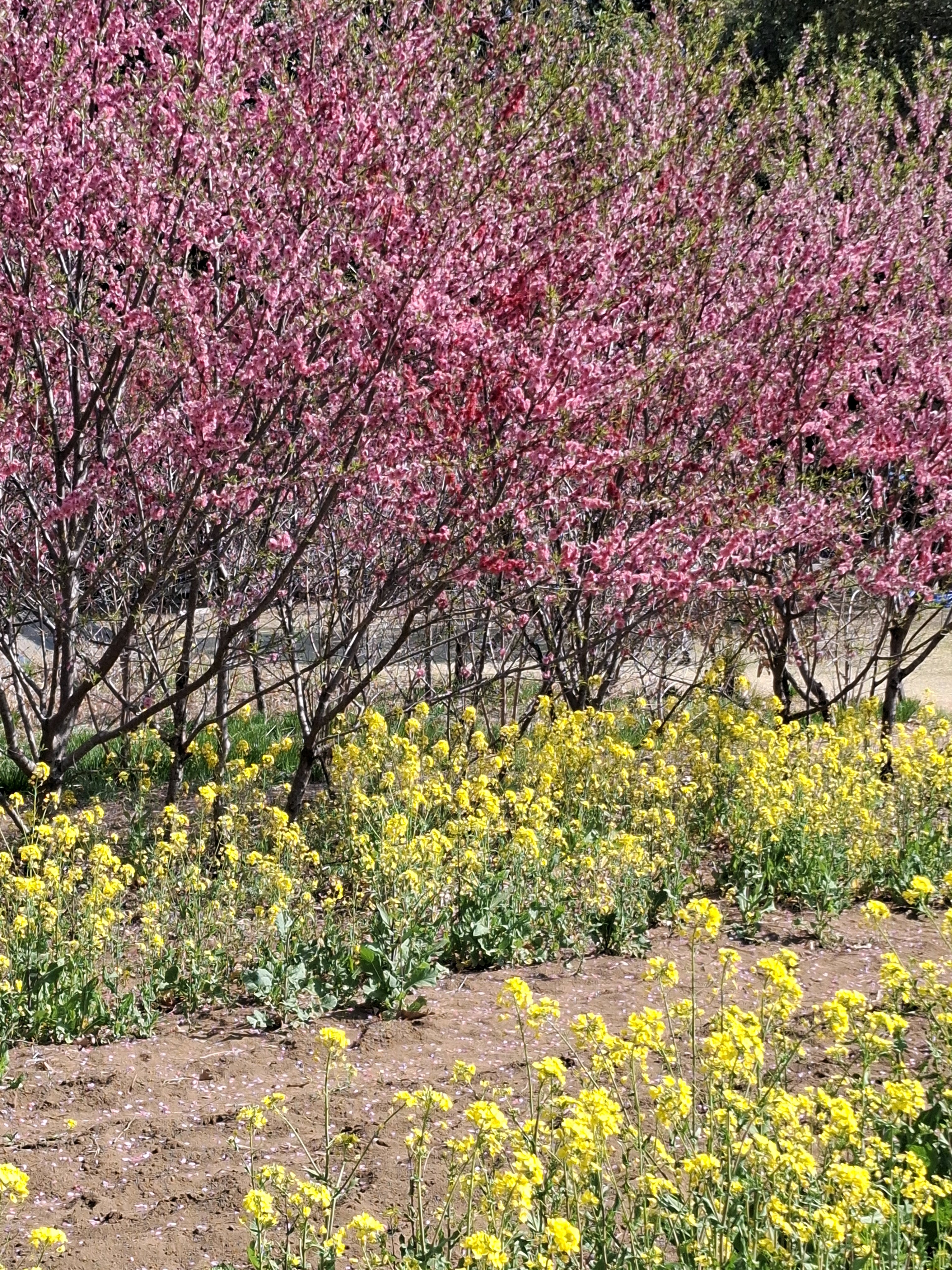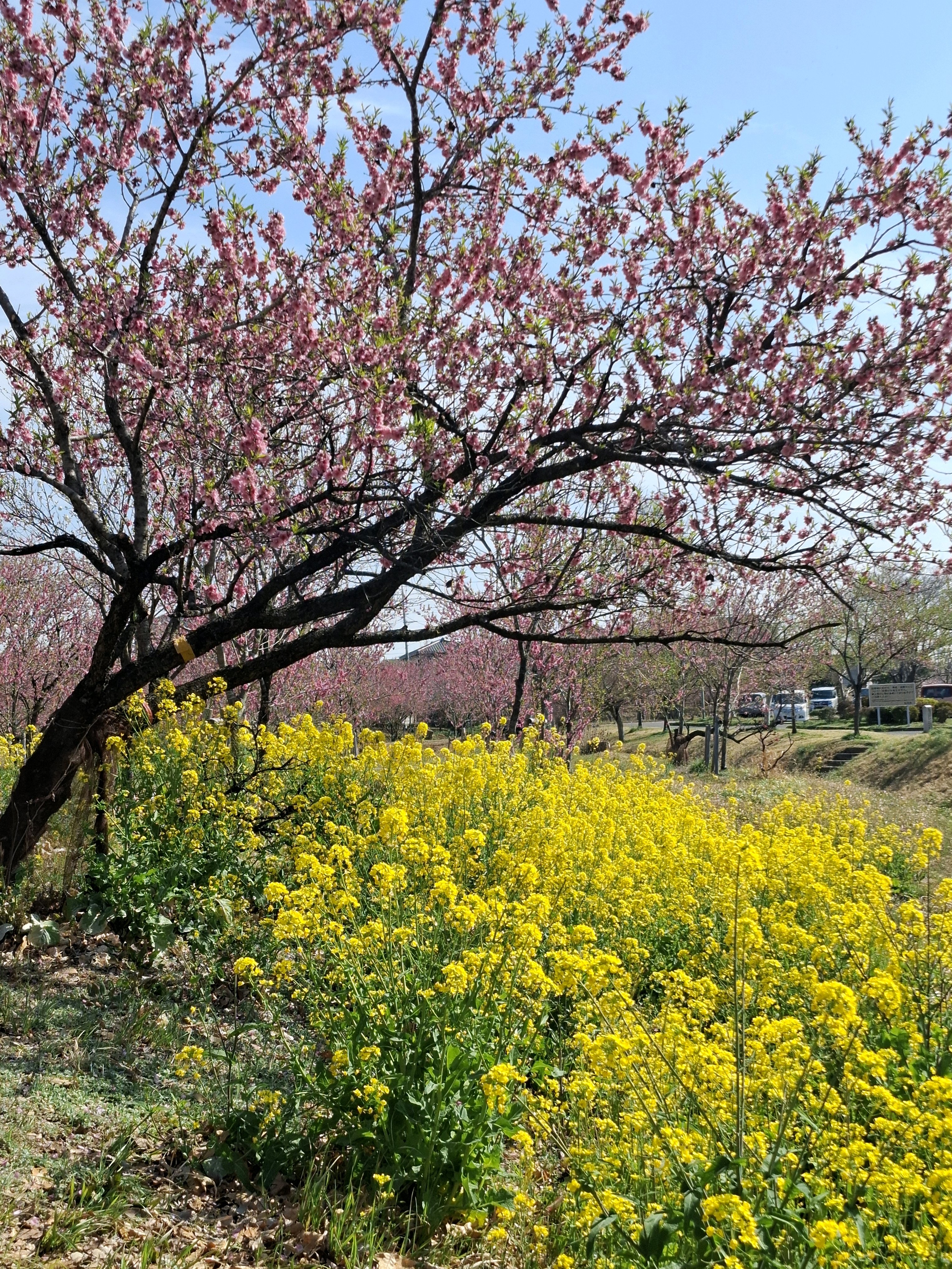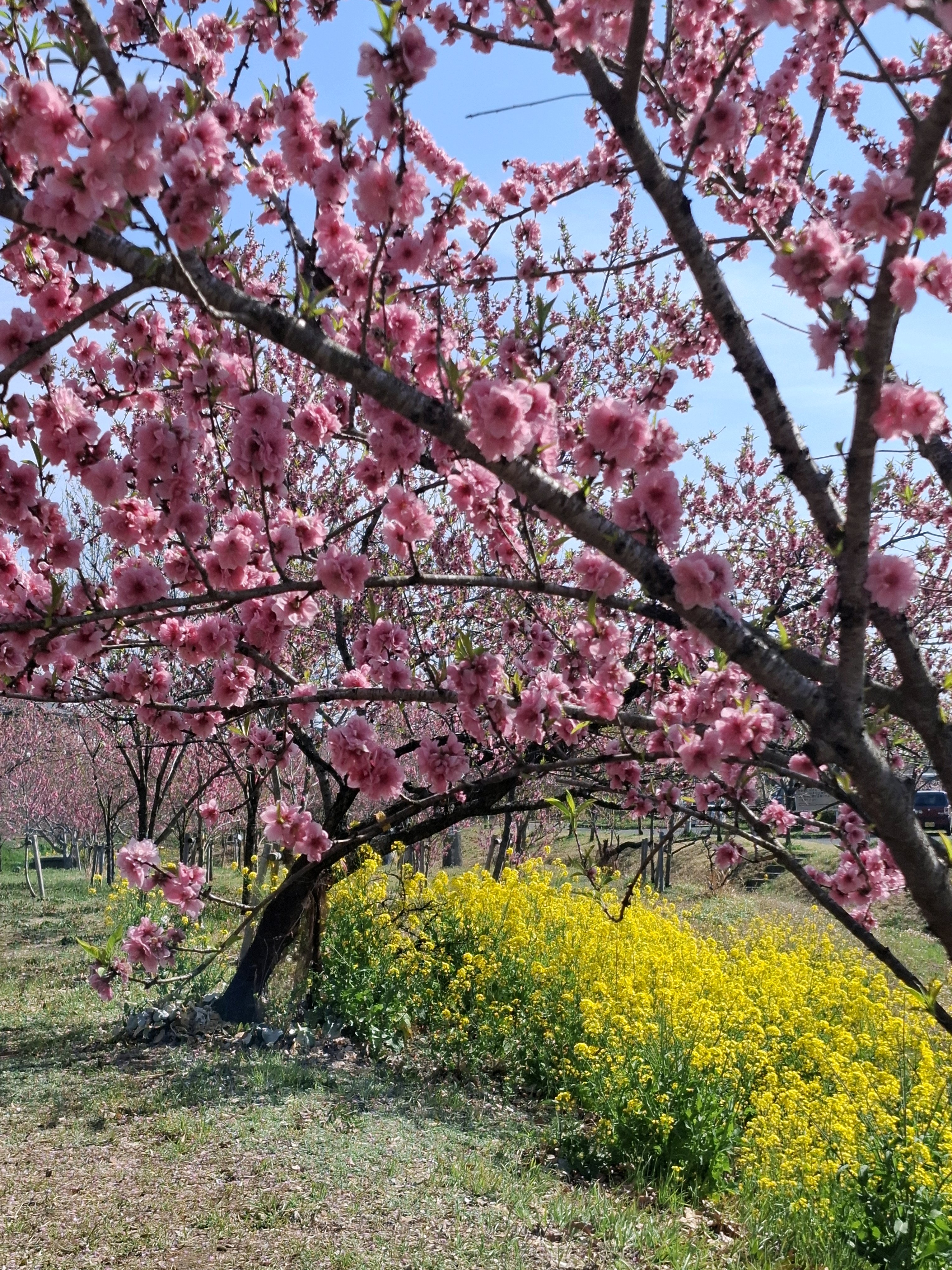 桃に菜の花、美しい✨。花の色も絞りや濃いピンク~白っぽいものまで色々あって綺麗😍