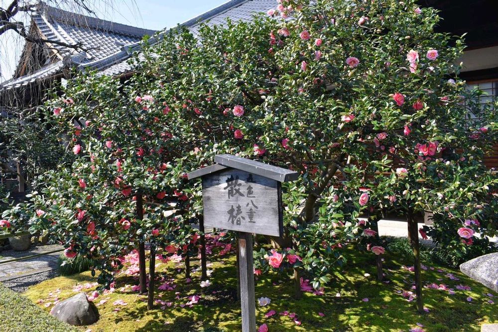 近くの北野天満宮のお茶会の際、豊臣秀吉が献木したと伝わる『五色八重散椿』