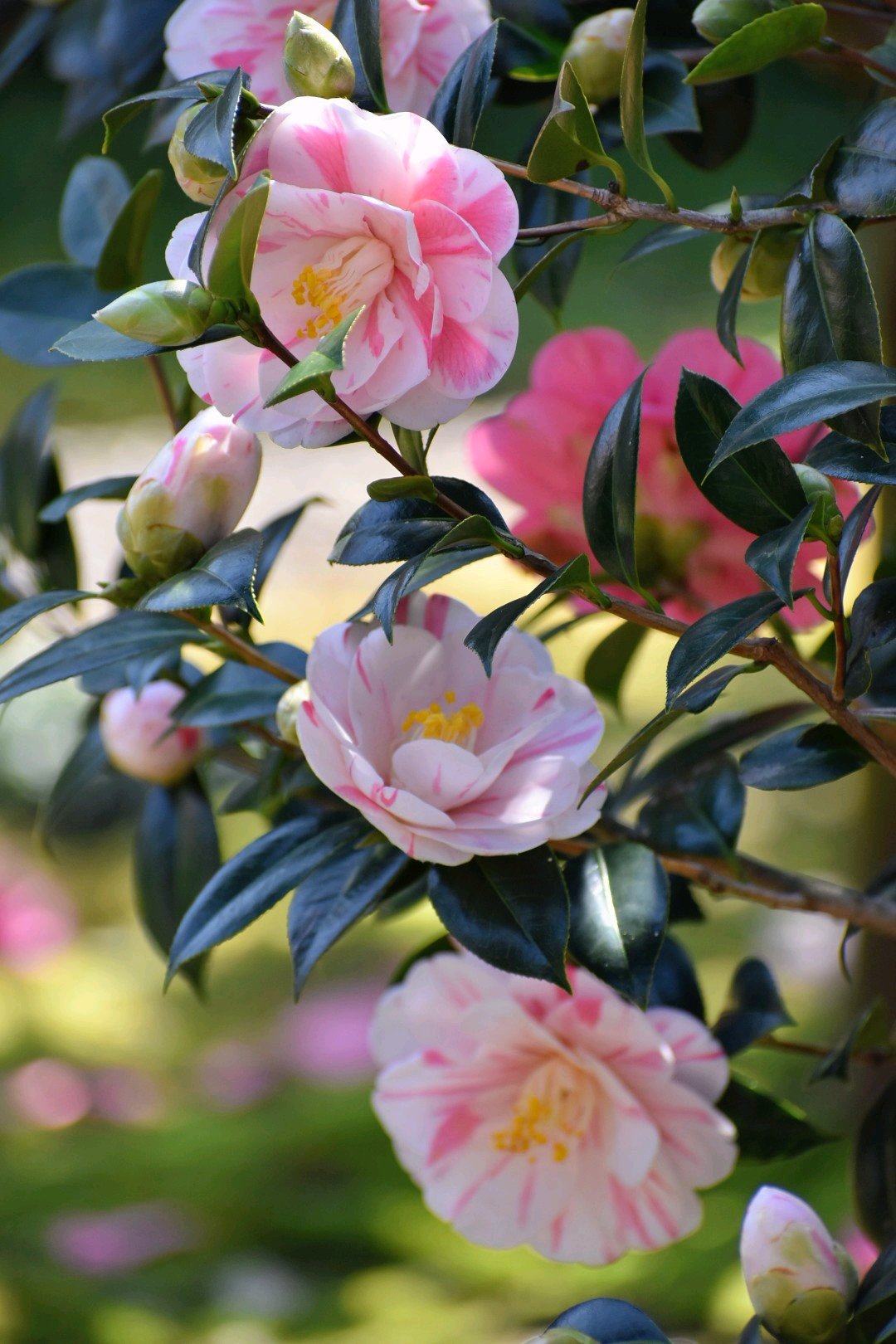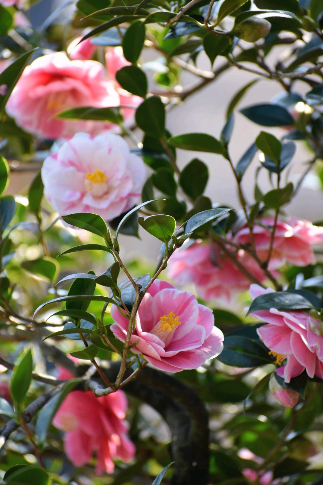 1本の木から色とりどりの椿が…