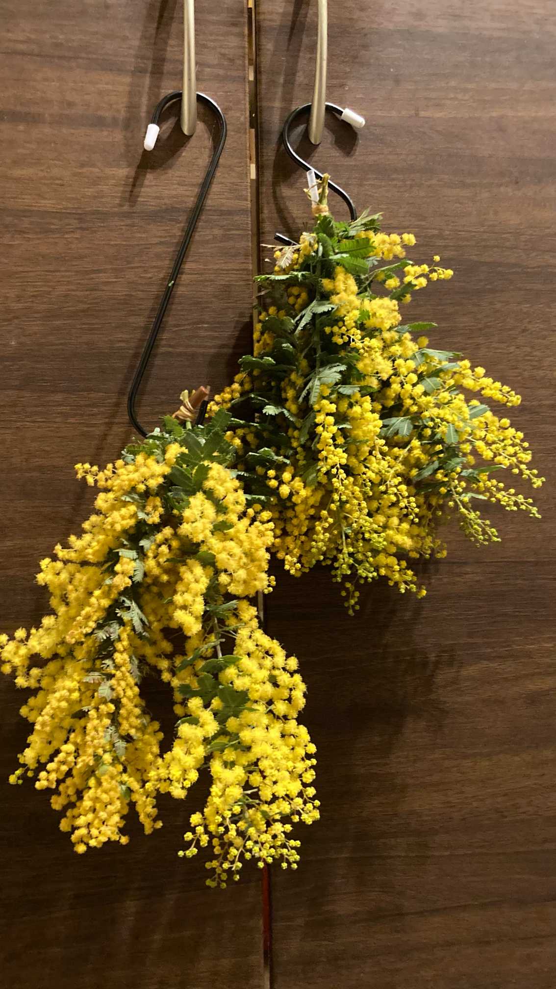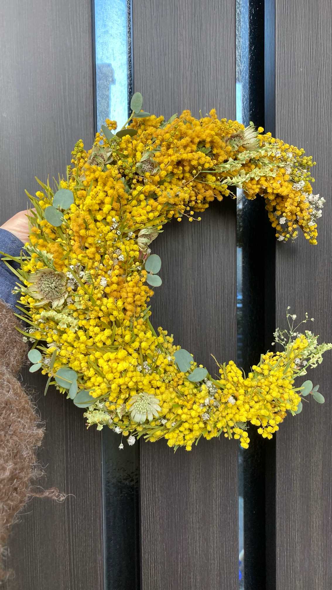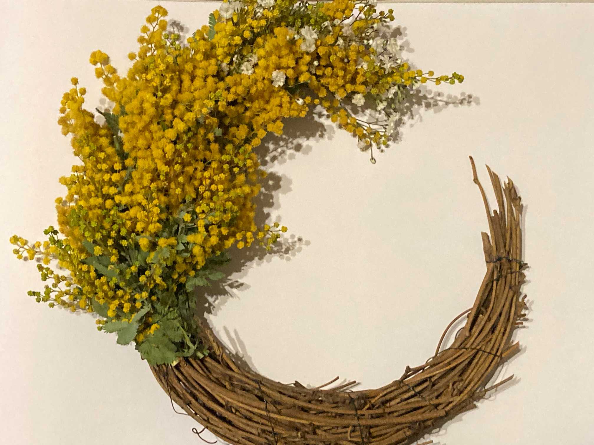 さて、このミモザリース、可愛いけど少しの衝撃でめっちゃミモザポロポロしちゃいます😭玄関ドアは危険な予感⚠️