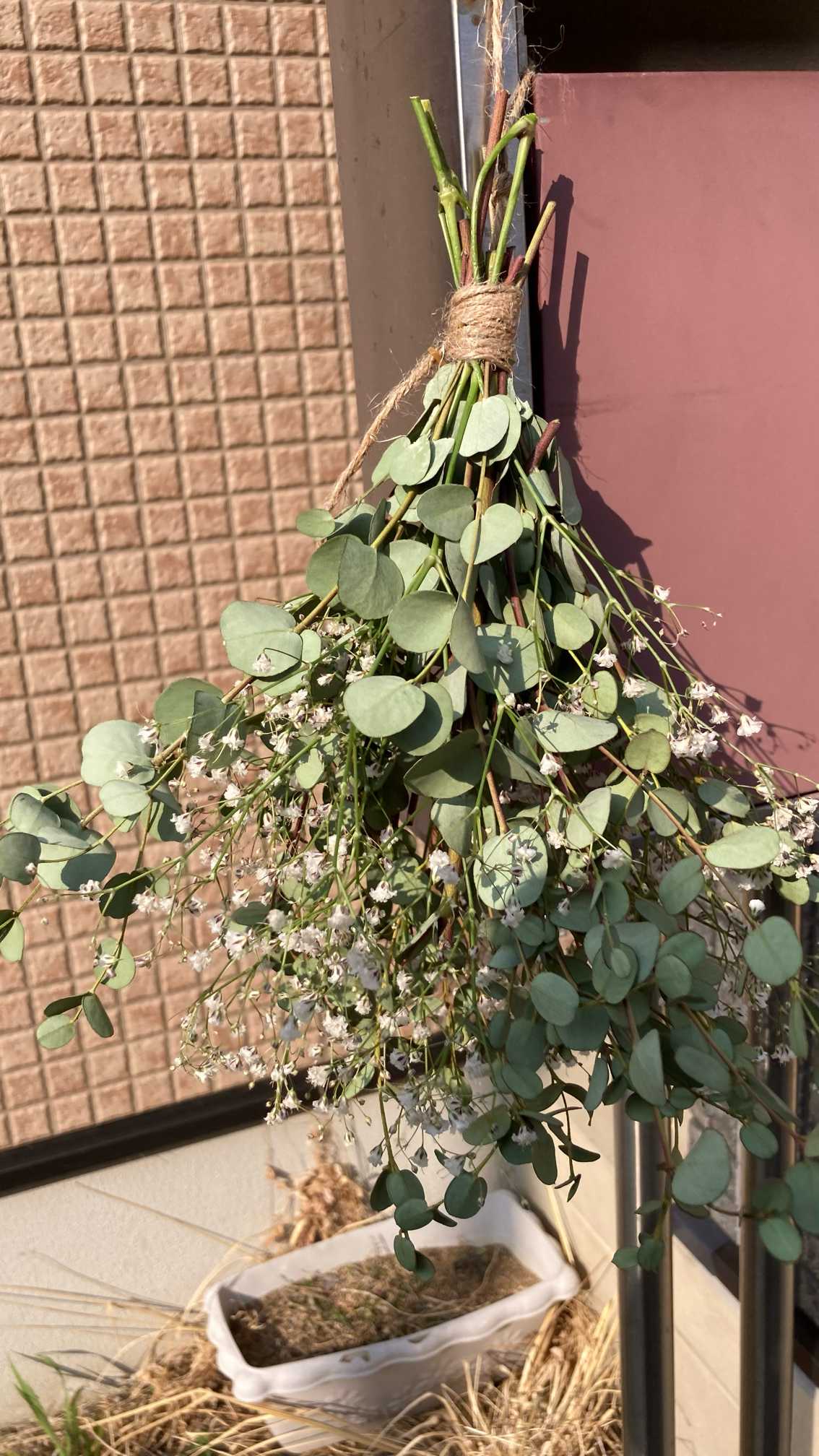 ユーカリをつけました。本当は一緒に巻きつける予定だったのですが、手配ミスで完成後に届いたのでボンドで後付けしました。