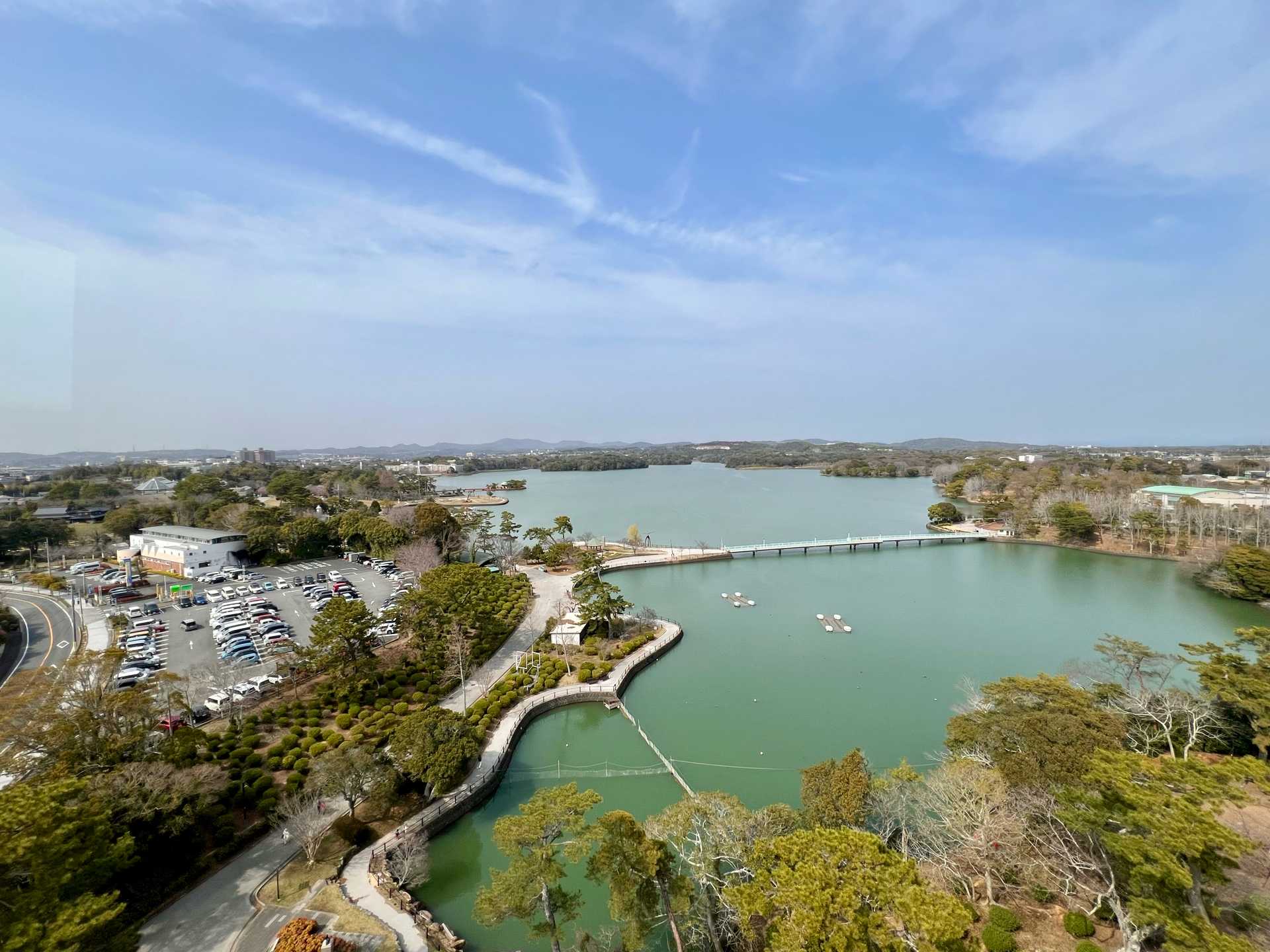 駐車券にときわ公園のシンボル、ペリカンの絵。駐車場は湖を見下ろす丘にあり、緩やかに下って行きます。