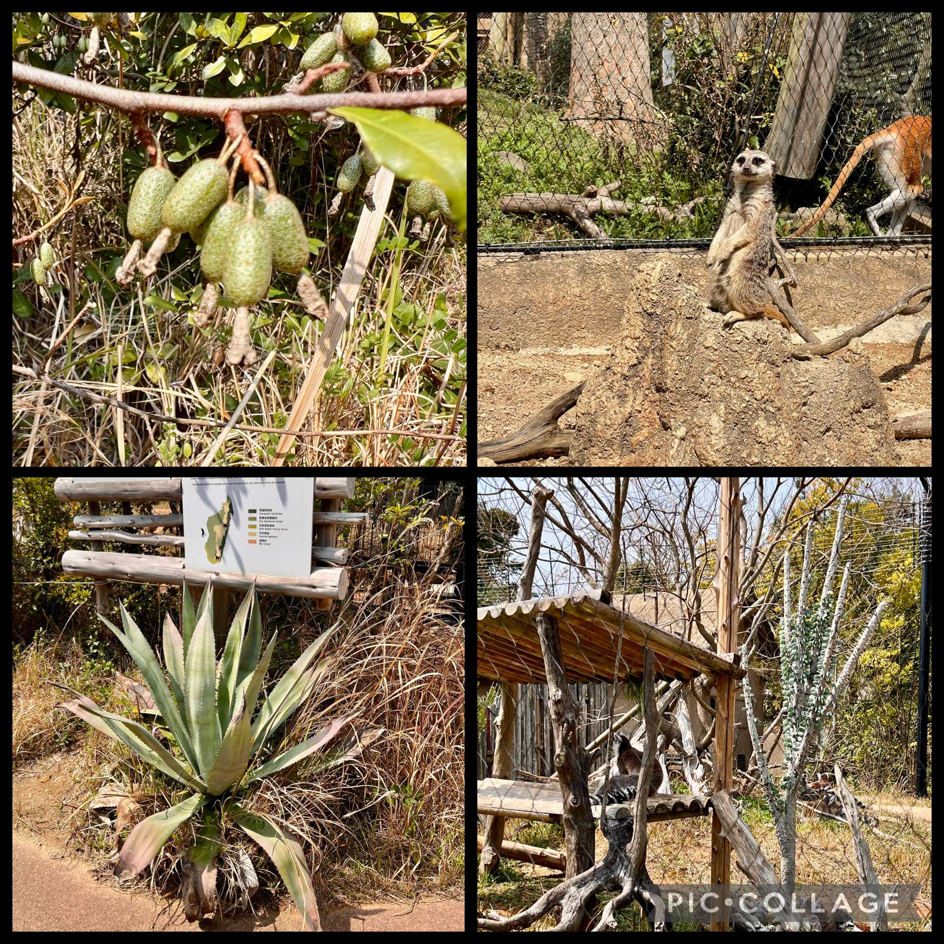 左上から時計回りにグミ、ミーアキャットさん、ワオキツネザルさんとアローディア、カッコいいアガベ。