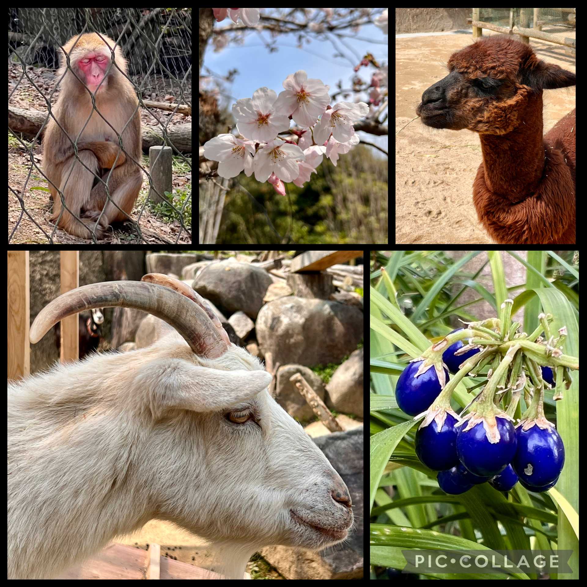 同じ順で、たそがれるニホンザル、桜満開🌸、アルパカさん、ジャノヒゲのラピスラズリ色の実、意外と怖い顔のヤギさん🐐