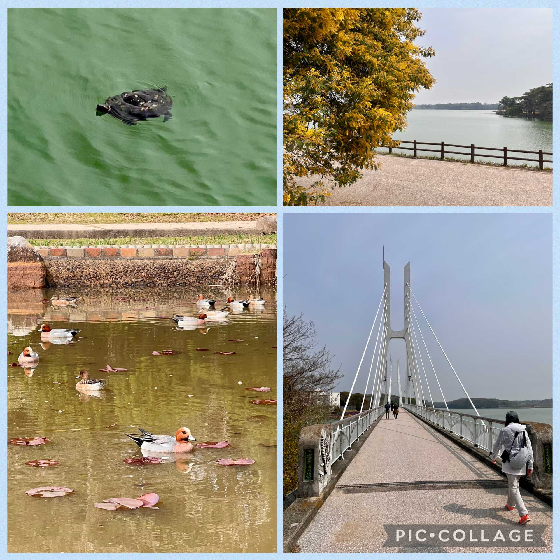 菖蒲園はまだ芽吹程度で鴨たちがのんびり。ミモザ咲く湖畔を白鳥大橋へ歩けば大きな亀が。