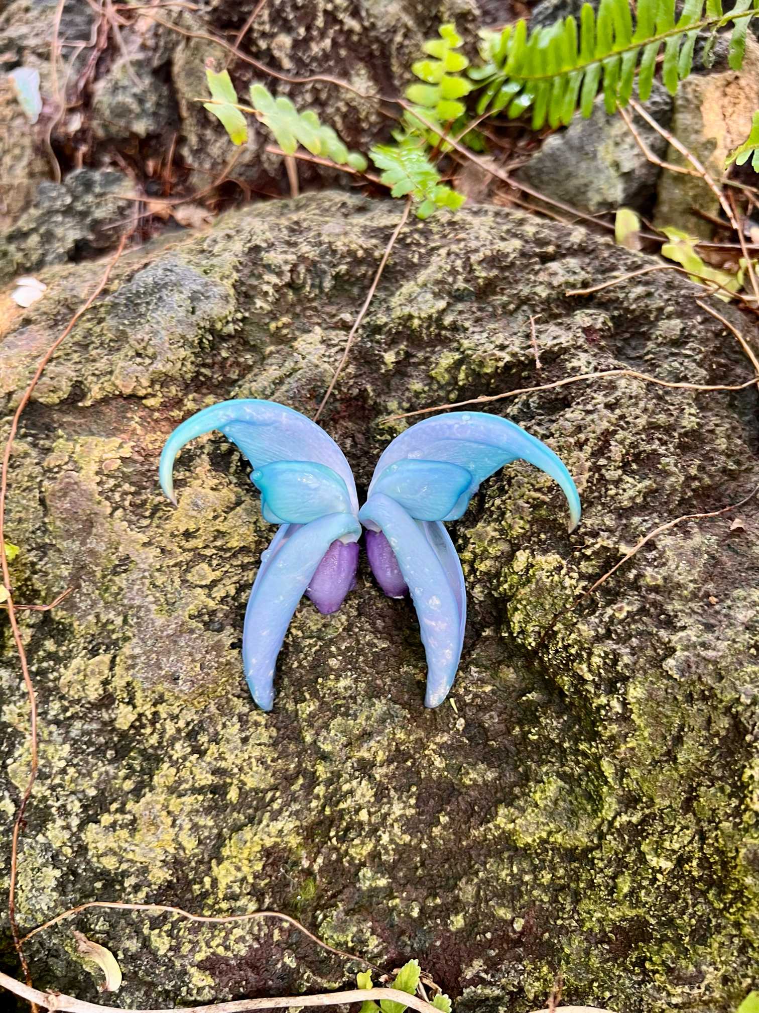 ヒスイカズラの落花。モルフォ蝶あるいはアレキサンドラトリバネアゲハ🦋