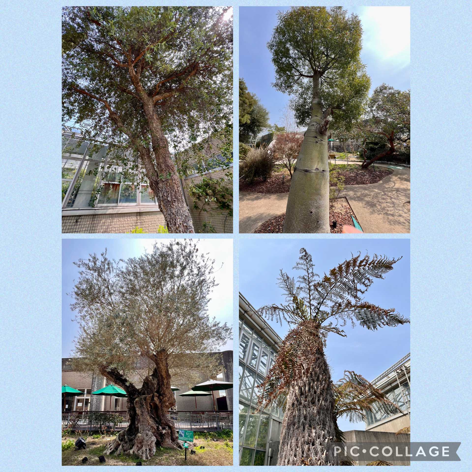 戸外の素晴らしい樹木たち。ブラキキトン(ボトルツリー)、ヒカゲヘゴ、オリーブ、コルクガシ。