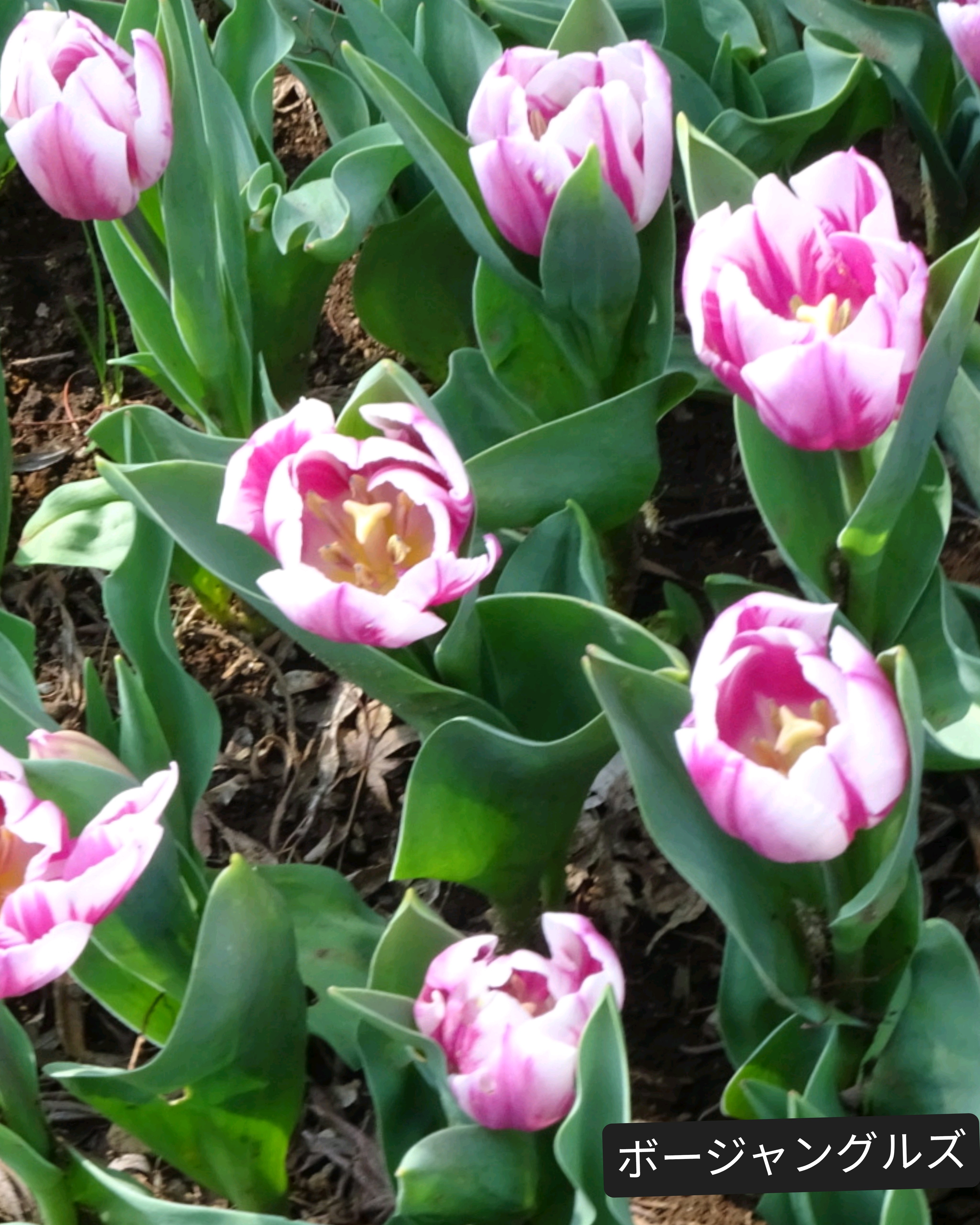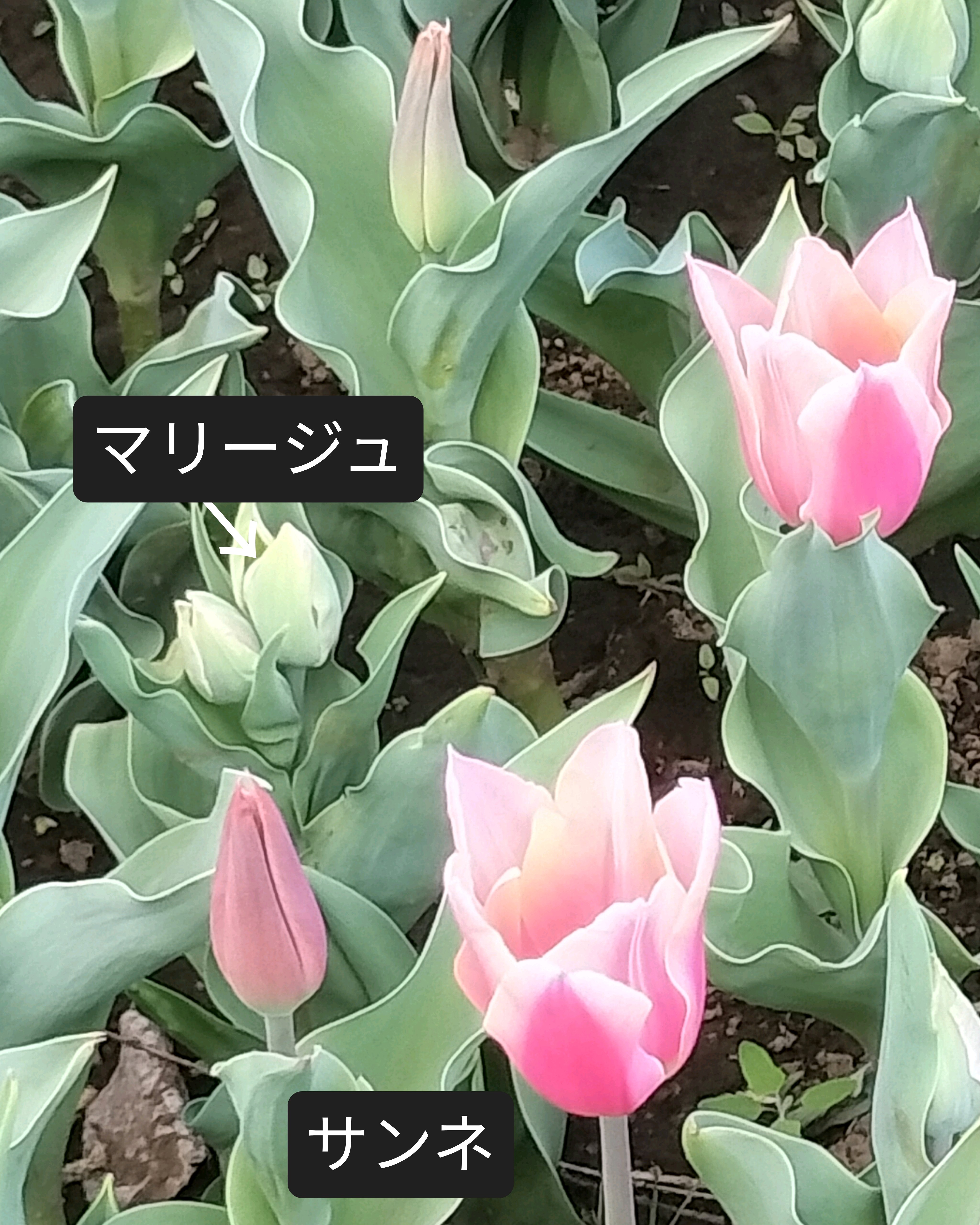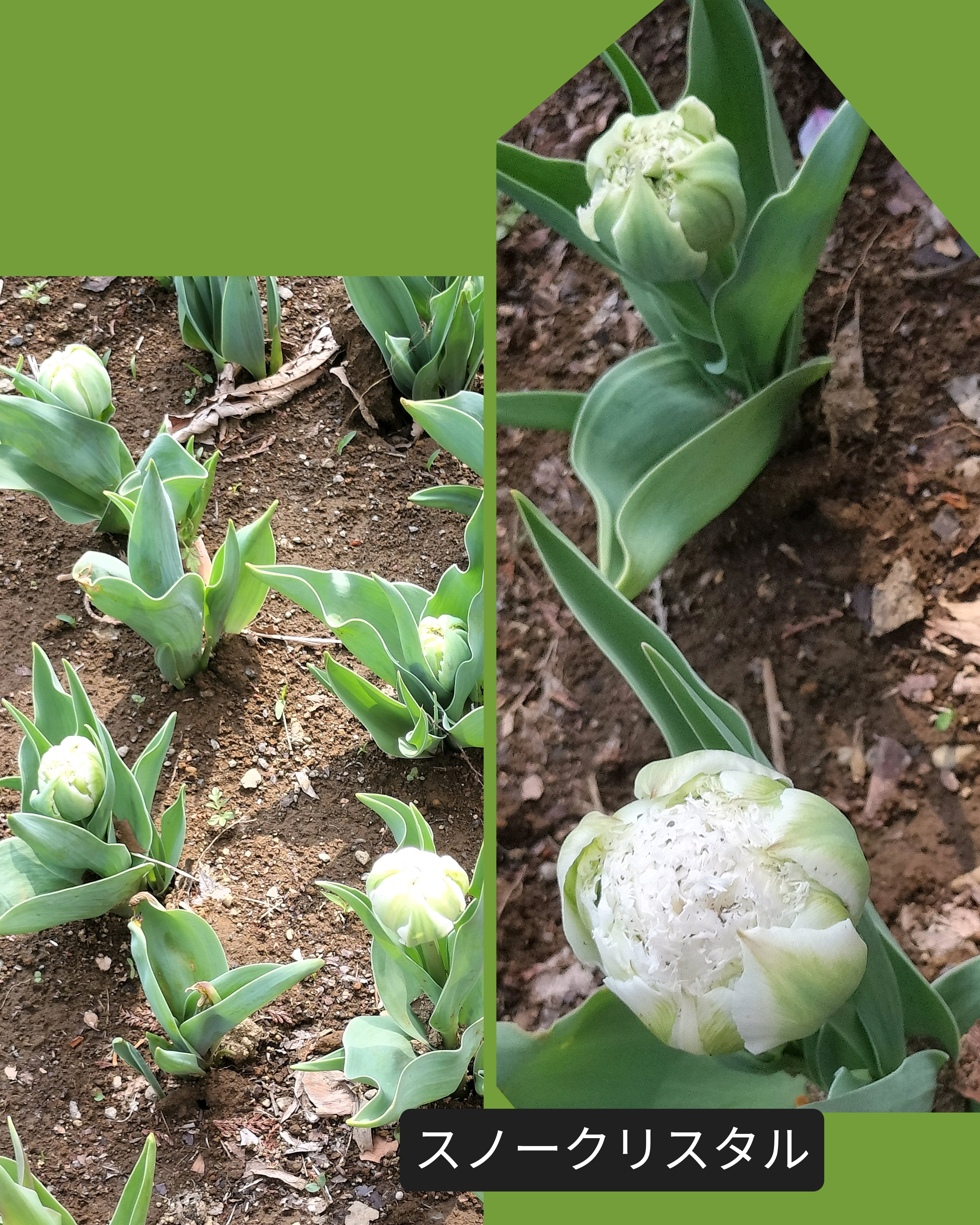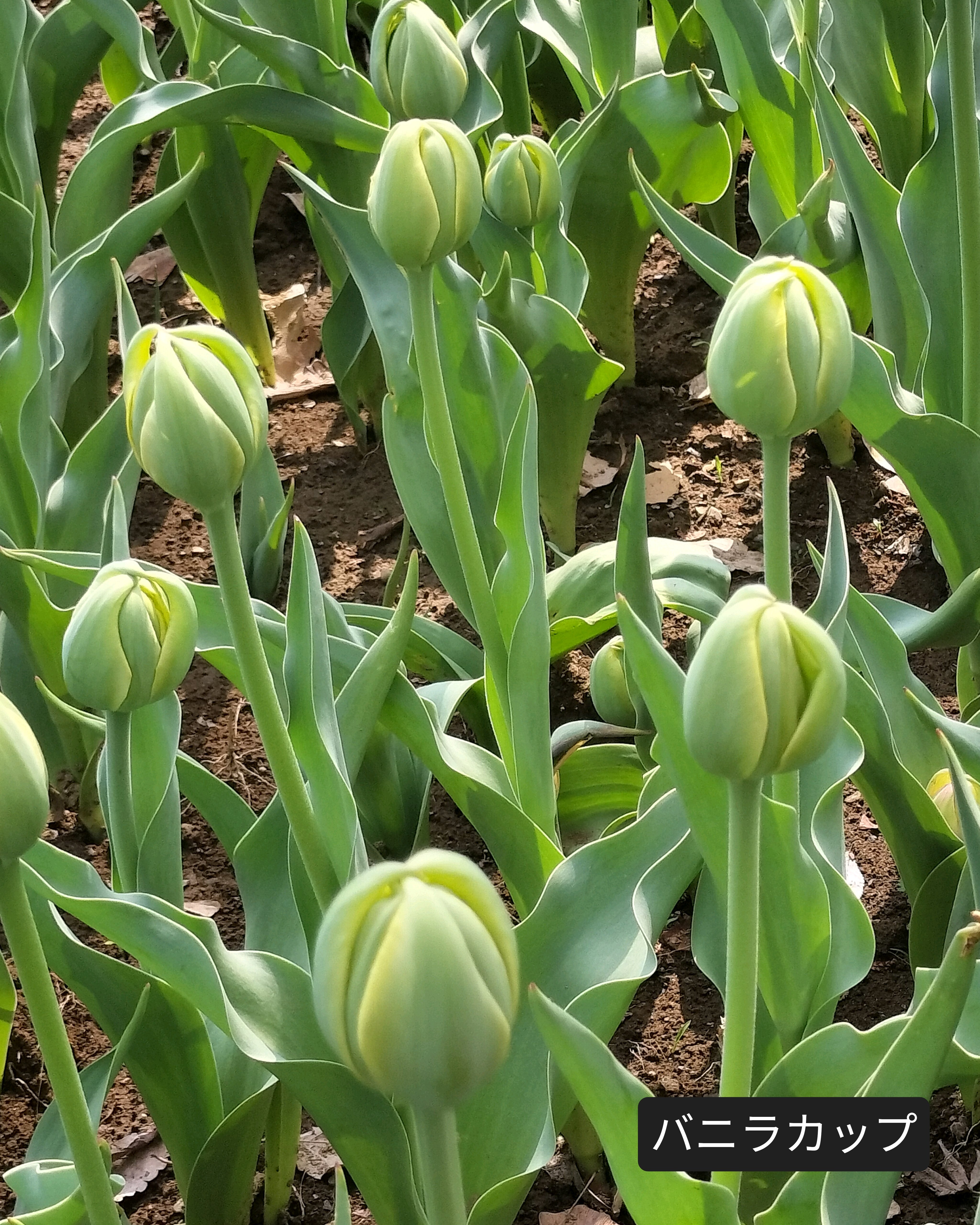 まだ咲いてない花を名札から調べたキャンディクラブは遅咲きの白い枝咲きチューリップで花弁の縁に赤が入るピコティタイプでした👀!!