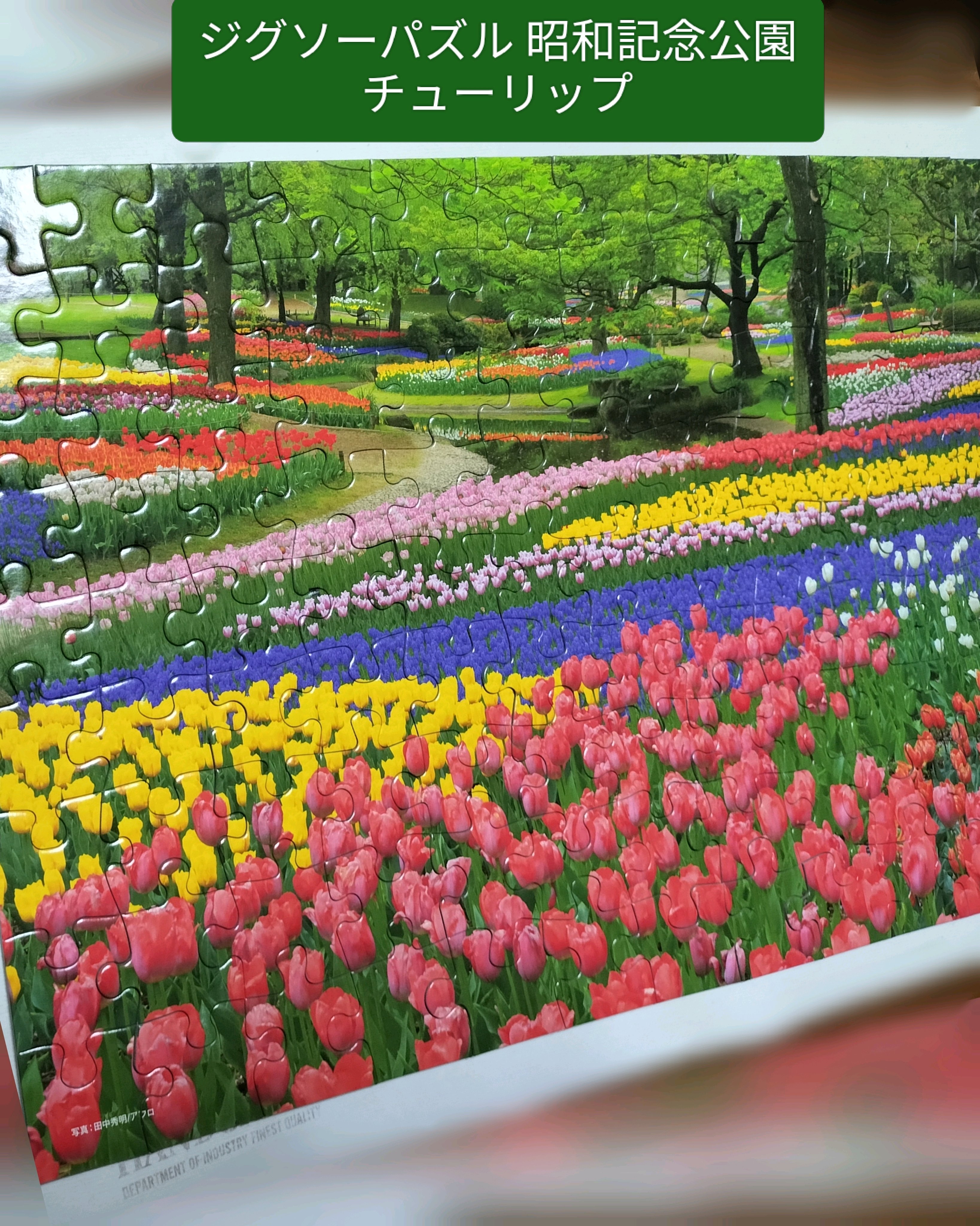 クリスマスに自分にご褒美の1000ピースのジグソーパズルには、昭和記念公園のチューリップが描かれてます