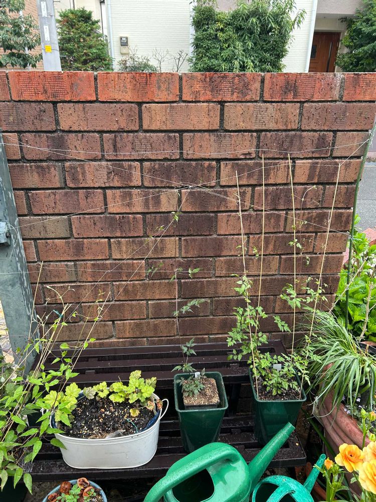 白いフェンスのみに使用してましたが西陽が強くレンガ塀にテグスを這わせてみる事に身してみました😊