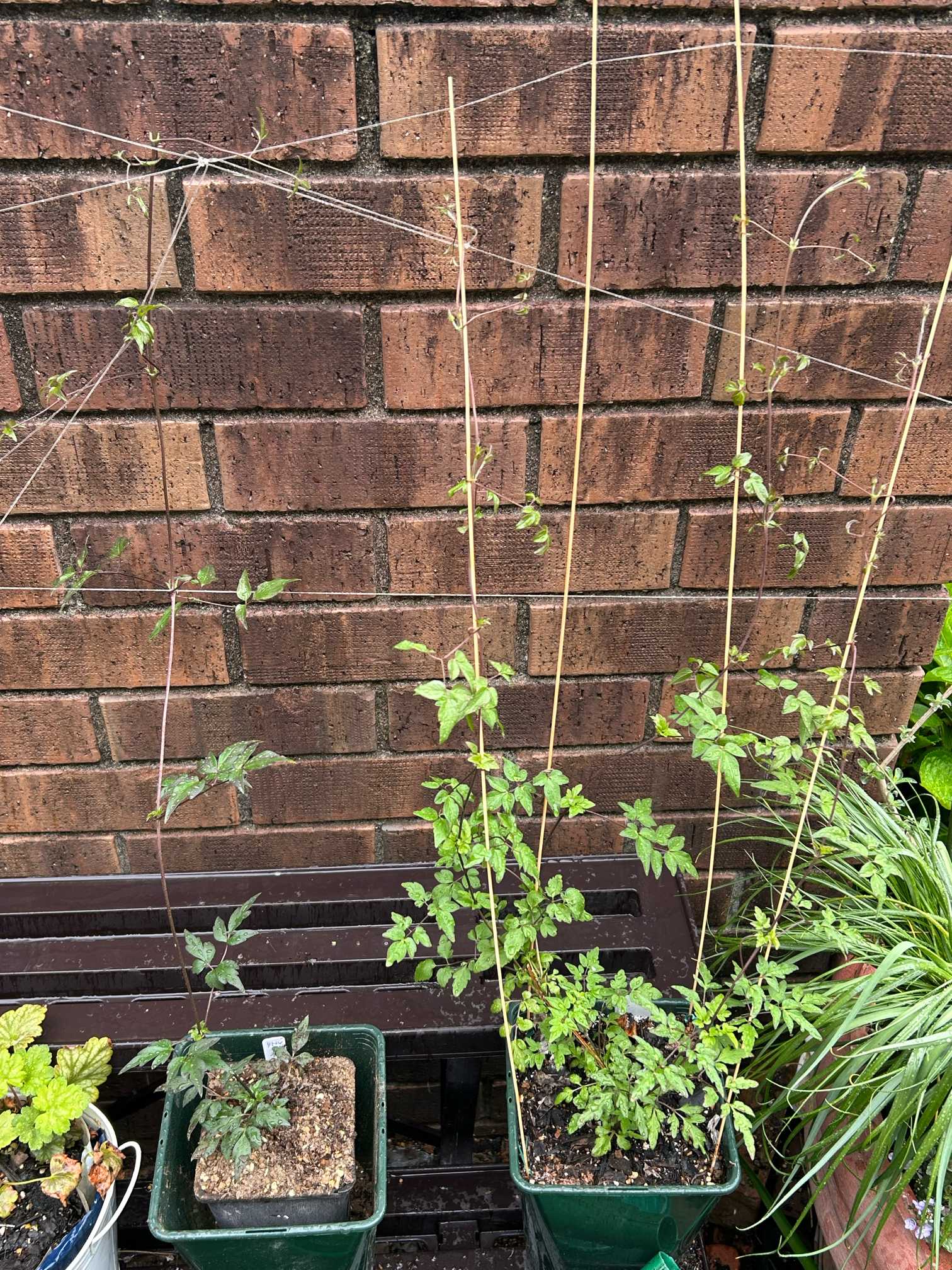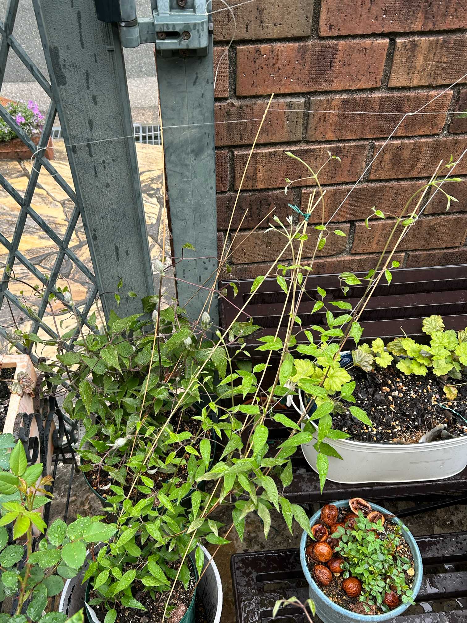 クレマチスの誘引をテグスでレンガ塀に這わしてみる挑戦です。フェンスはお高いし増やしたくないしで考えついたのがテグス誘引です😊
