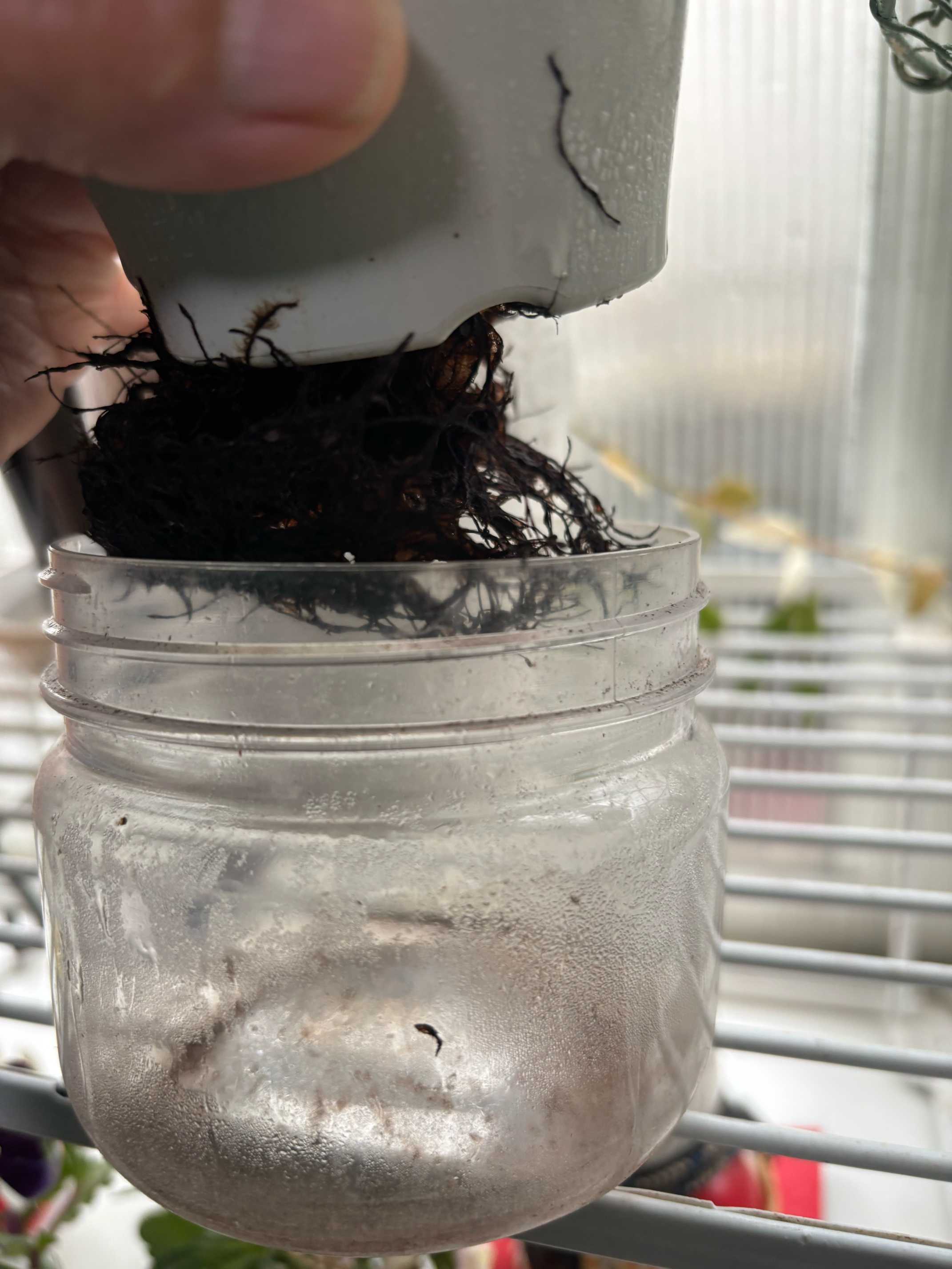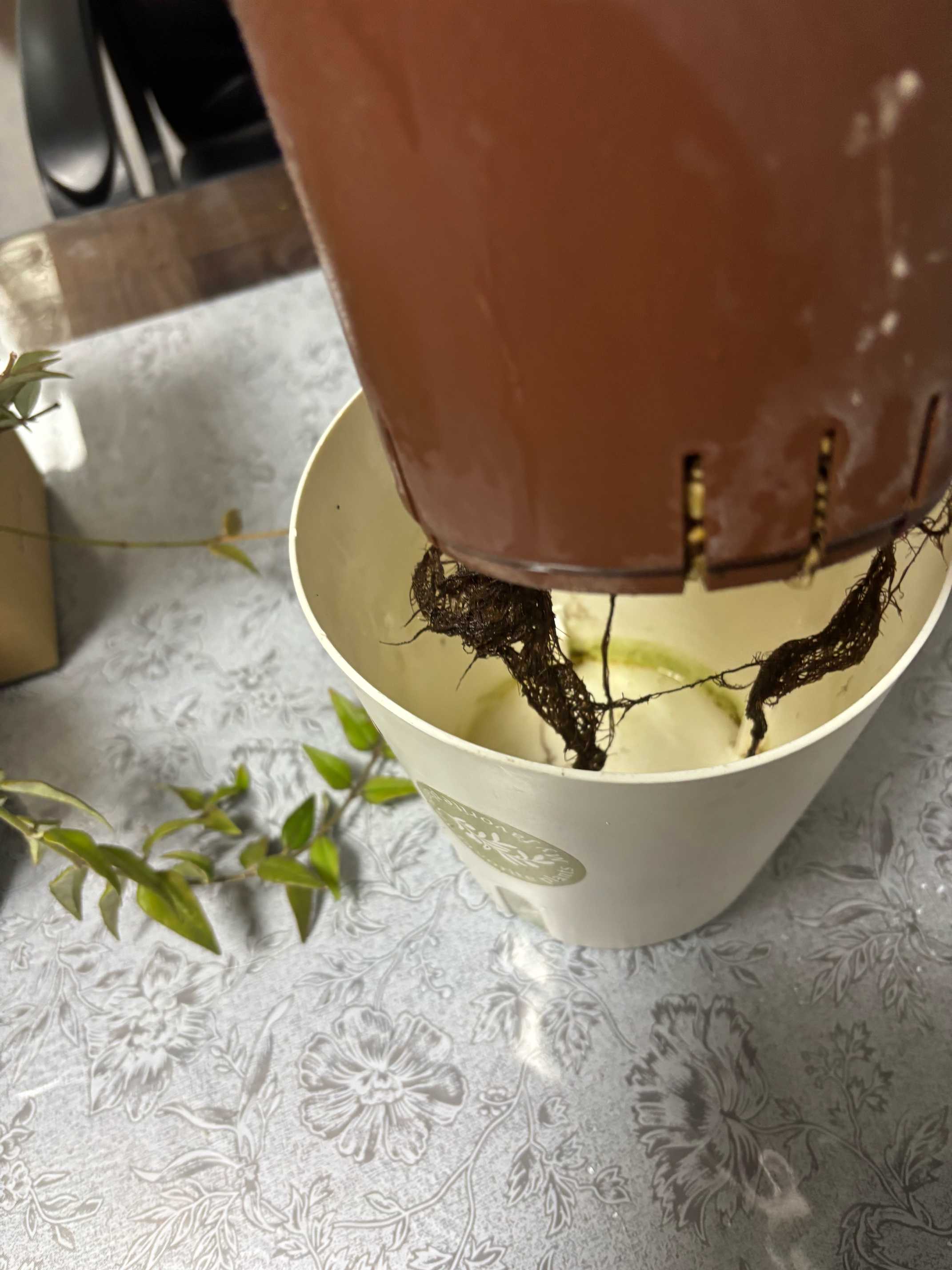 鉢がスポンと入るちょうどいい容器があったので、入れて下から水を吸わせるようにしました。そのうち根っこが出てきて、長年水耕栽培になってます(8年位)