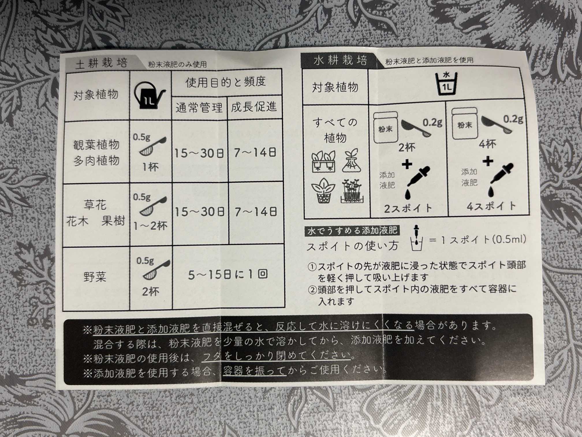 ⚠️混合する場合は、①粉末液肥を②少量の水で溶かしてから③添加液肥を加える。