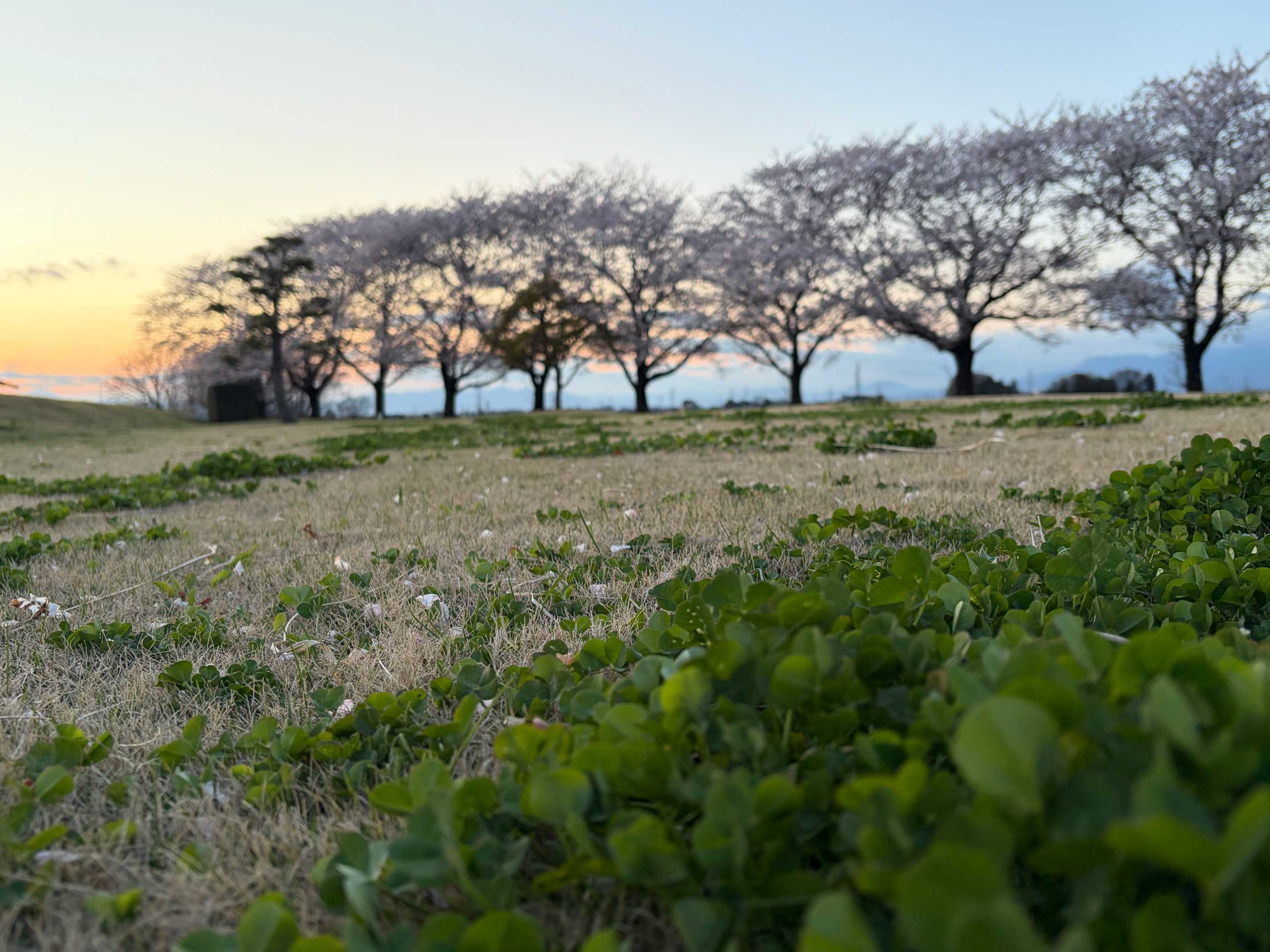 這いつくばってクローバー🍀越しのサクラ🌸、最高🙌。