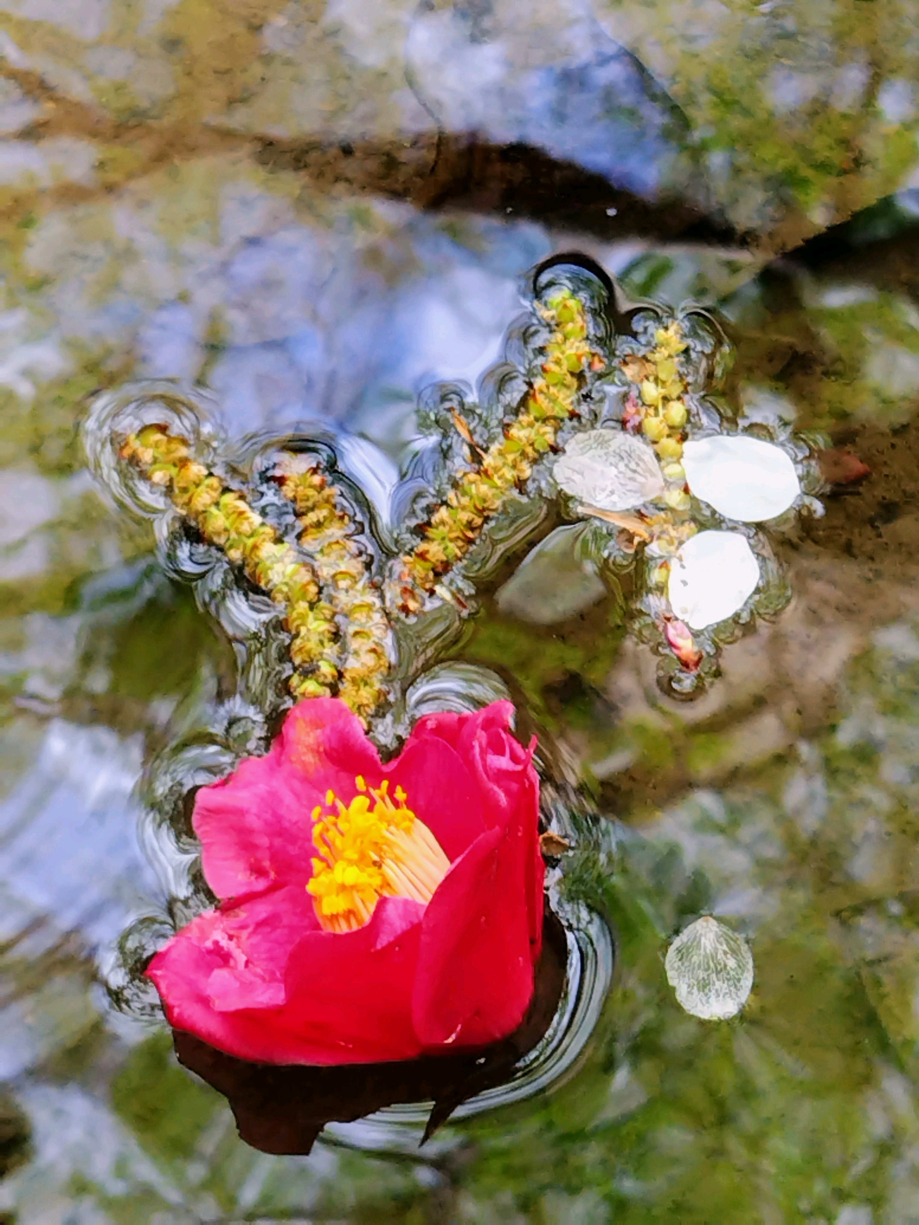 落ち椿と水面にうっすら空…