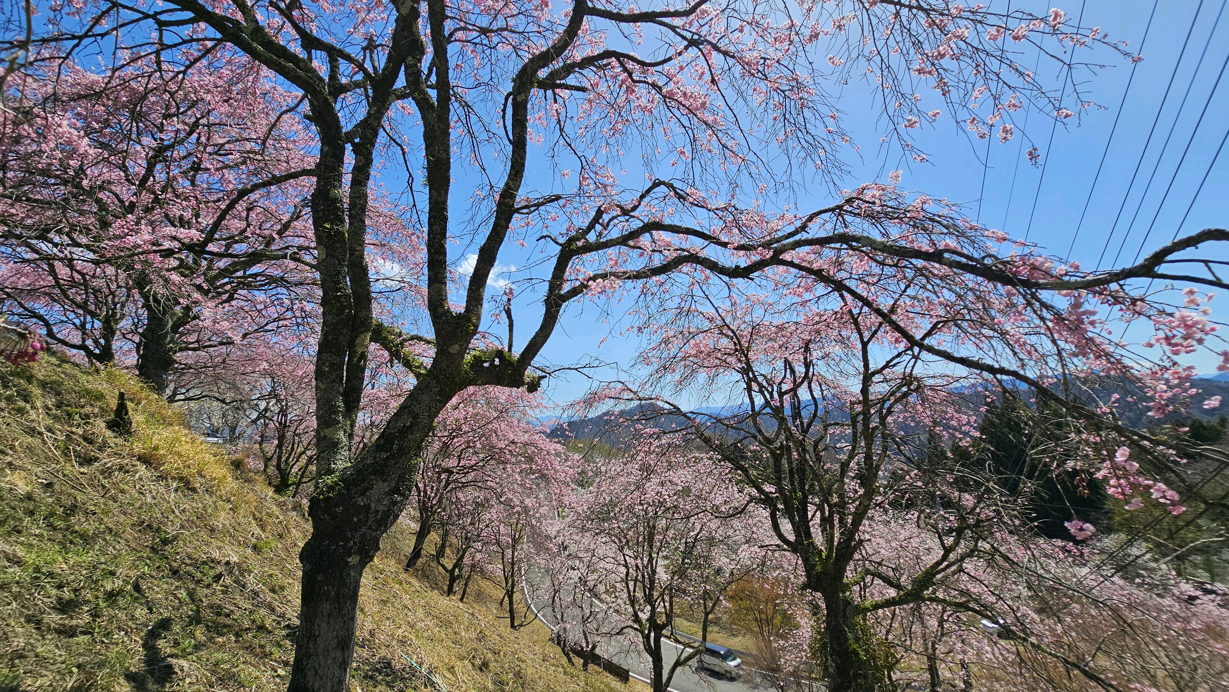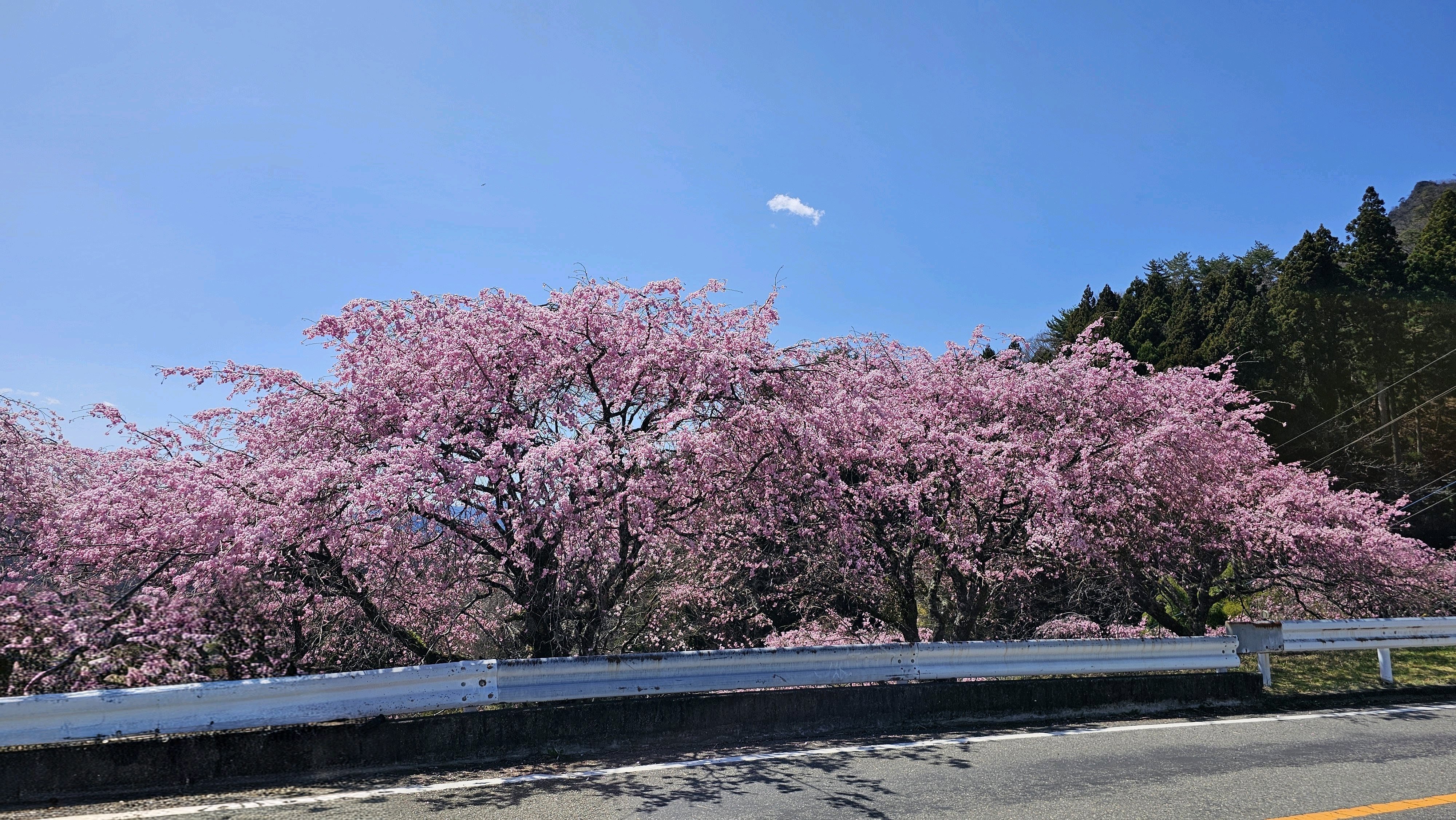 神社前の通り沿いに咲く桜残念ながら近くには行けず名前もわかりませんが綺麗でした