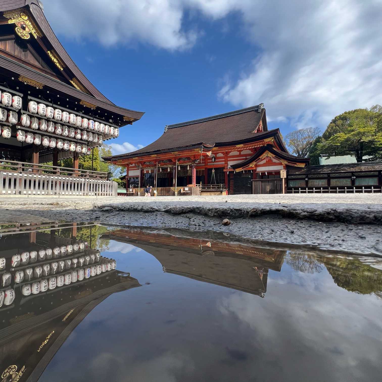 朝の境内の水たまりに