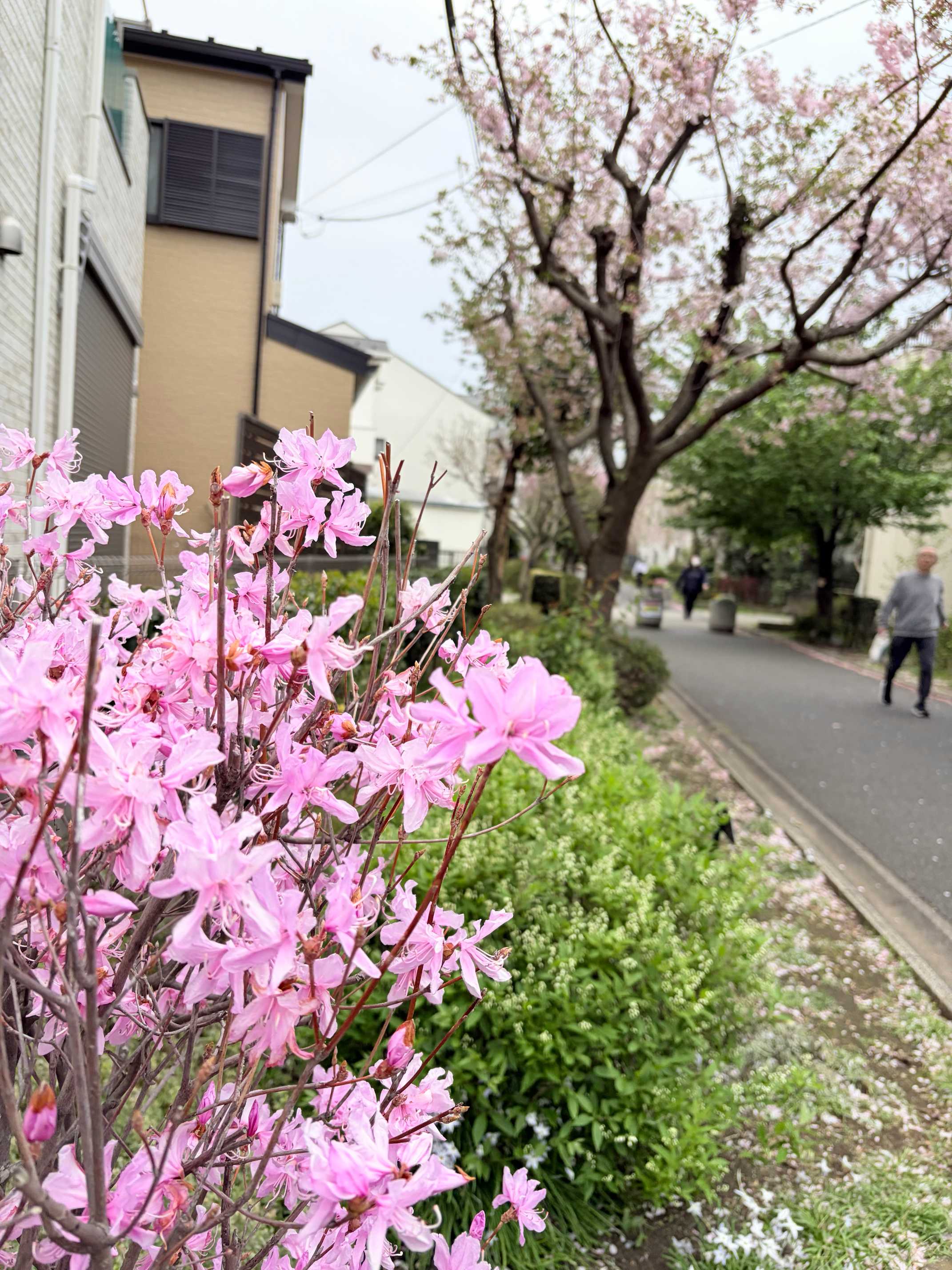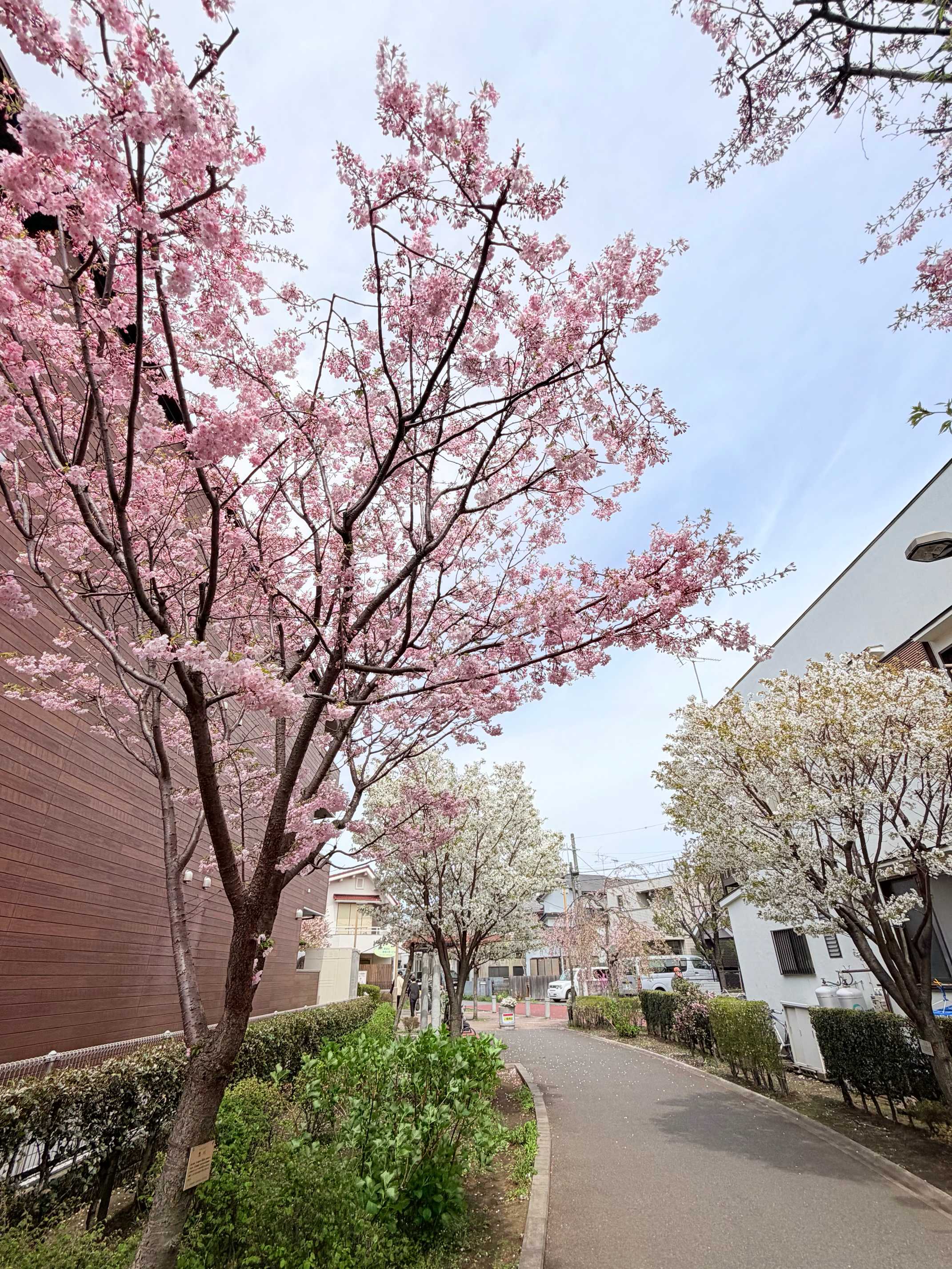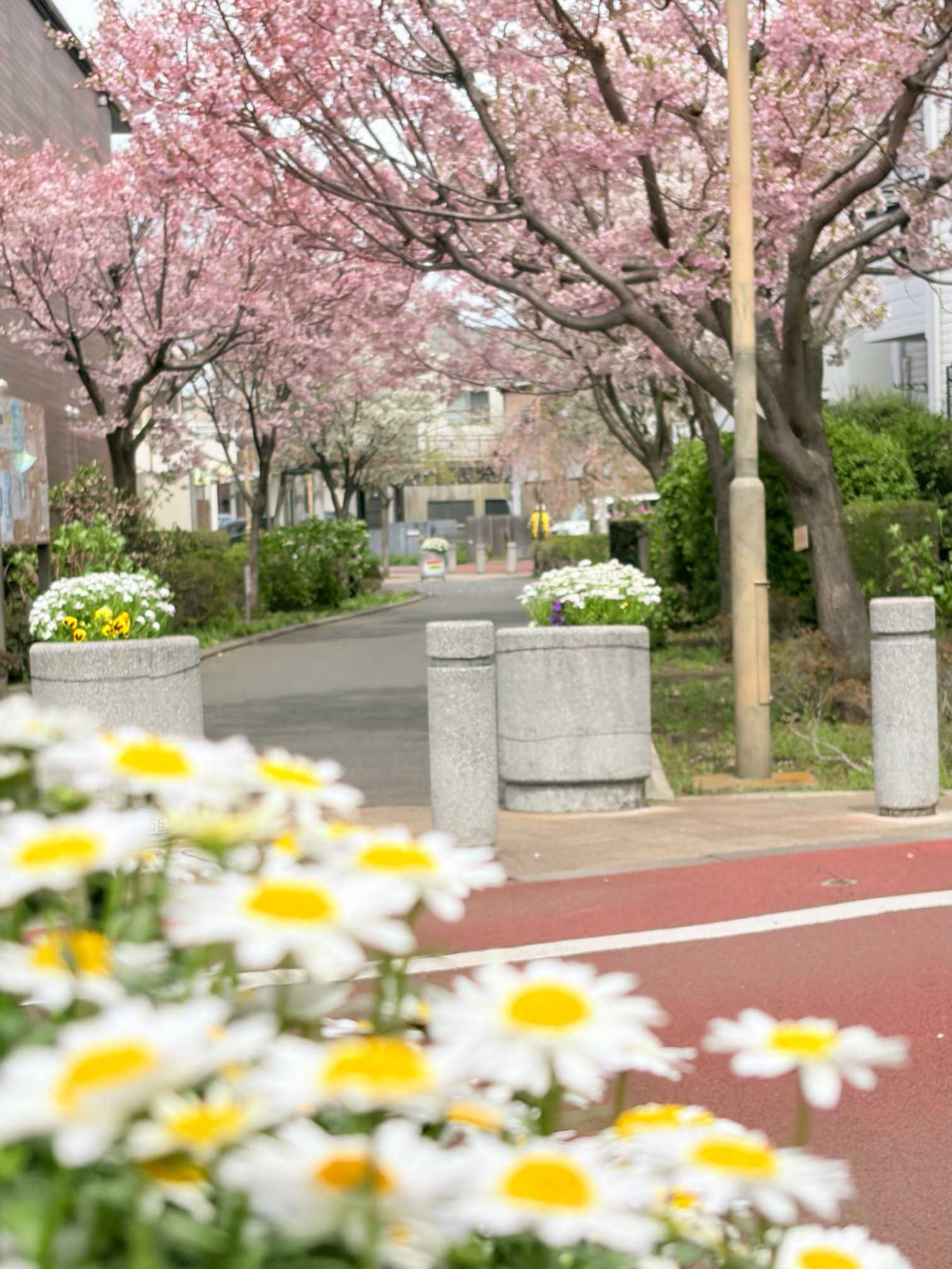 「仲よし小道」は遊歩道となっていて、桜の並木と、花壇にも春のお花が可愛らしく咲いてます