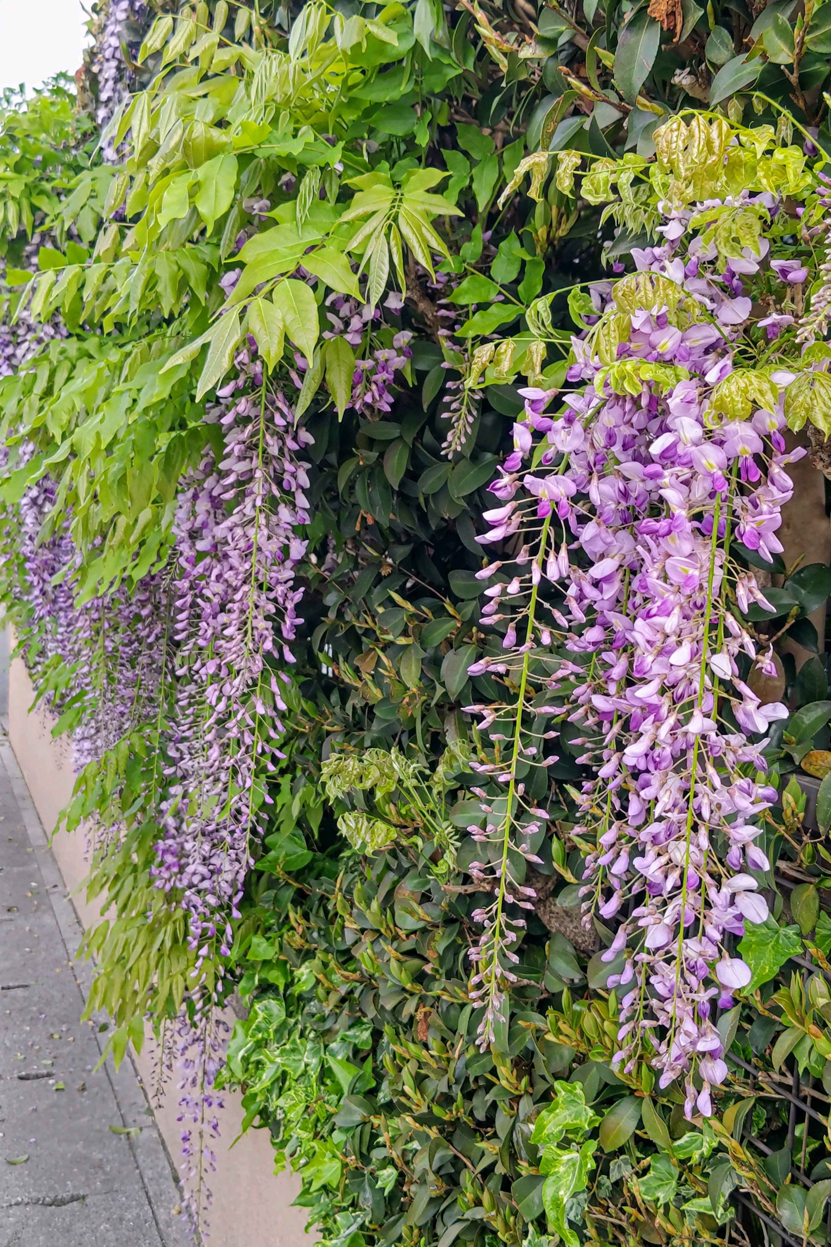 垣根仕立てのフジって珍しいですね。花も見やすくて良いですね。垣根には自分で巻き付いて止まってるのか⁉️人が止めてるのか⁉️気になります🤭
